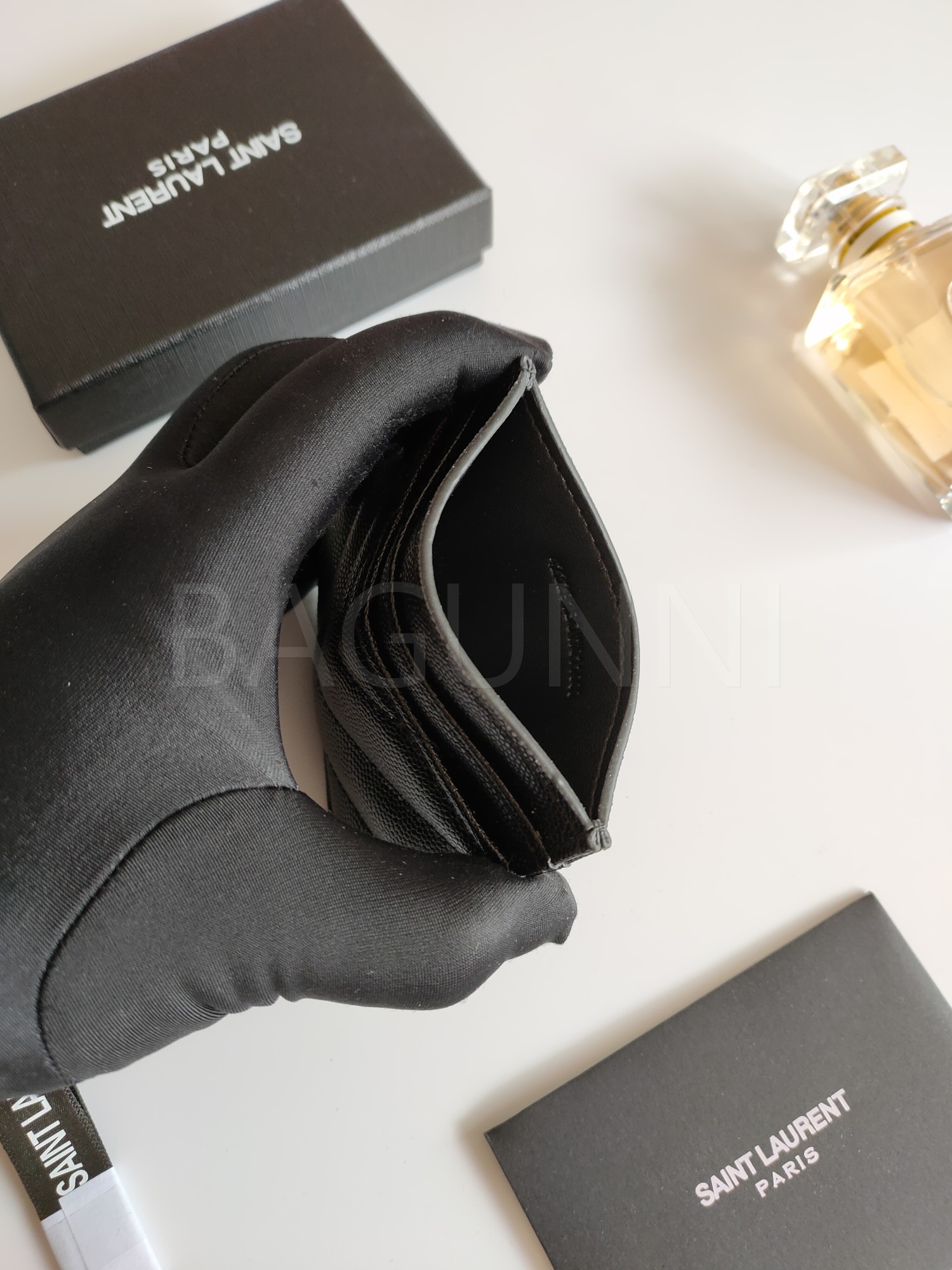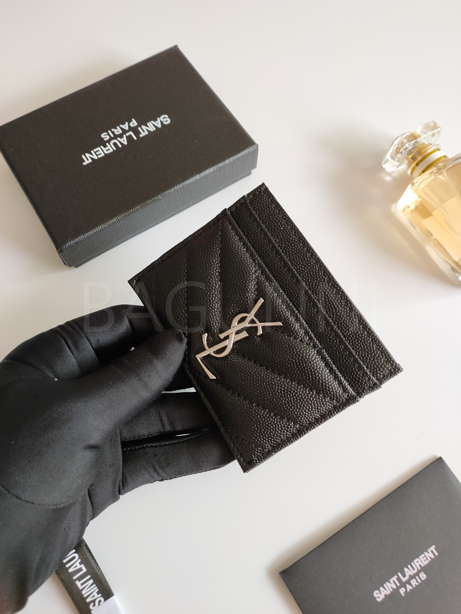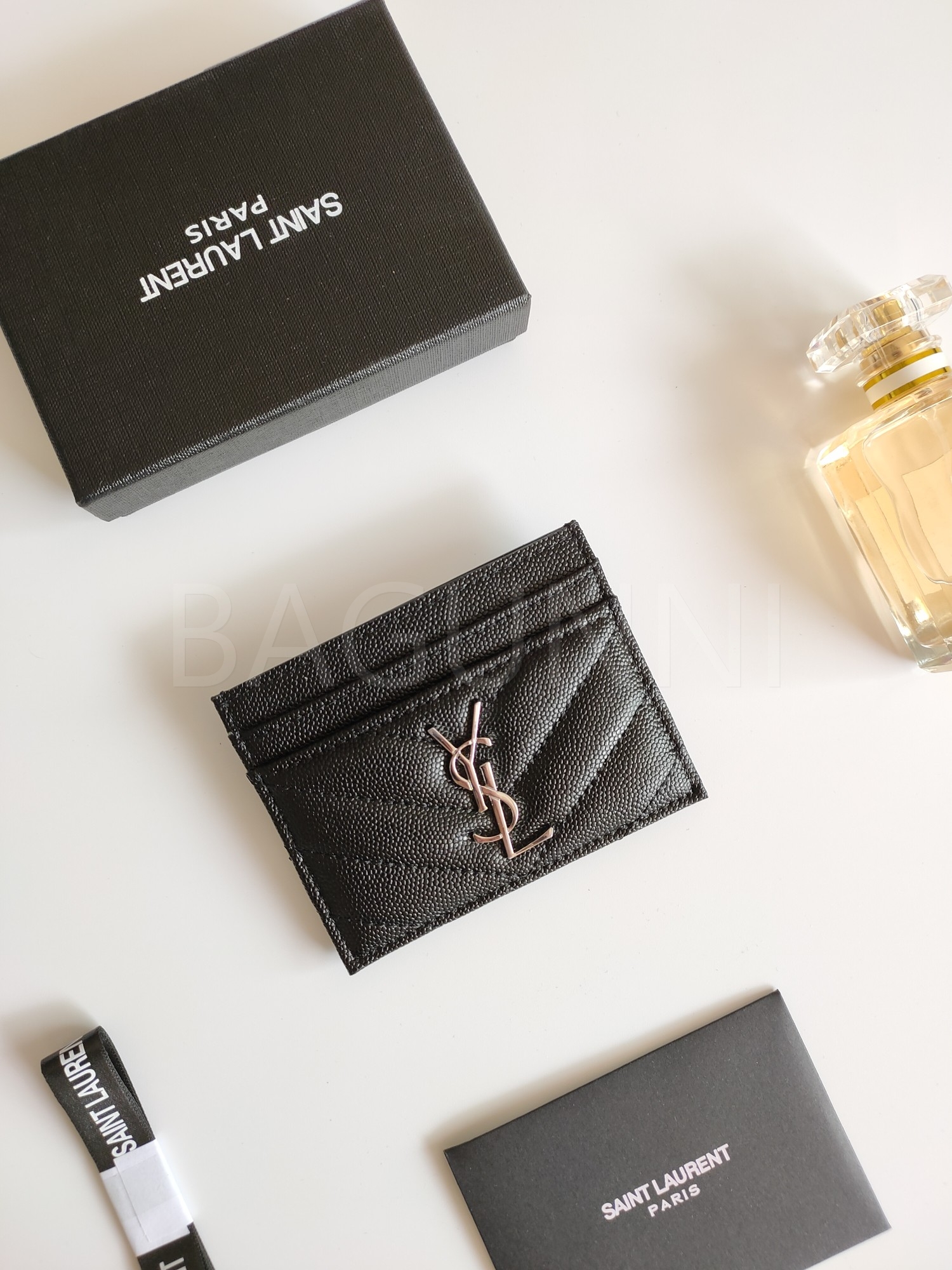 카프스킨의 질감이 돋보이는 YSL 플랩 카드지갑입니다.