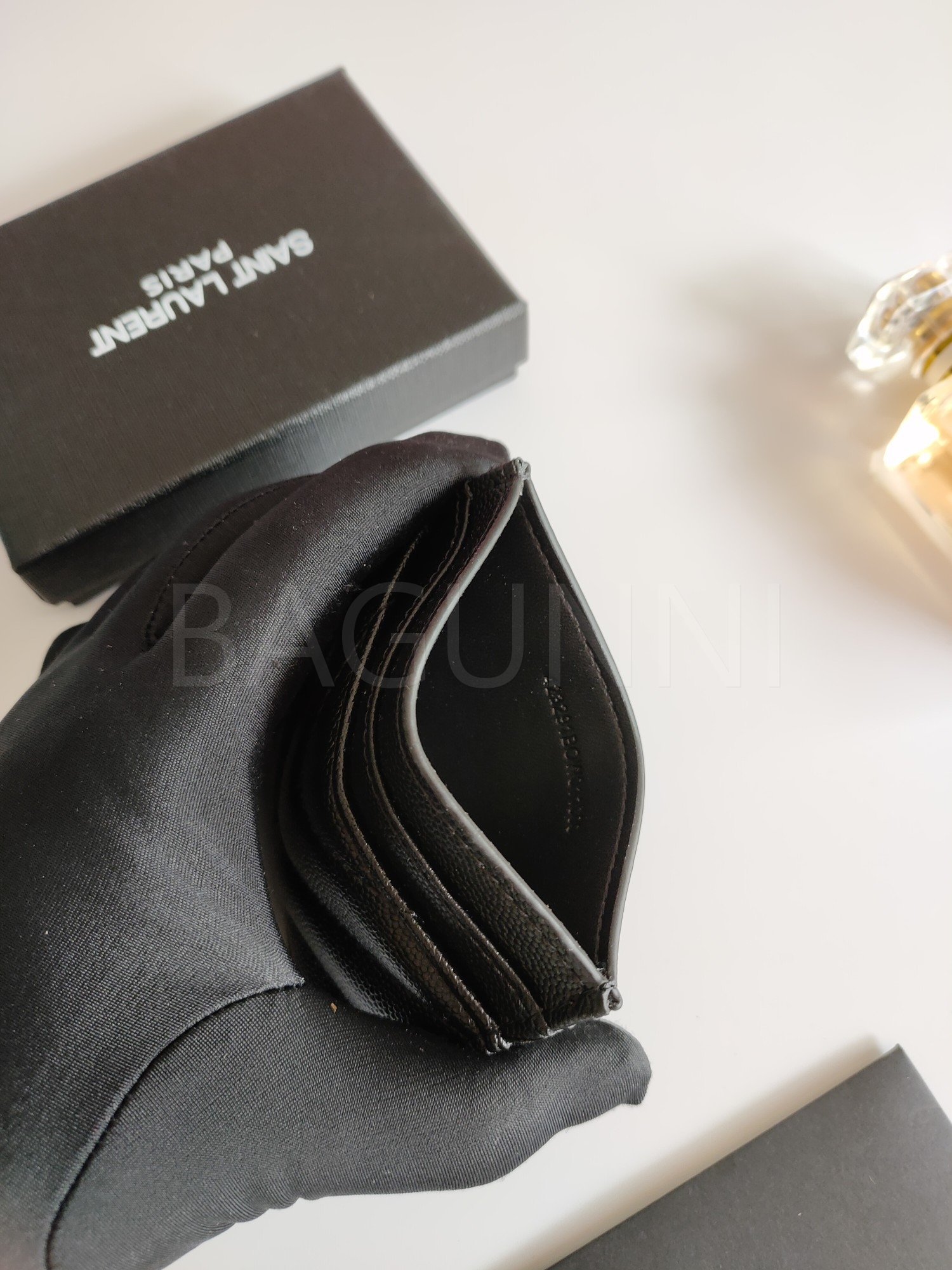 카프스킨의 질감이 돋보이는 YSL 플랩 카드지갑입니다.