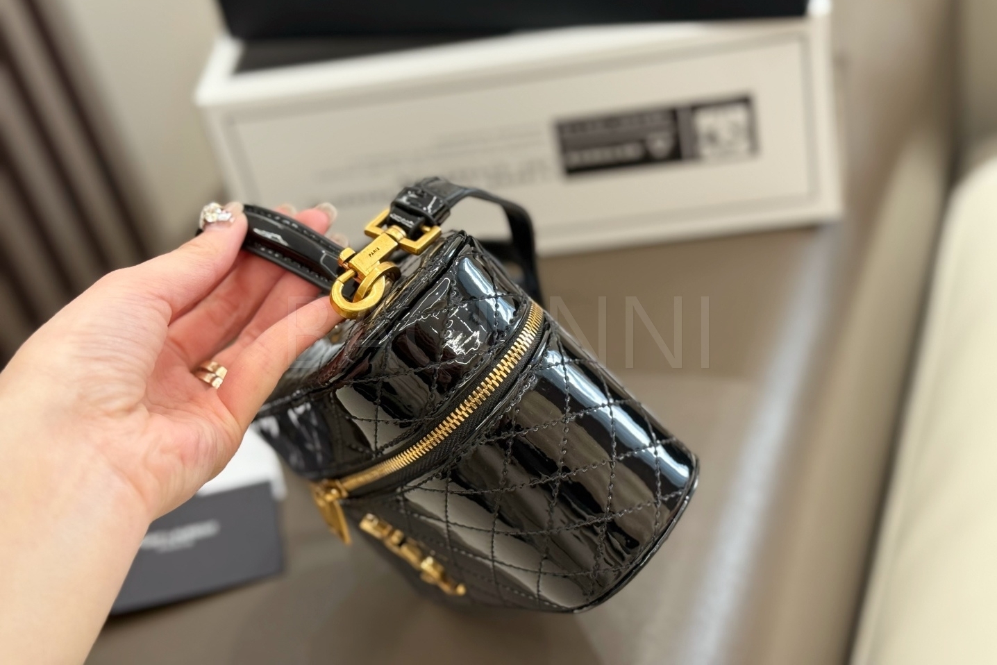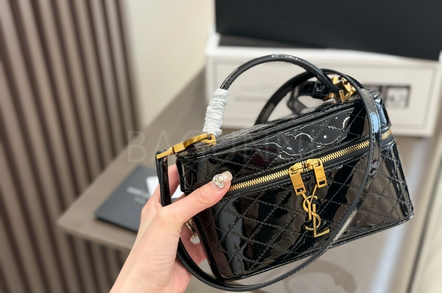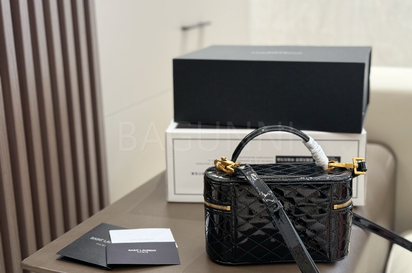 YSL 개비 박스백입니다. 페이턴트 가죽 특유의 질감이 자연스럽게 살아 있으며 블랙, 골드 톤이 어우러져 브랜드 특유의 분위기를 편하게 즐기기 좋습니다.