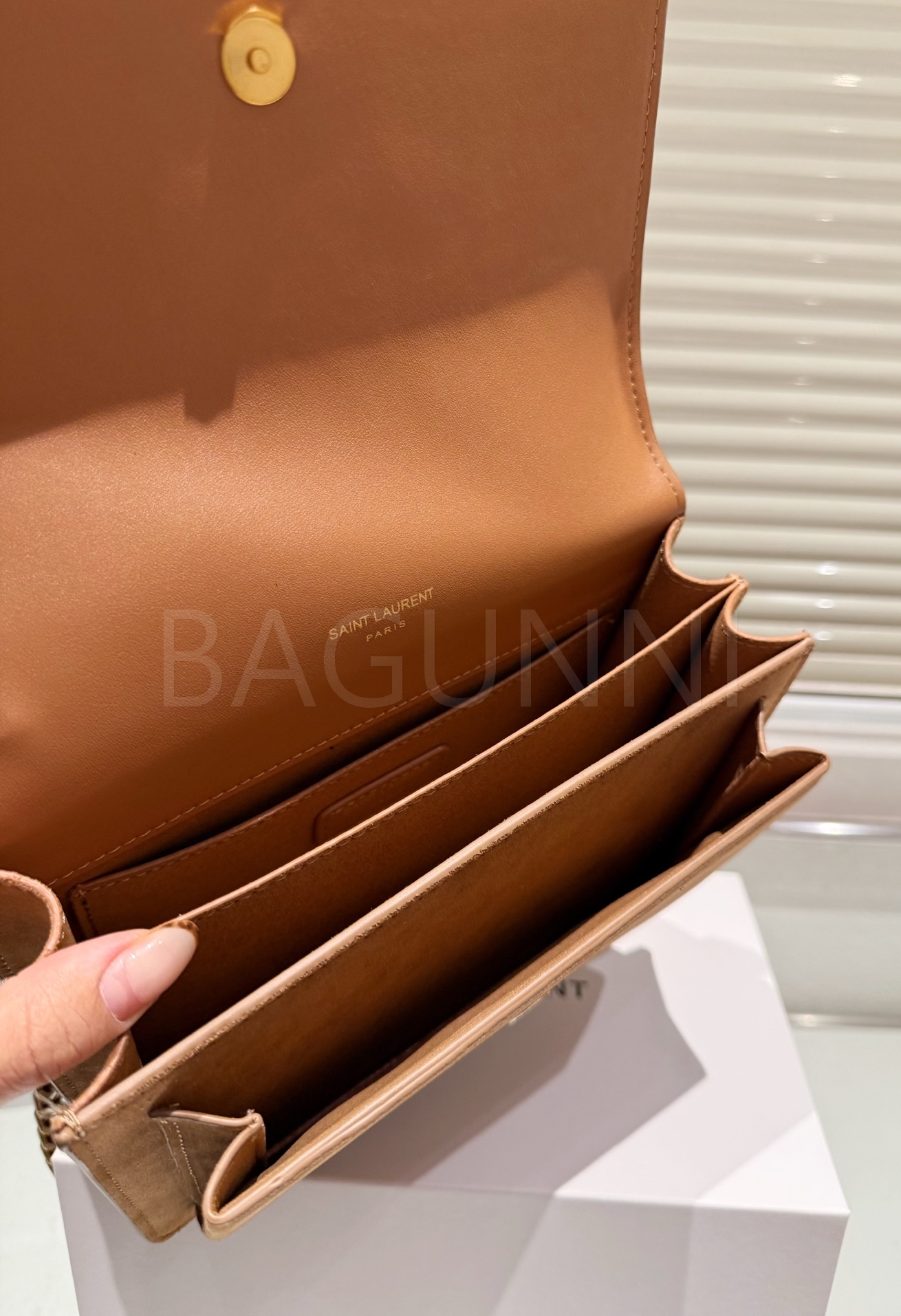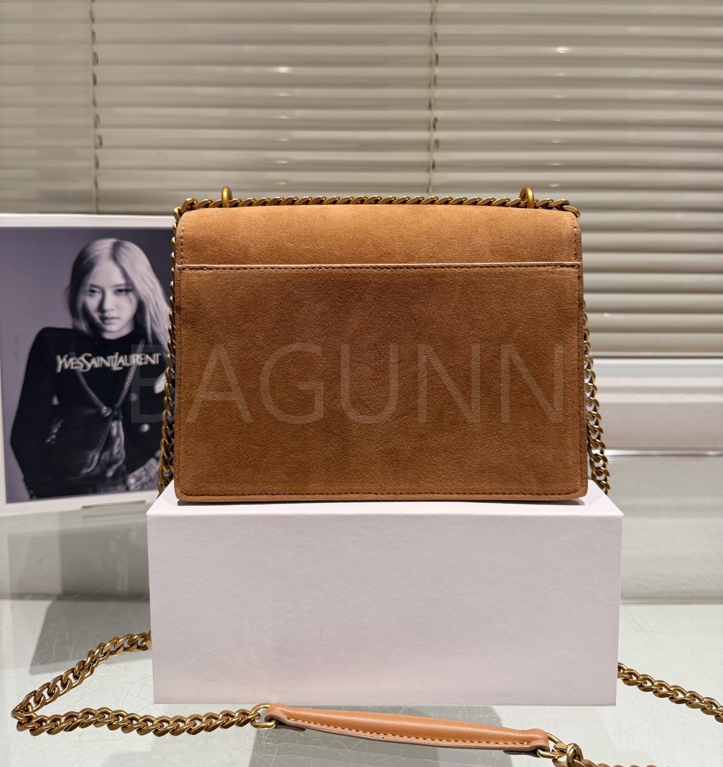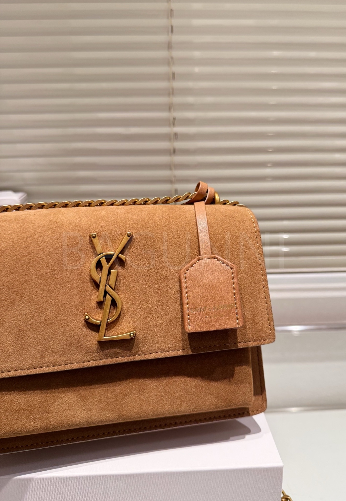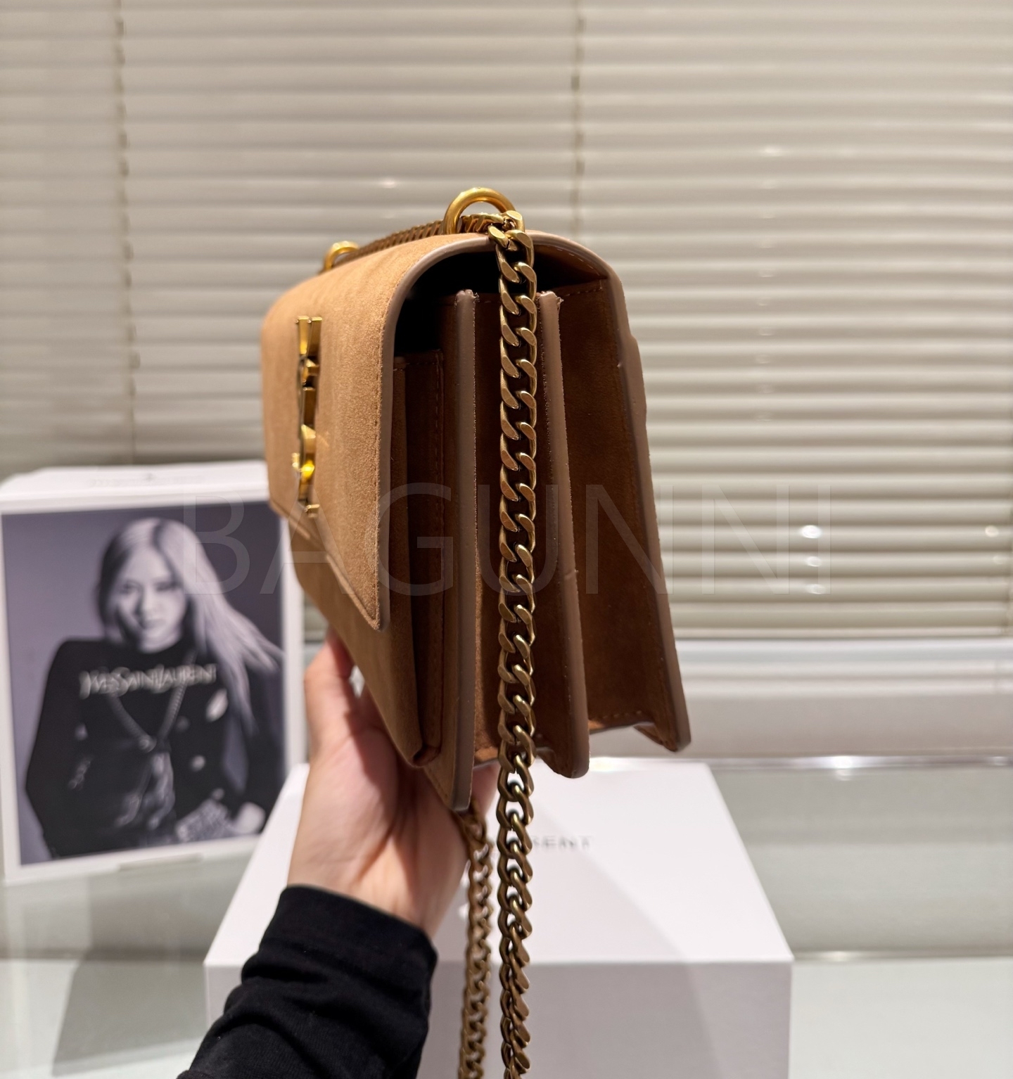 YSL 선셋 숄더백입니다. 스웨이드 특유의 질감이 자연스럽게 살아 있으며 브랜드 특유의 분위기를 편하게 즐기기 좋습니다.