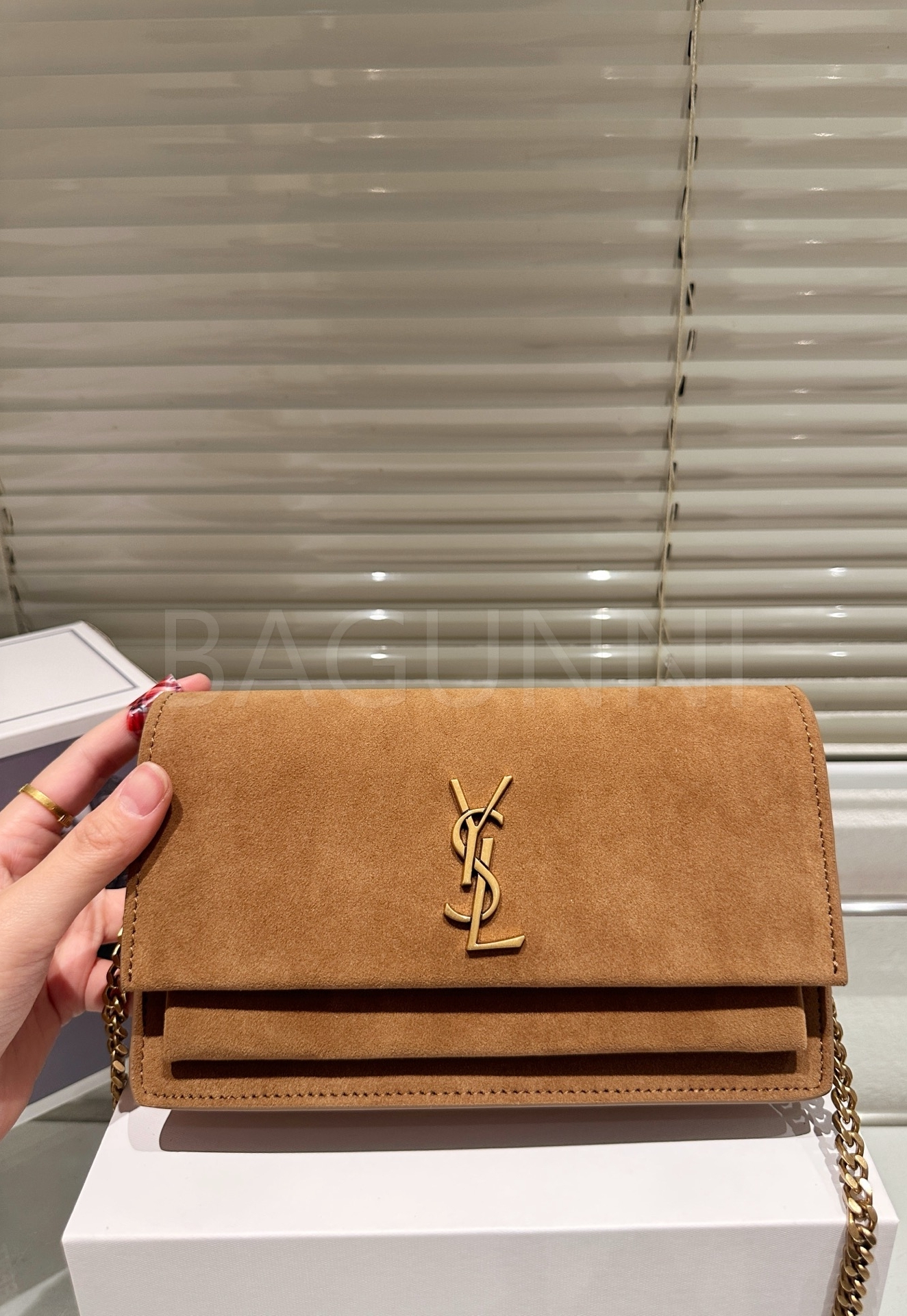 YSL 니키 체인백입니다. 스웨이드 특유의 질감이 자연스럽게 살아 있으며 레드 톤이 어우러져 브랜드 특유의 분위기를 편하게 즐기기 좋습니다.
