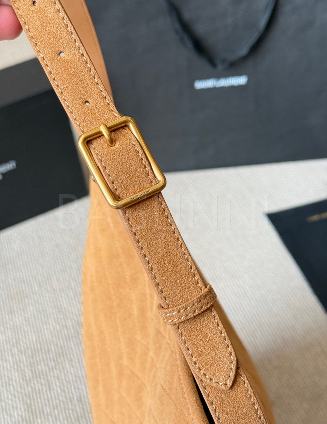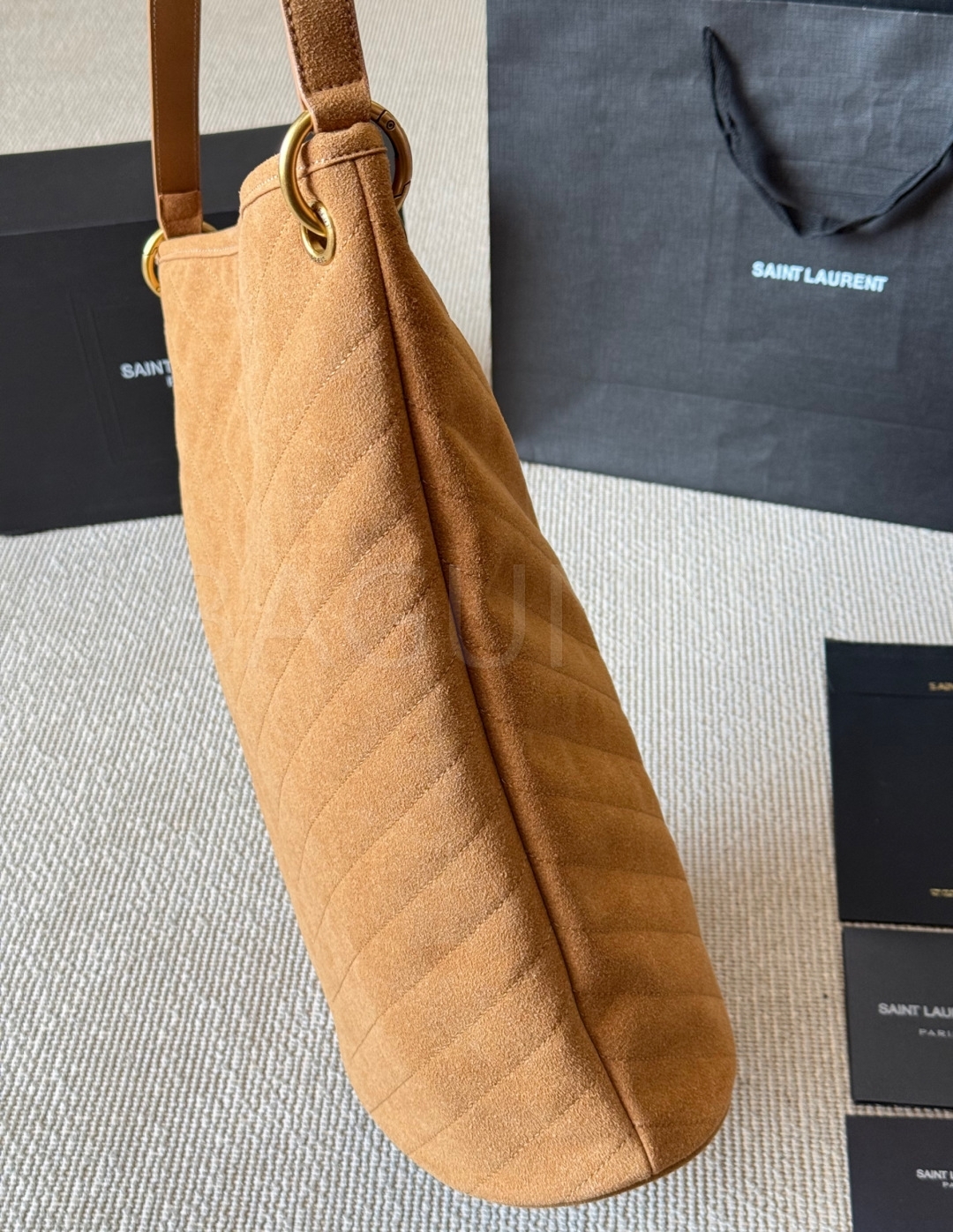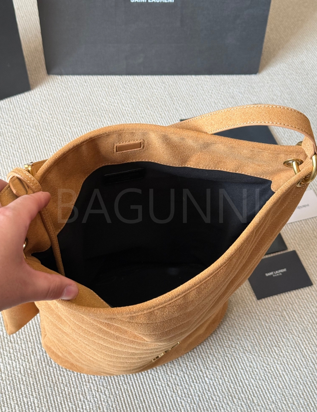 YSL 니키 버킷백입니다. 스웨이드 특유의 질감이 자연스럽게 살아 있으며 레드 톤이 어우러져 브랜드 특유의 분위기를 편하게 즐기기 좋습니다.