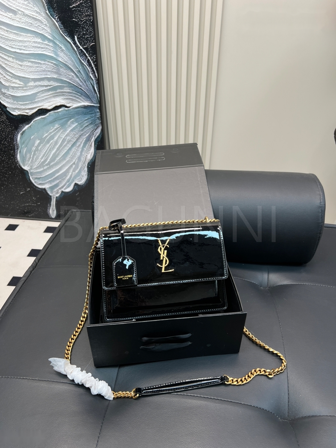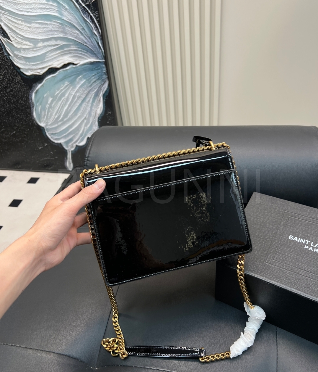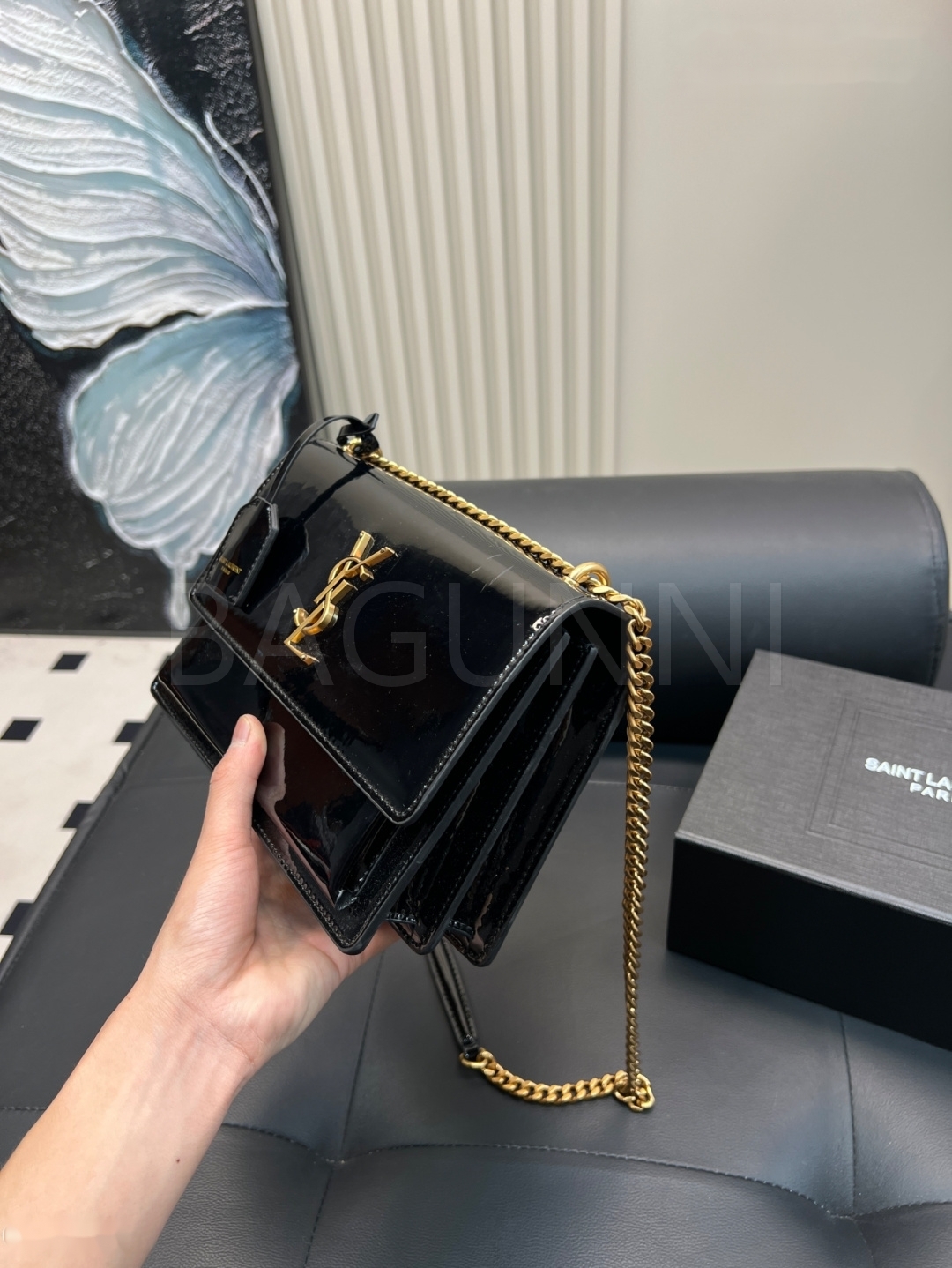 YSL 선셋 숄더백입니다. 페이턴트 가죽 특유의 질감이 자연스럽게 살아 있으며 브랜드 특유의 분위기를 편하게 즐기기 좋습니다.