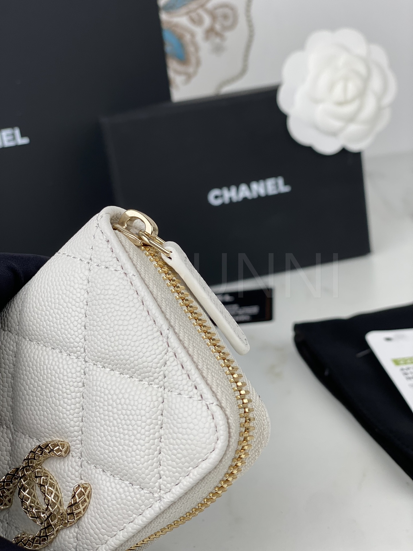 카프스킨의 질감이 돋보이는 샤넬 19 카드지갑입니다.