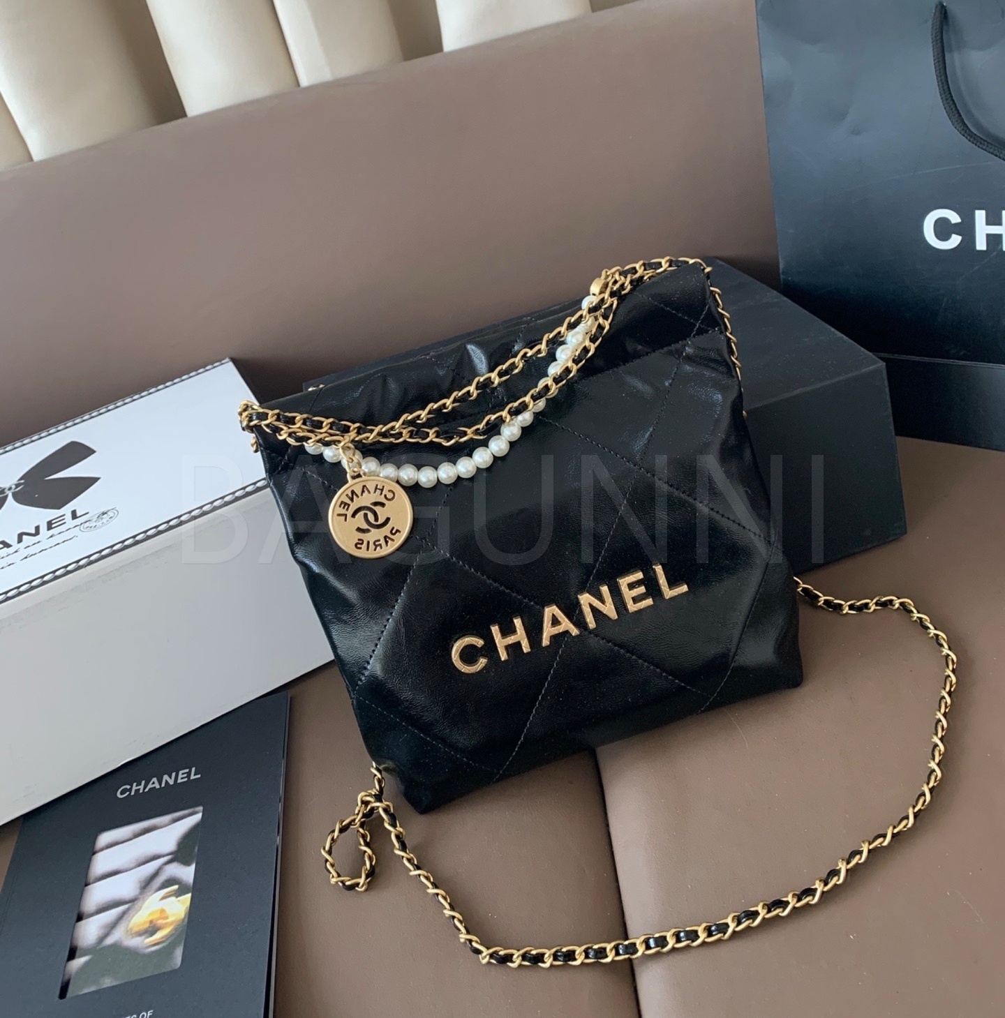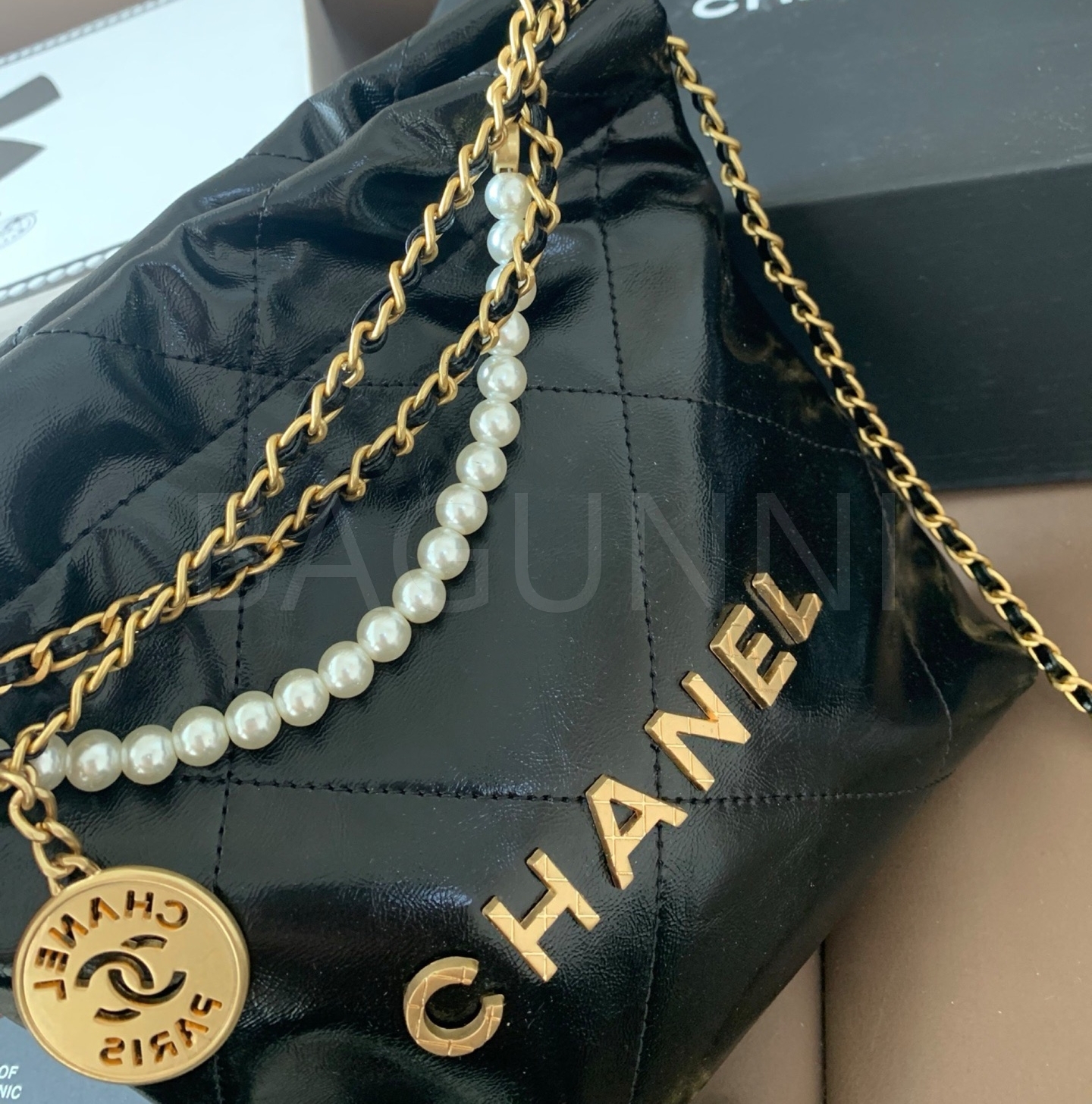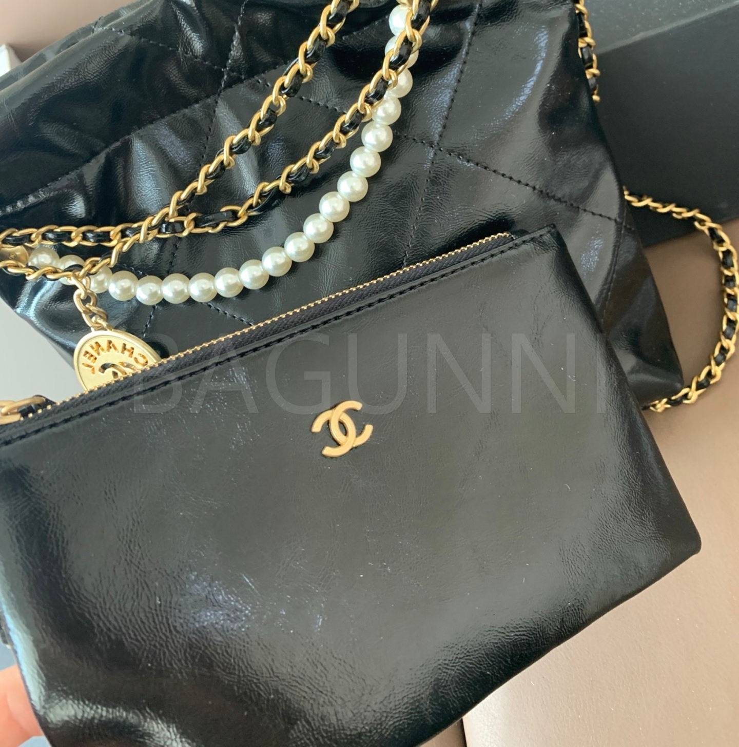 가죽 특유의 매력이 돋보이는 샤넬 22B 펄 22 백입니다.