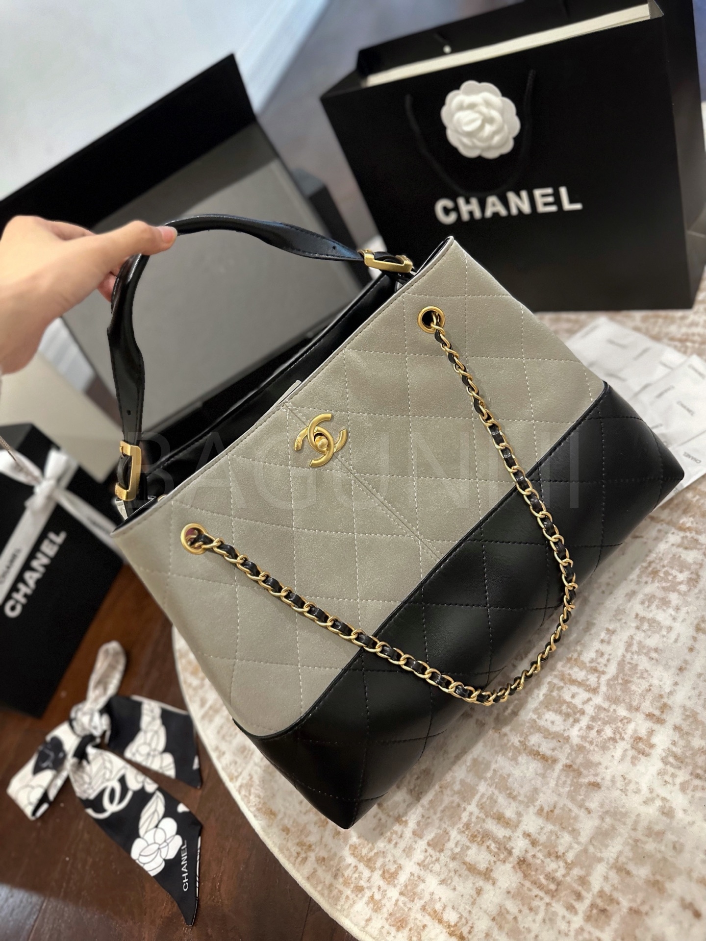 스웨이드 특유의 매력이 돋보이는 샤넬 23C 스웨이드 호보 백입니다.