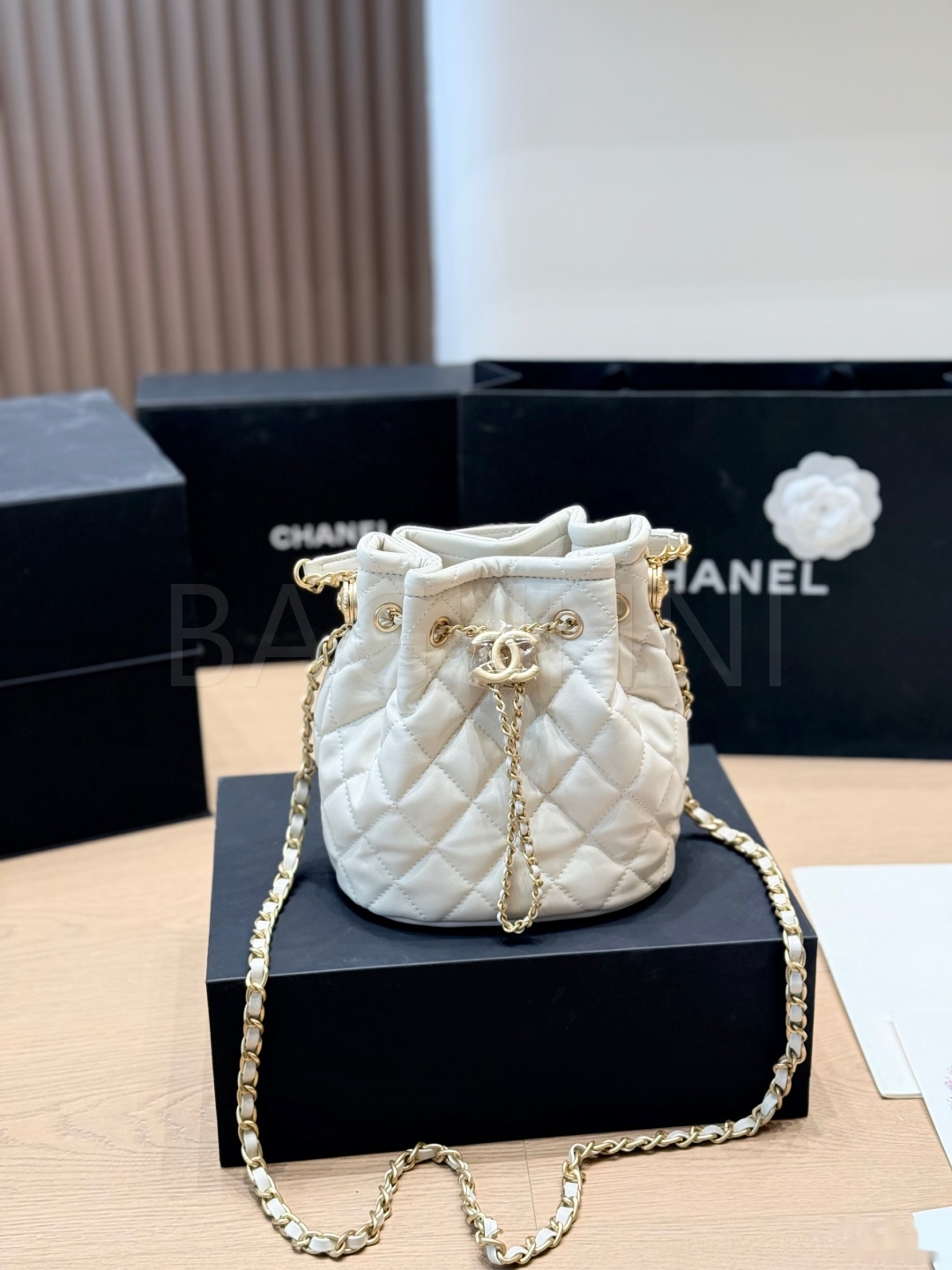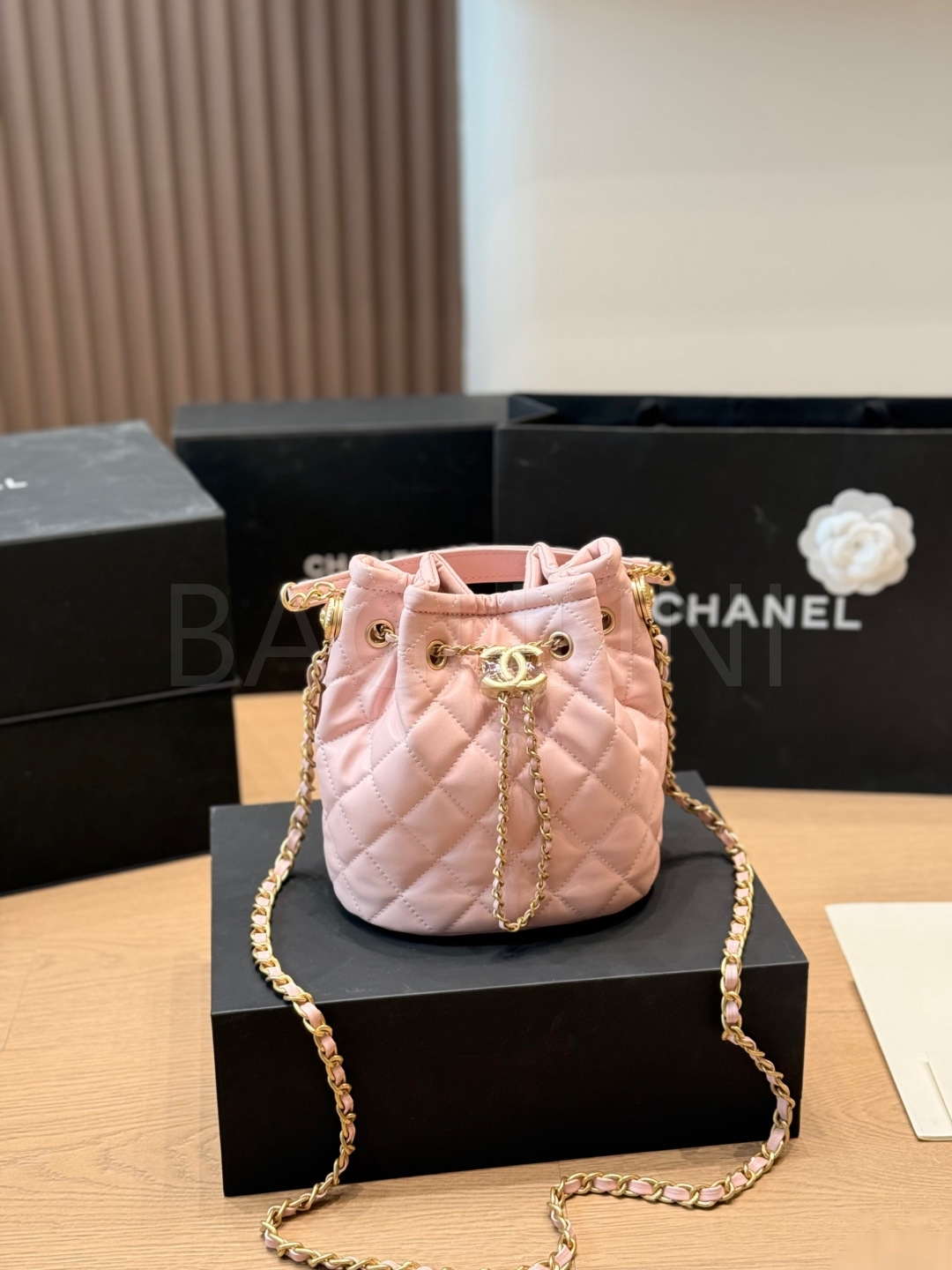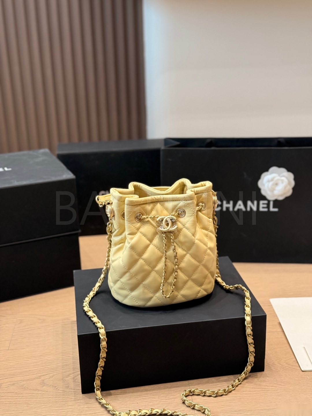 클래식한 퀼팅 패턴과 체인 디테일이 돋보이는 샤넬 25 버킷 백입니다.