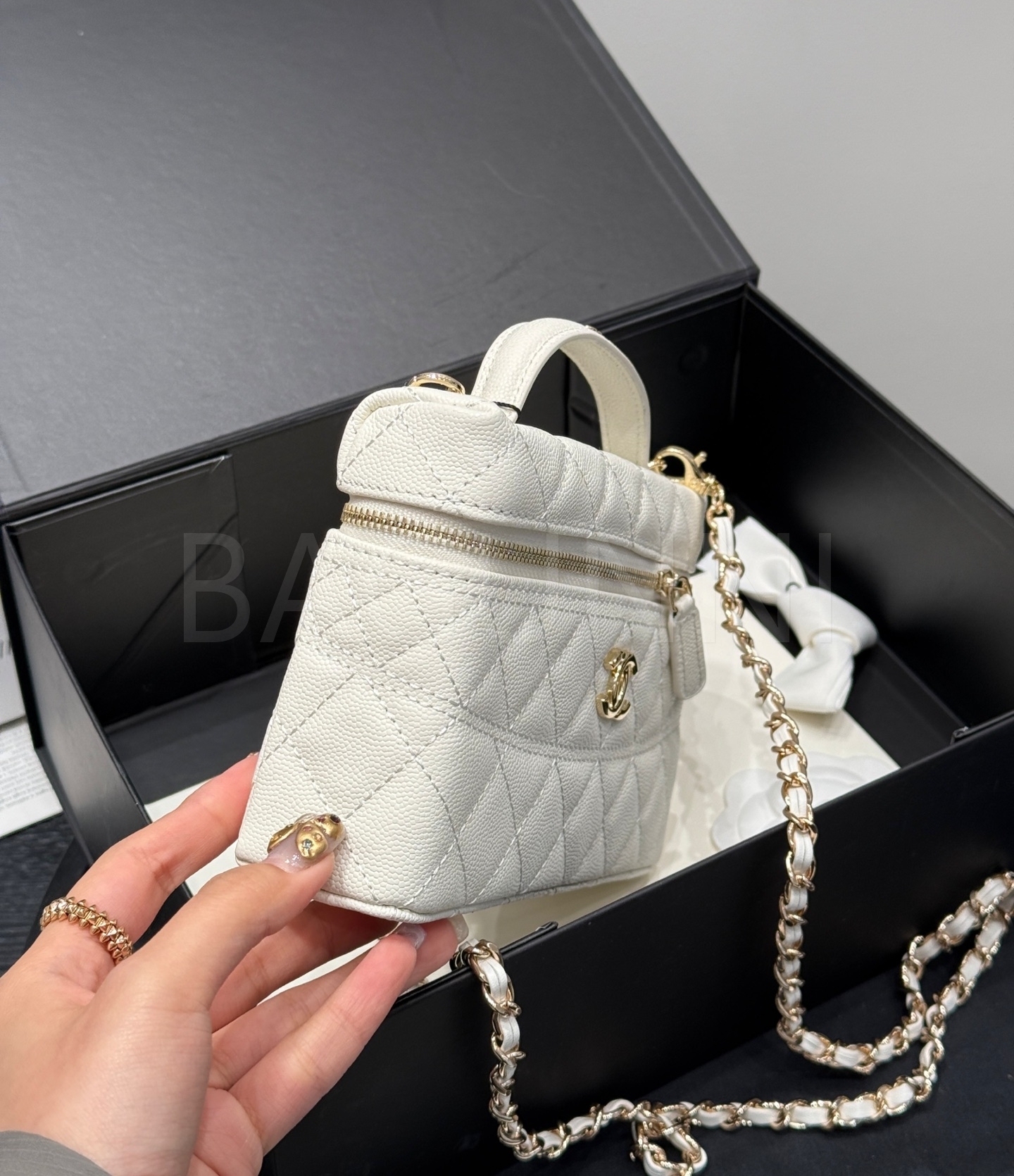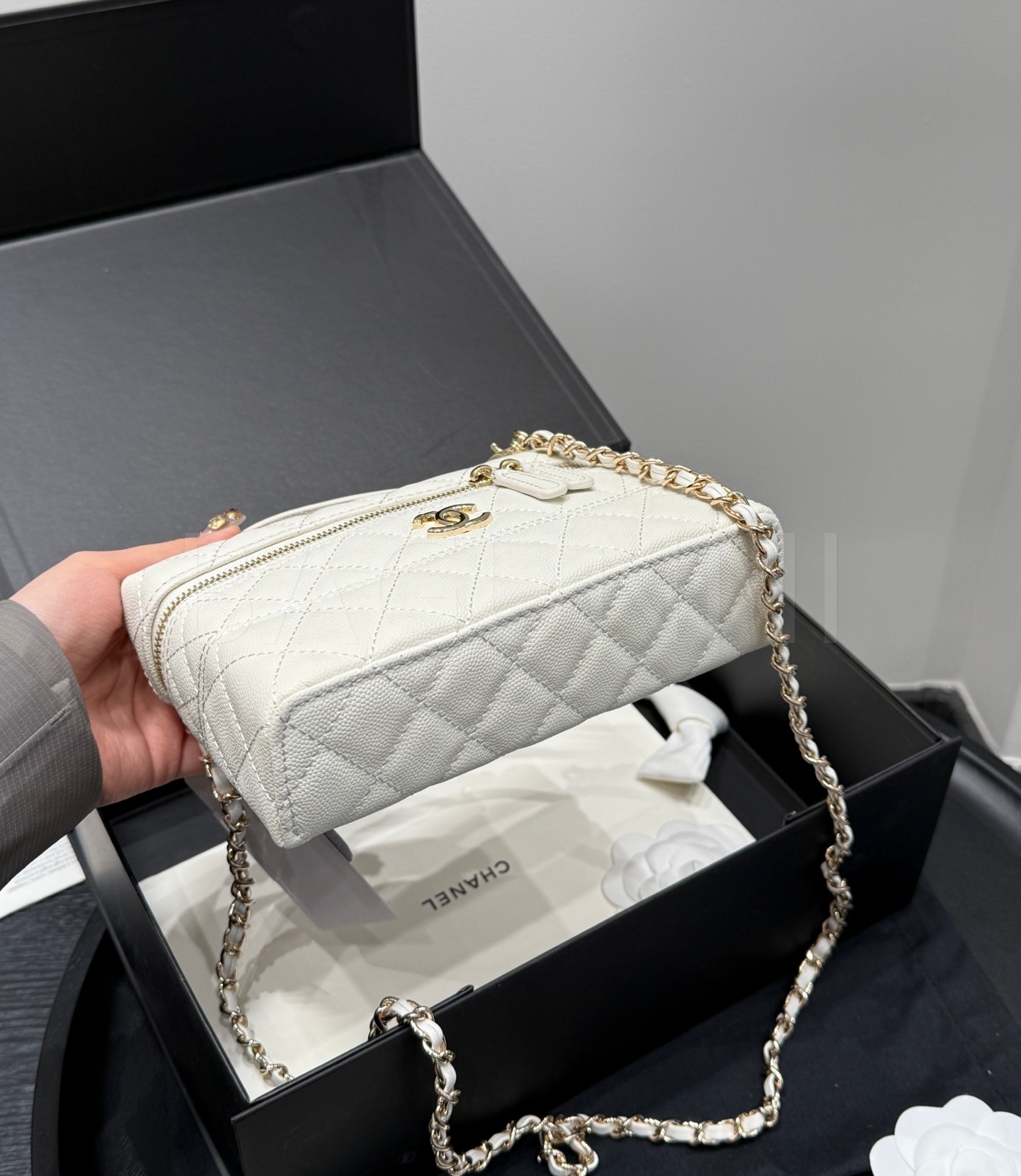 캐비어 가죽 특유의 매력이 돋보이는 샤넬 25C 런치박스 체인 백입니다.