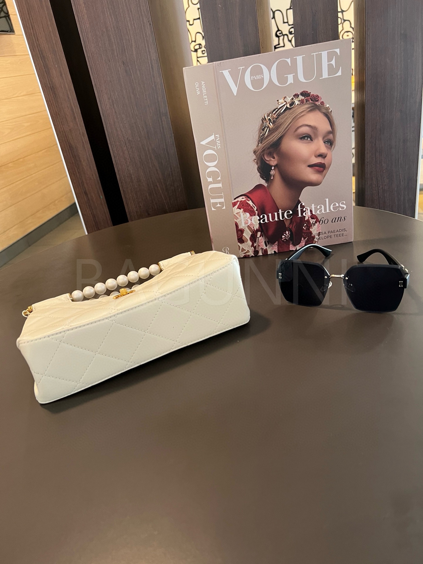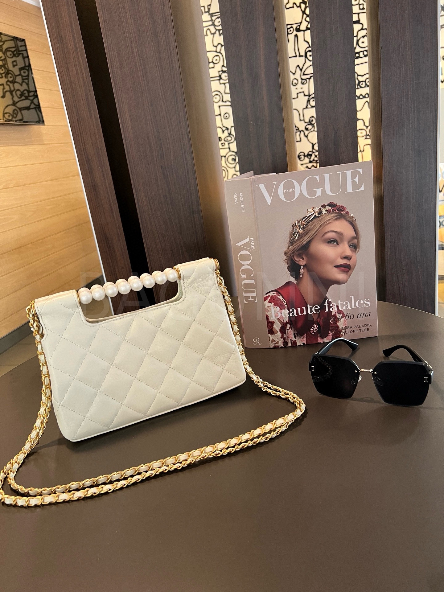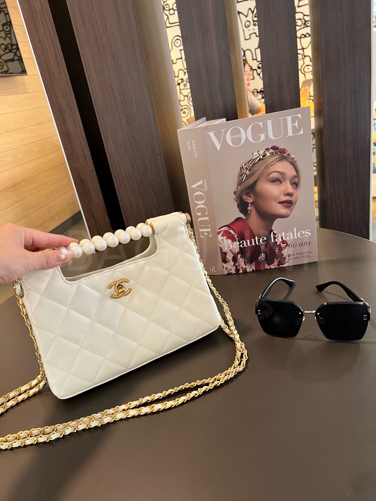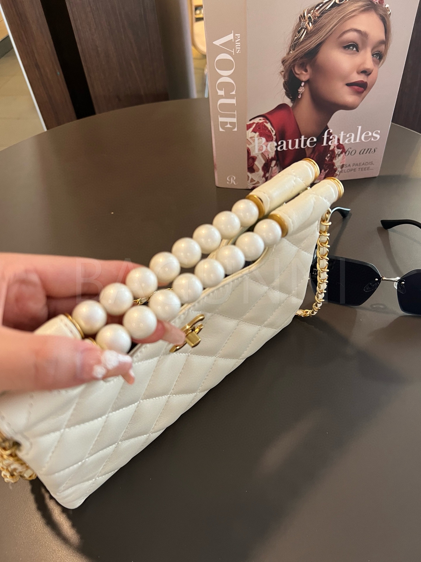 더블 C 로고, 체인 스트랩, 탑핸들 디테일, 진주 장식, 숄더와 크로스 연출 디테일이 조화롭게 어우러져 완성도를 높여줍니다 빈티지한 분위기로 스타일링에 멋을 더해줍니다