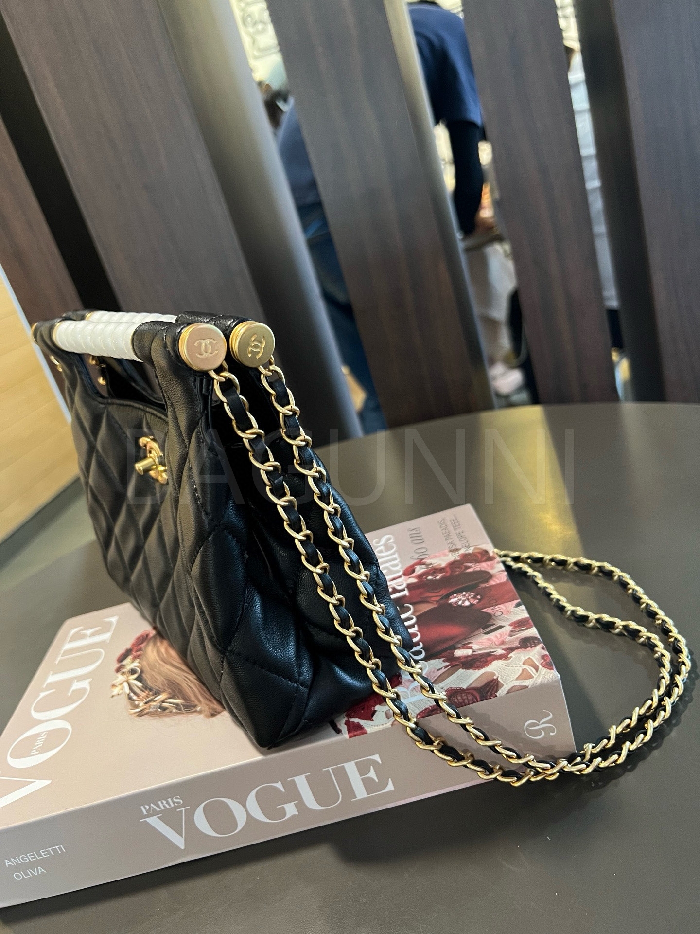 더블 C 로고, 체인 스트랩, 탑핸들 디테일, 진주 장식, 숄더와 크로스 연출 디테일이 조화롭게 어우러져 완성도를 높여줍니다 빈티지한 분위기로 스타일링에 멋을 더해줍니다