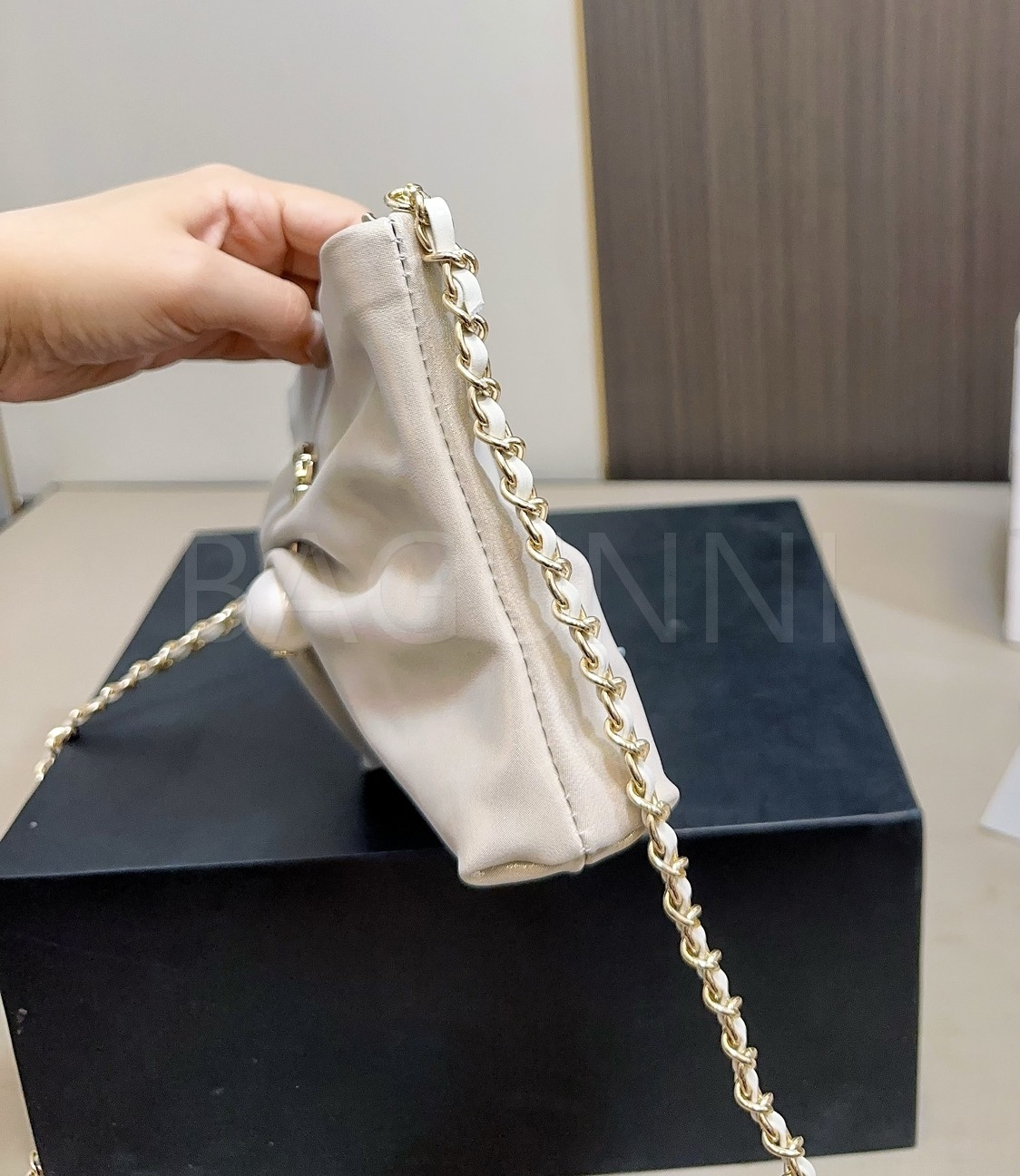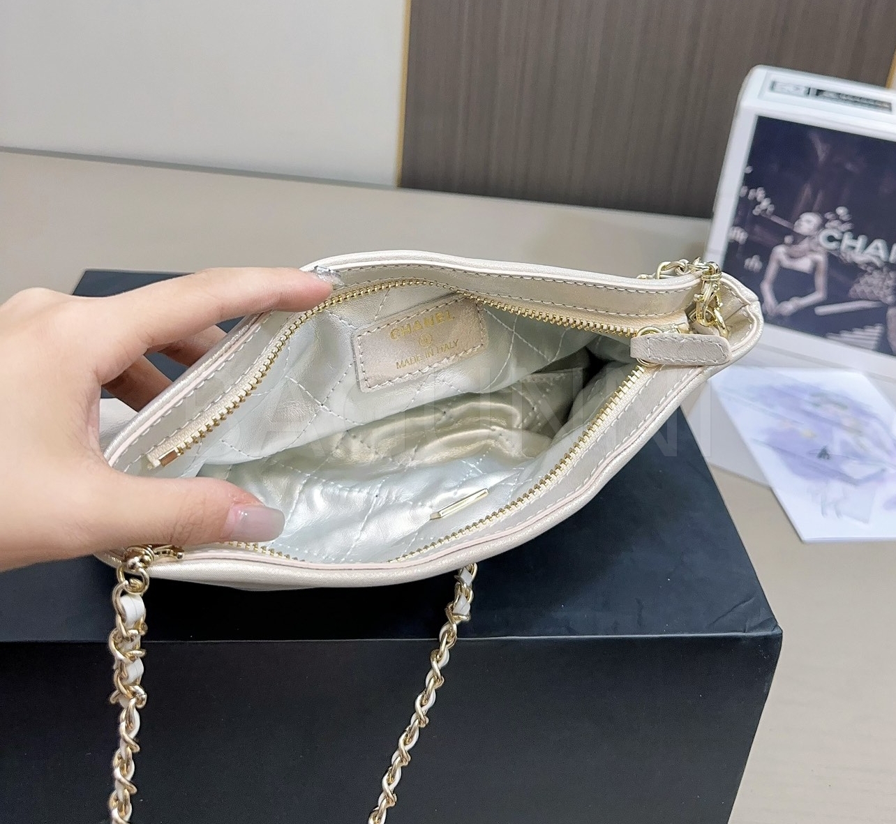 더블 C 로고, 체인 스트랩, 진주 장식 디테일이 조화롭게 어우러져 완성도를 높여줍니다