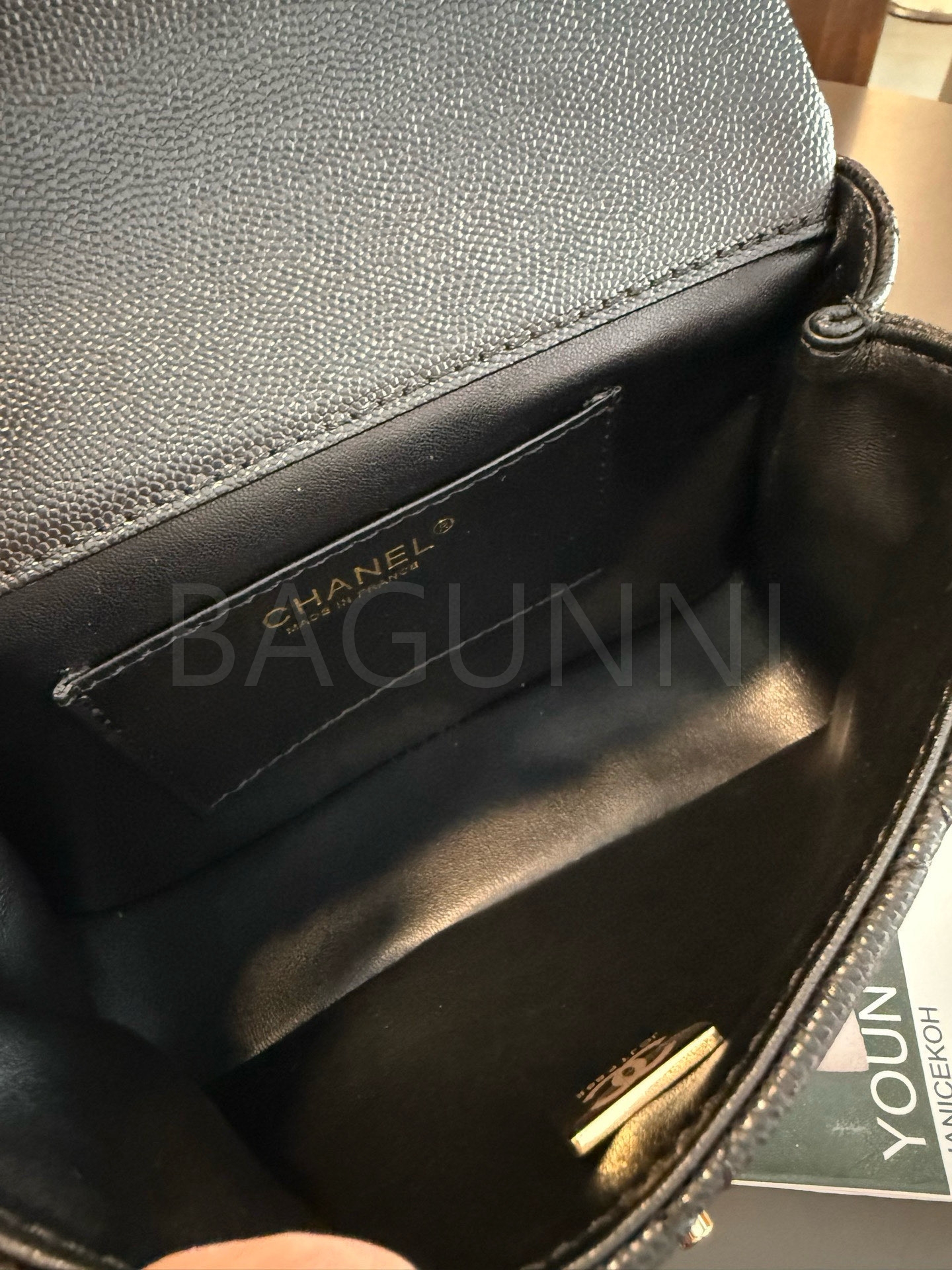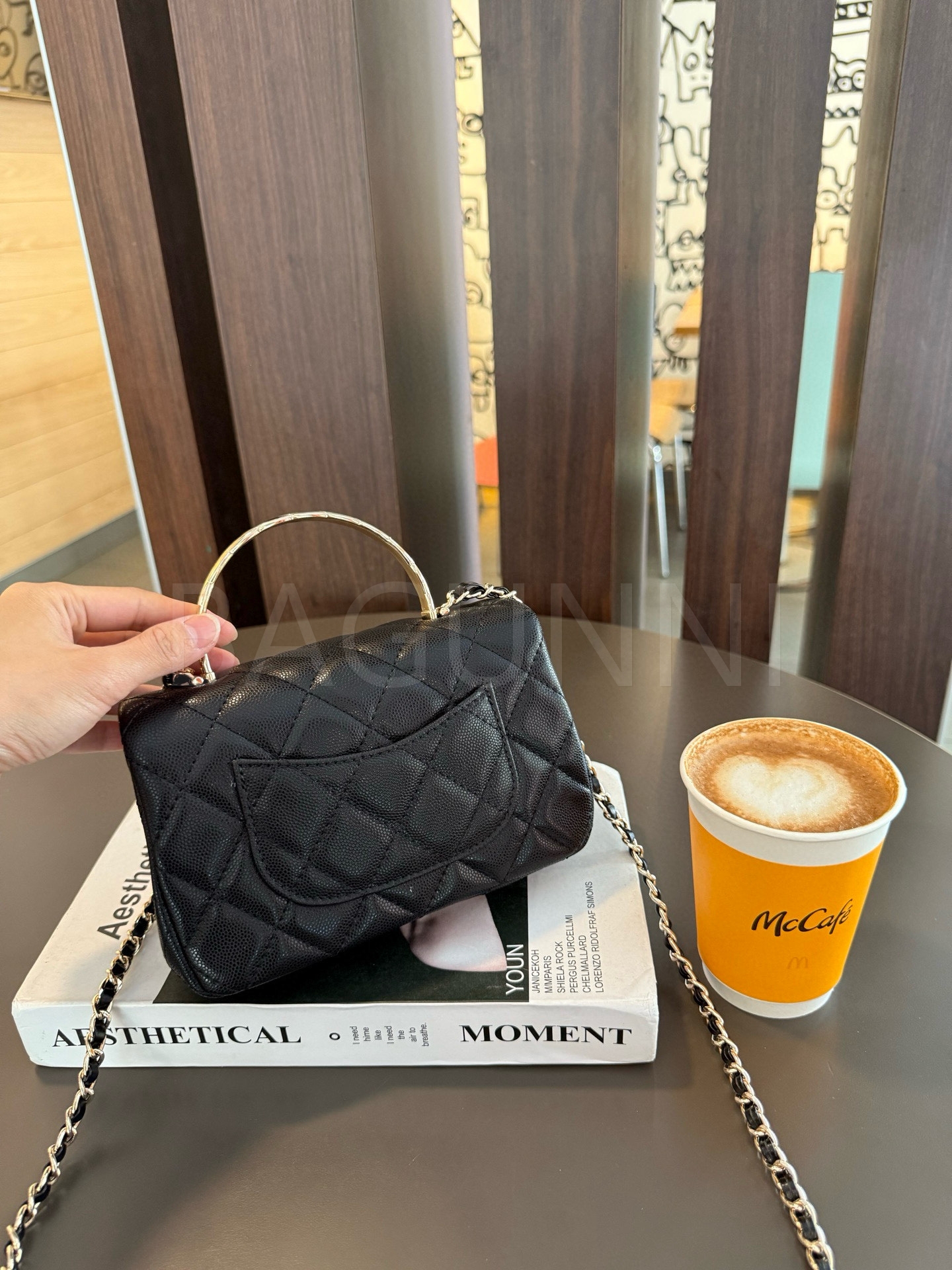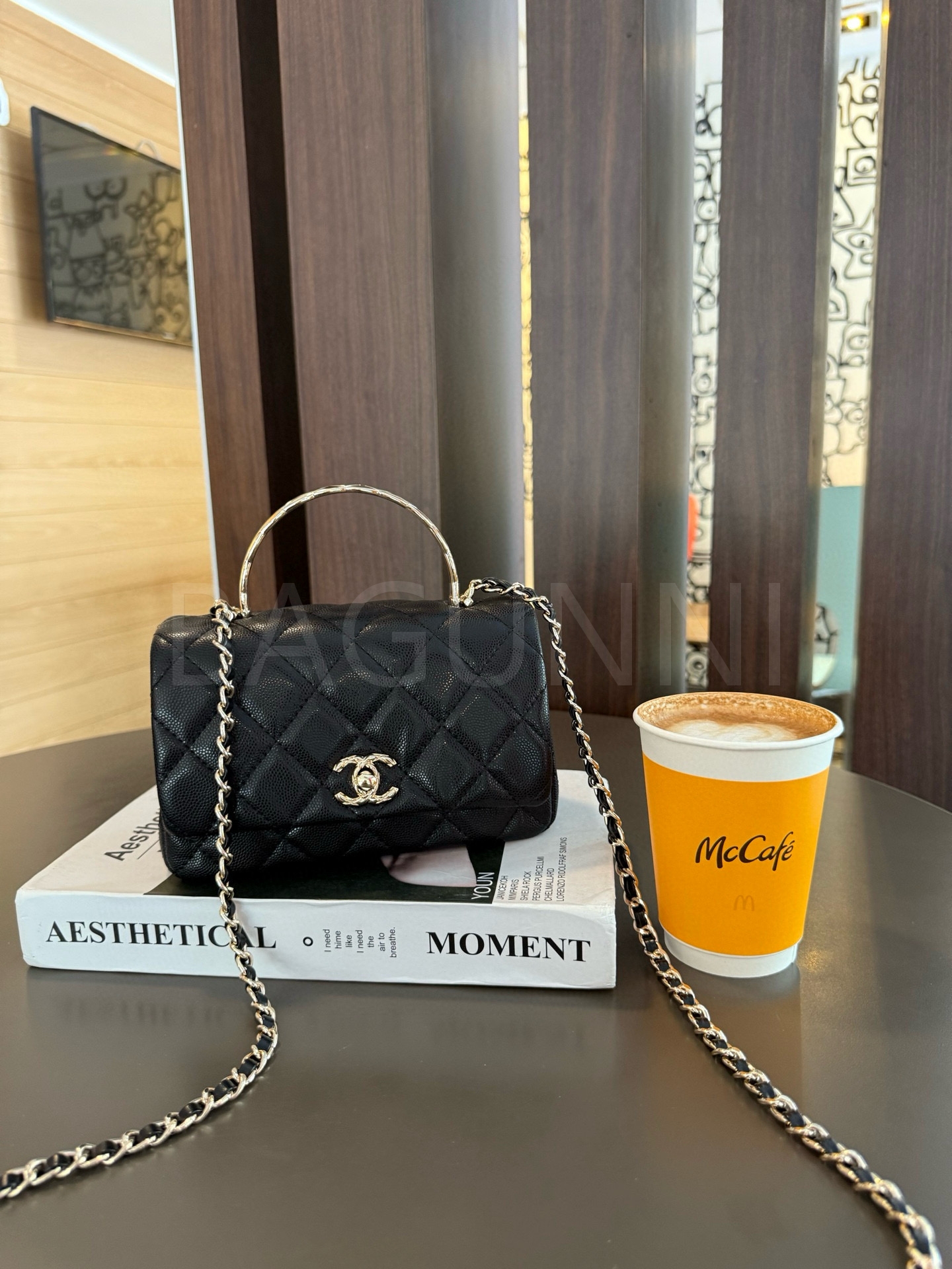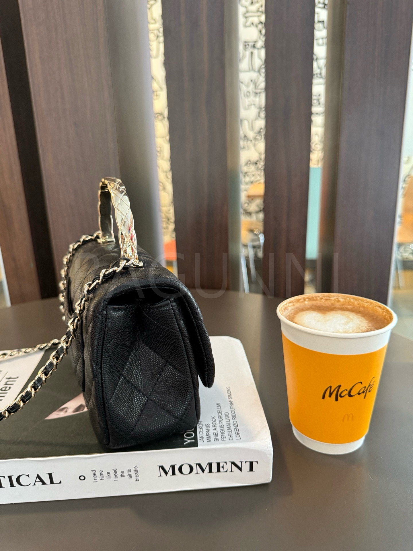 캐비어 가죽 특유의 매력이 돋보이는 샤넬 25S 코코 크러쉬 탑핸들 스퀘어 플랩 백입니다.
