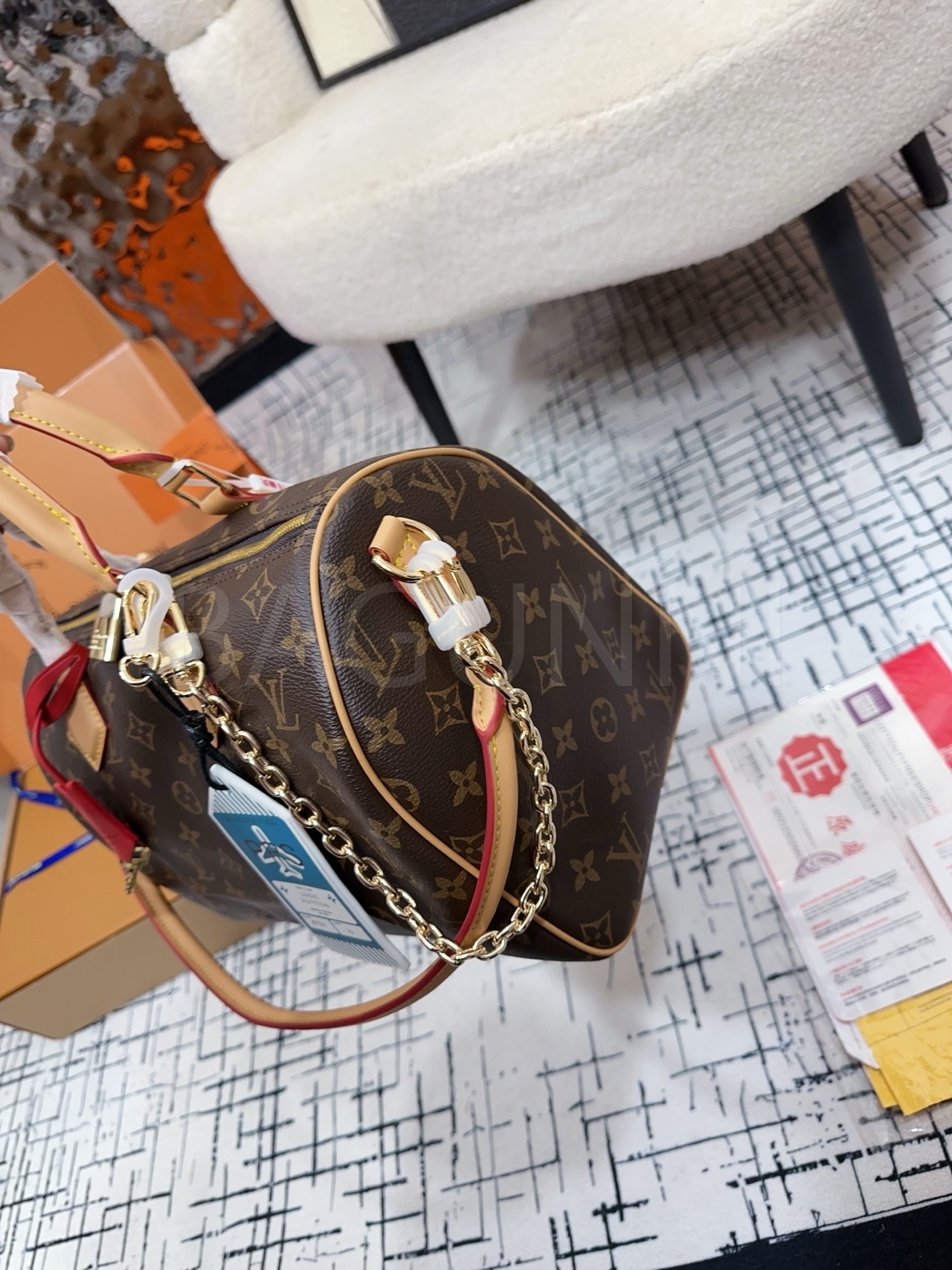 모노그램 패턴, 체인 스트랩, 탑핸들, 조절 가능한 스트랩 디테일이 조화롭게 어우러져 완성도를 높여줍니다 이동이나 여행 시에도 실용적으로 들기 좋은 디자인입니다
