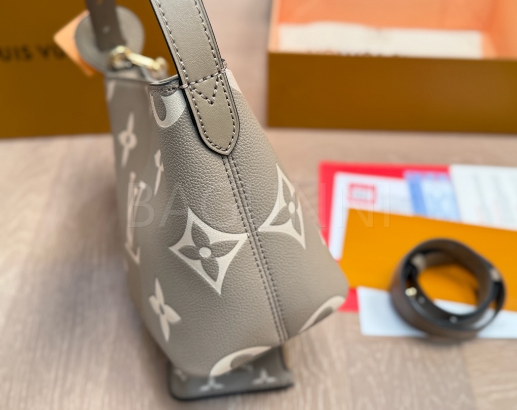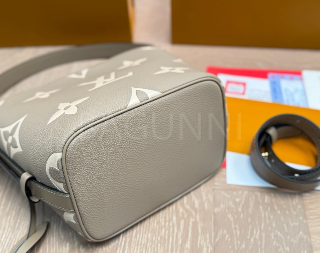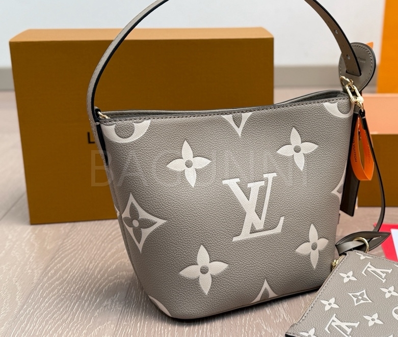 모노그램 패턴, 탑핸들, 숄더 스트랩, 버킷 실루엣 디테일이 조화롭게 어우러져 완성도를 높여줍니다