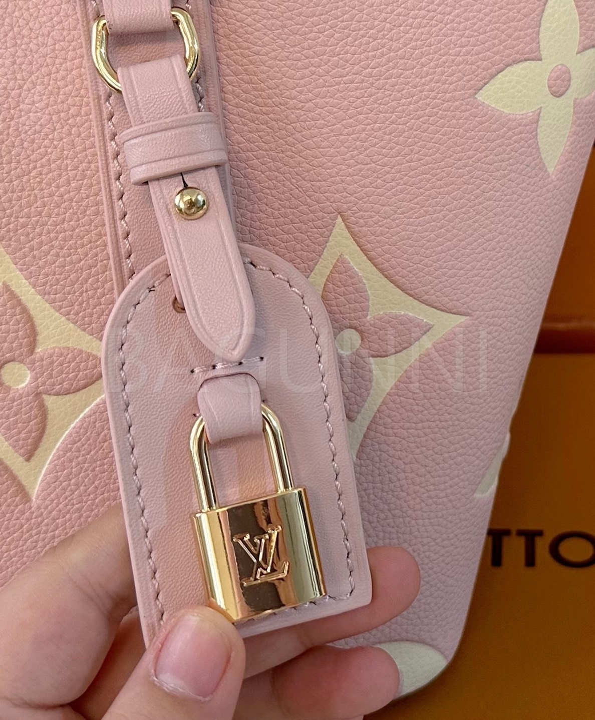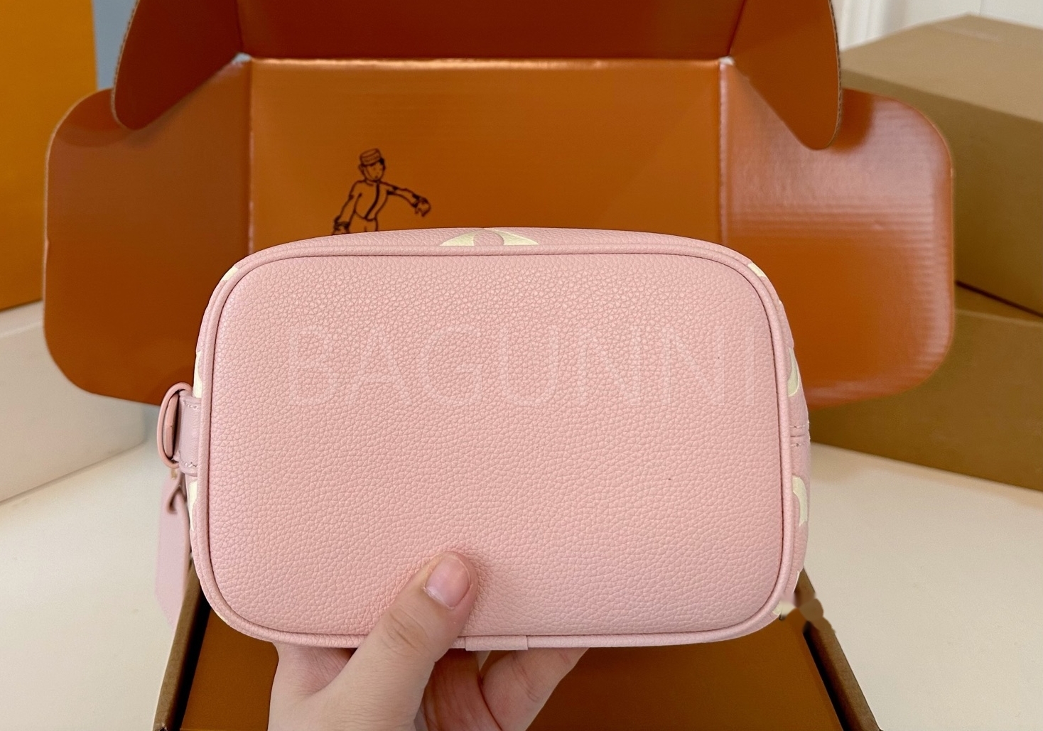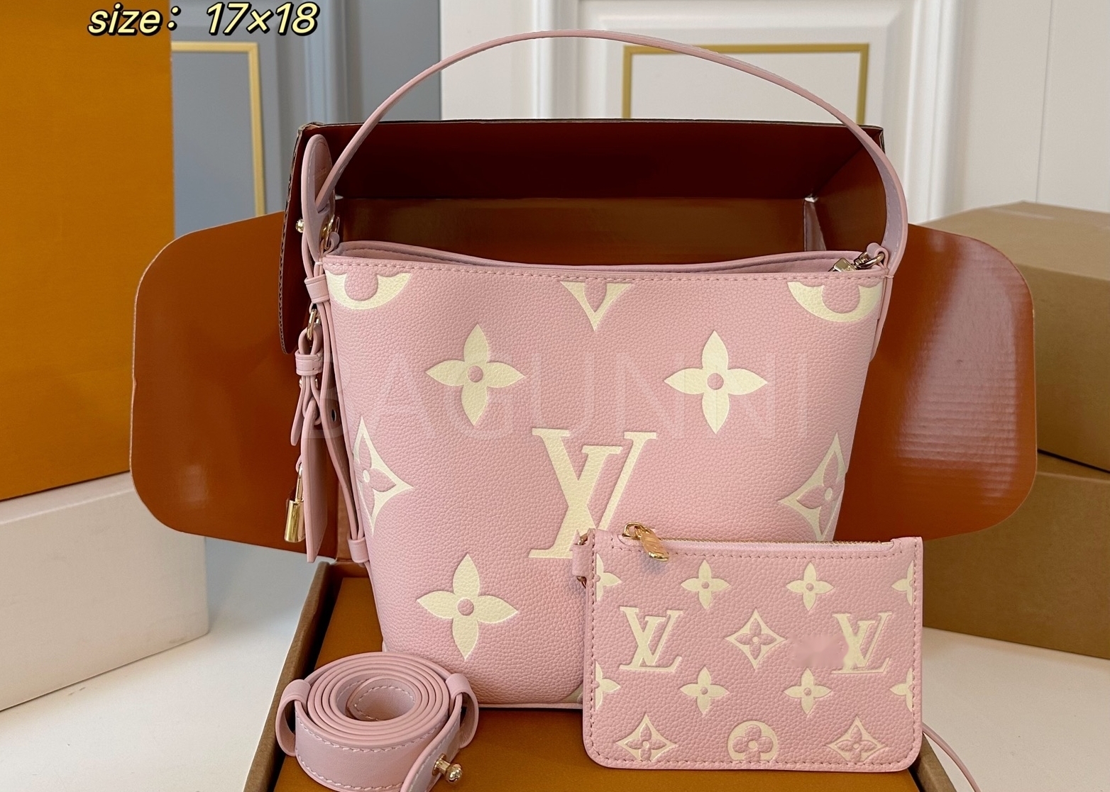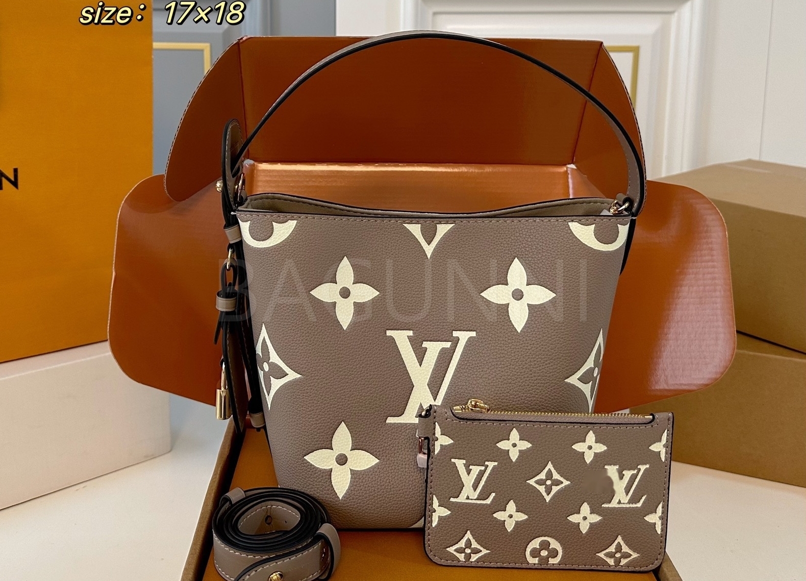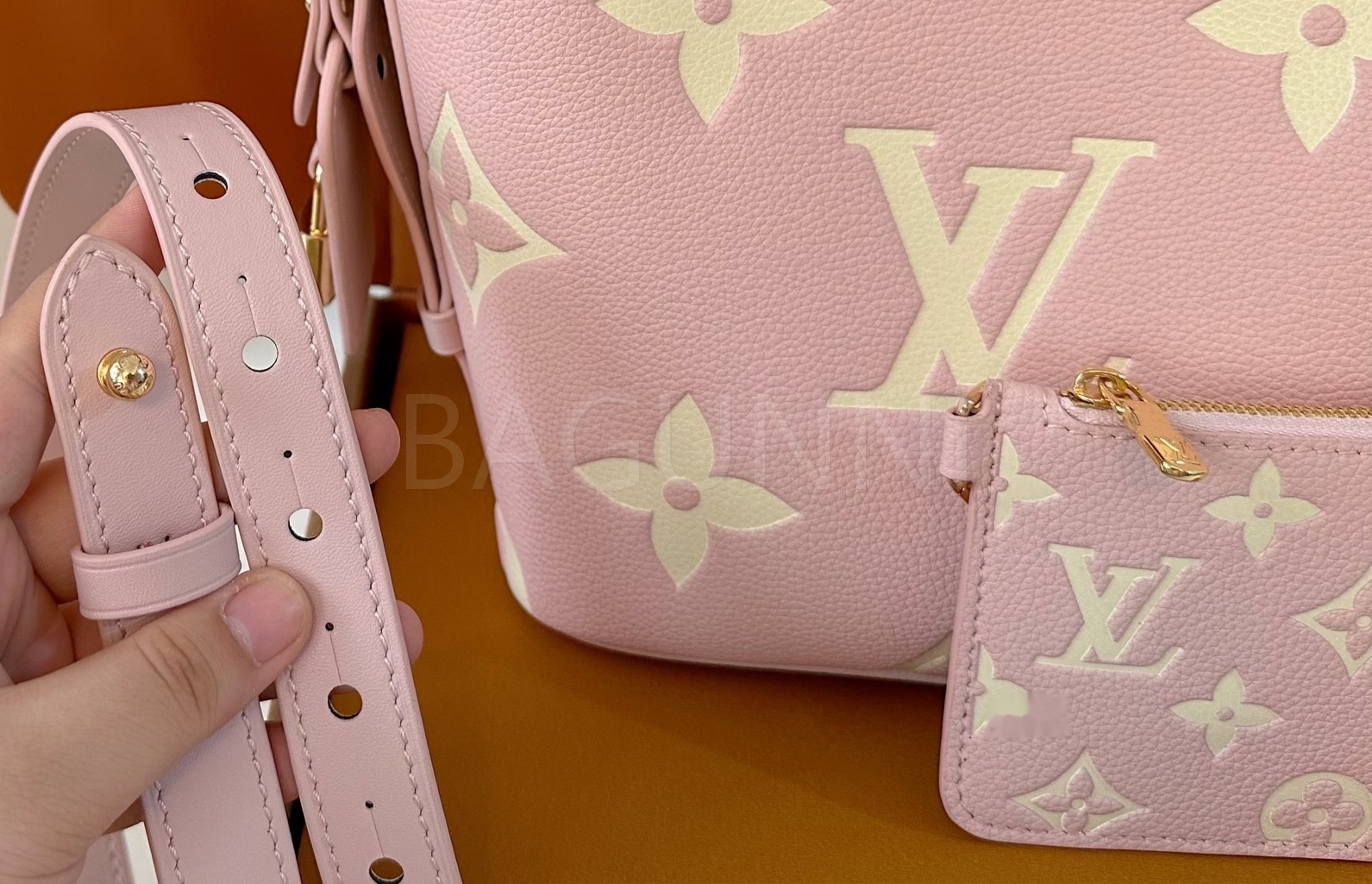 모노그램 패턴, 탑핸들, 숄더 스트랩, 버킷 실루엣 디테일이 조화롭게 어우러져 완성도를 높여줍니다
