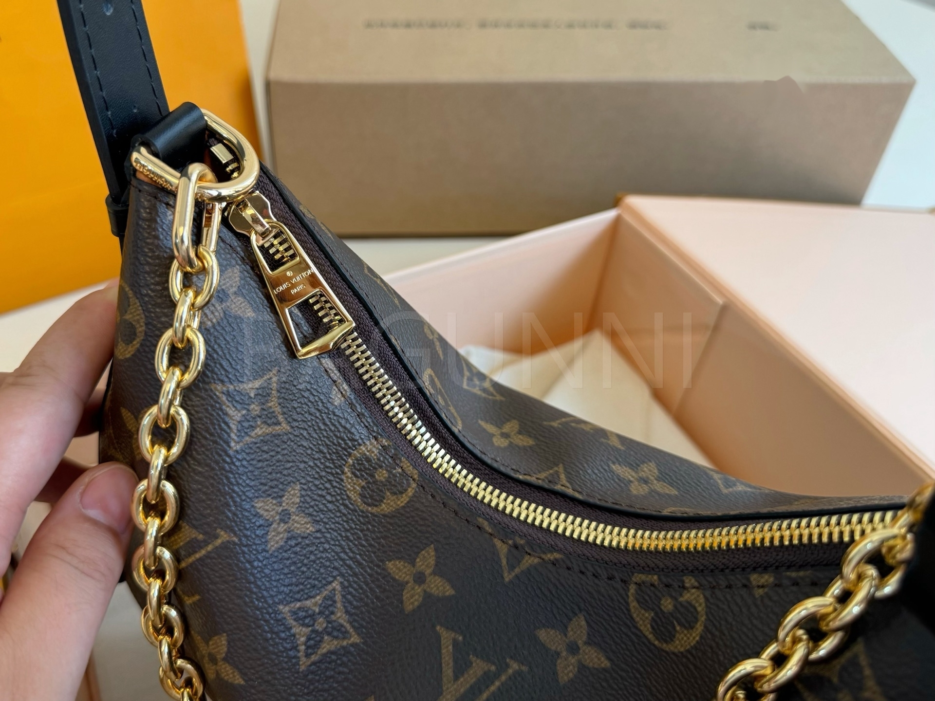 모노그램 패턴, 체인 스트랩, 여유 있는 수납력 디테일이 조화롭게 어우러져 완성도를 높여줍니다 필수 소지품을 여유 있게 수납하기 좋습니다