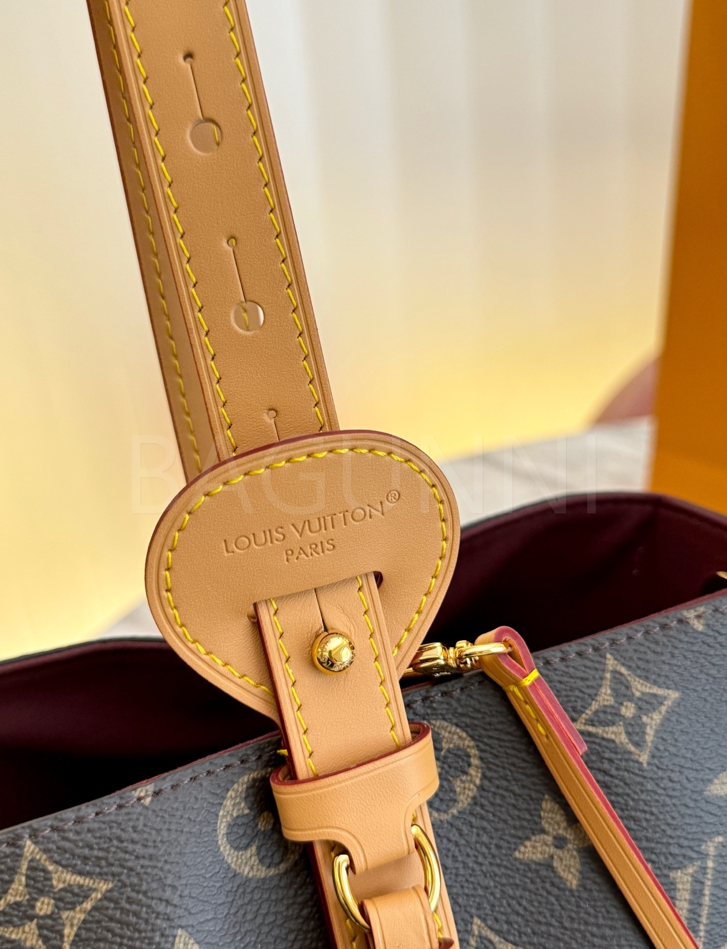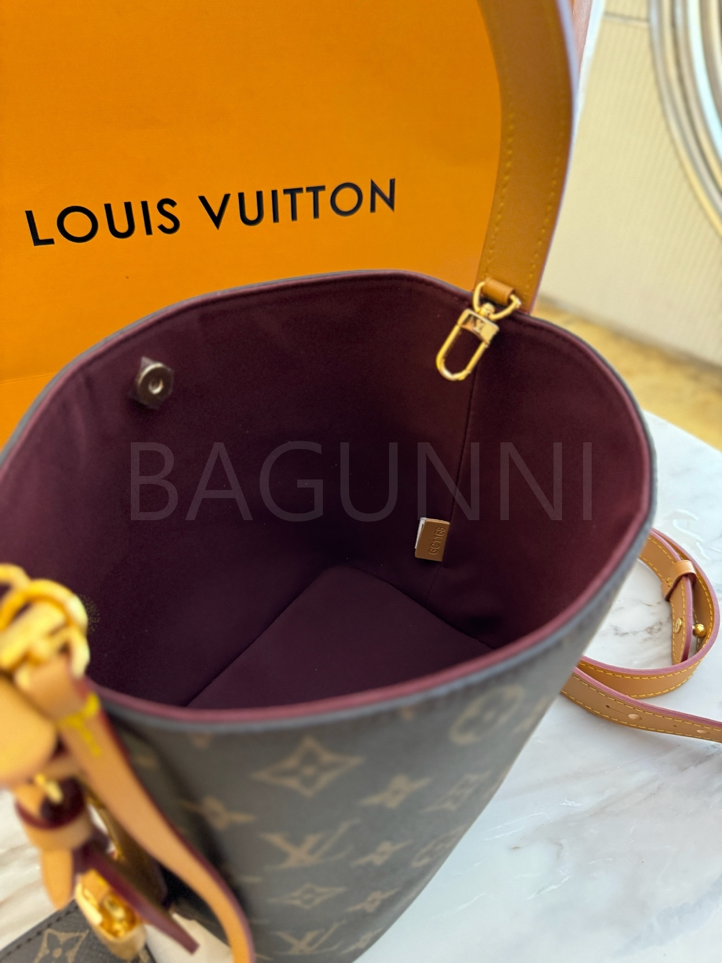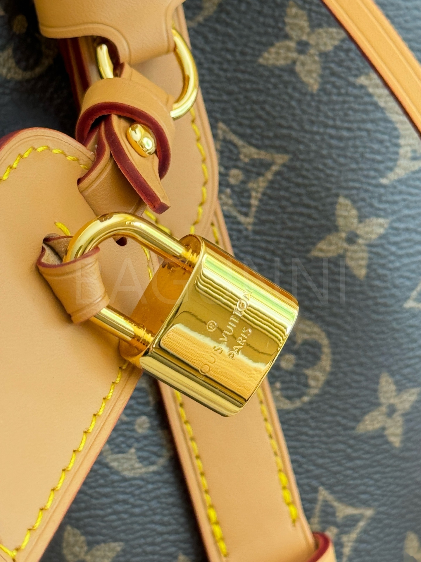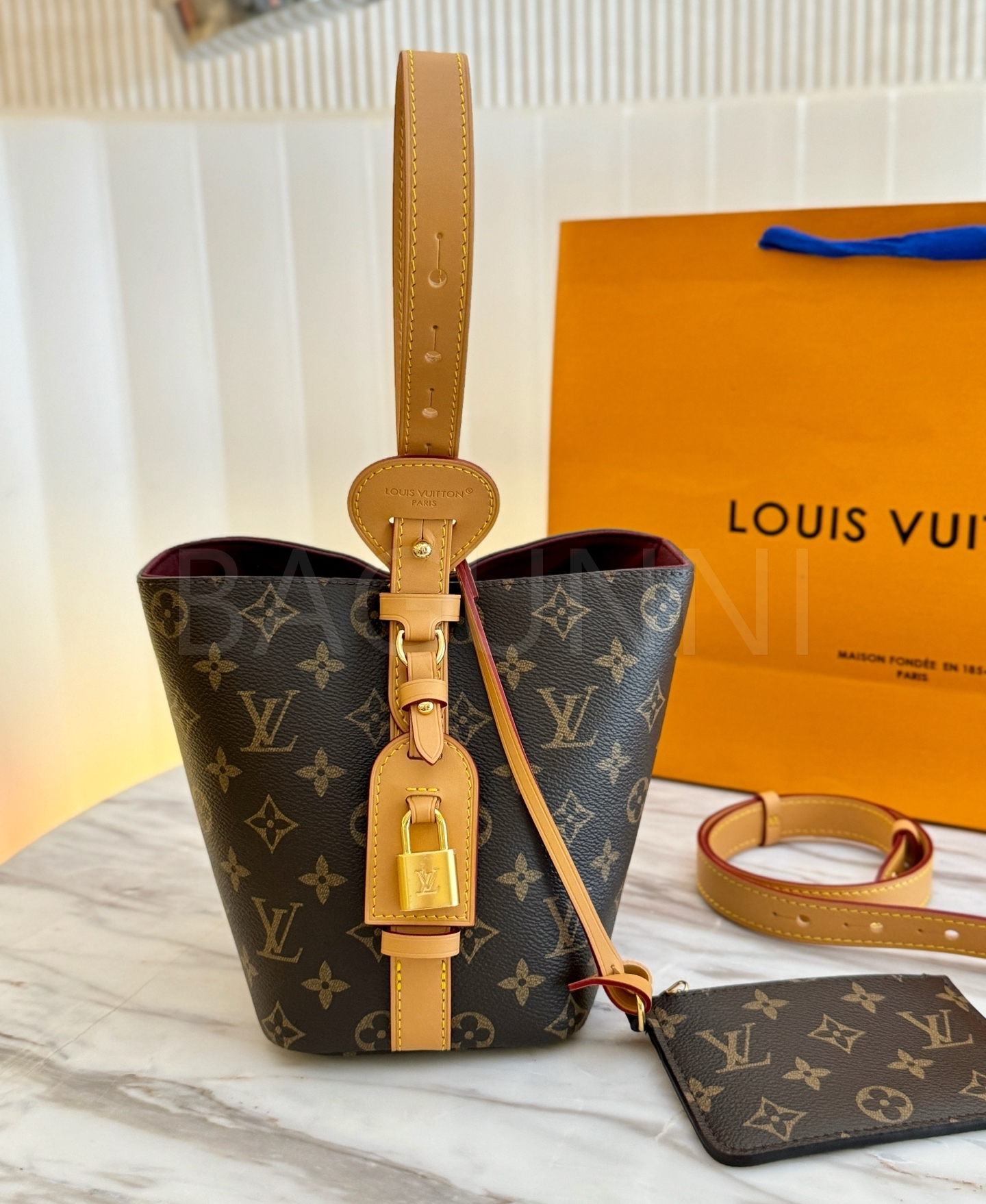 모노그램 패턴, 탑핸들, 숄더 스트랩, 버킷 실루엣 디테일이 조화롭게 어우러져 완성도를 높여줍니다