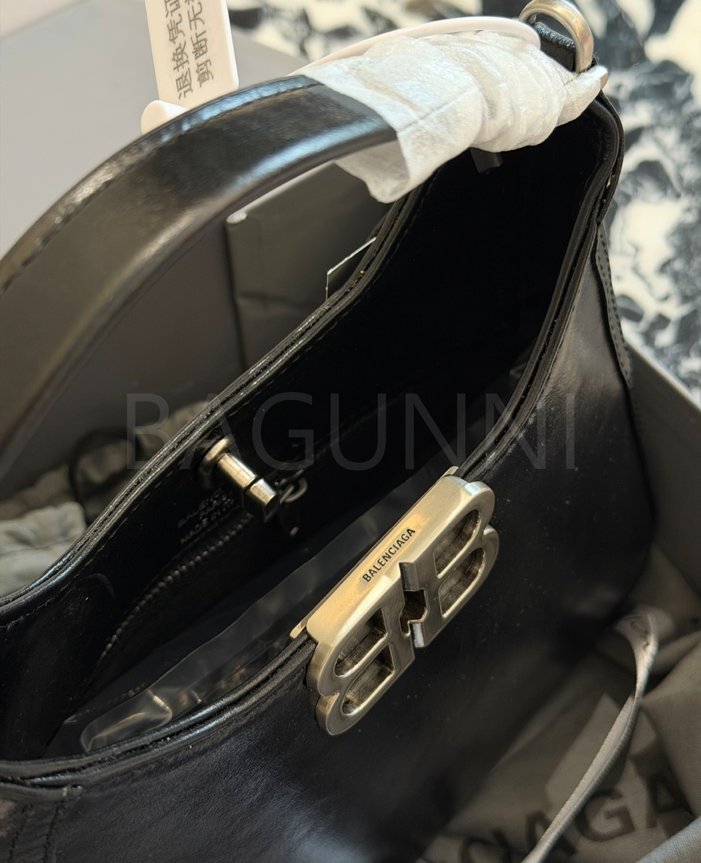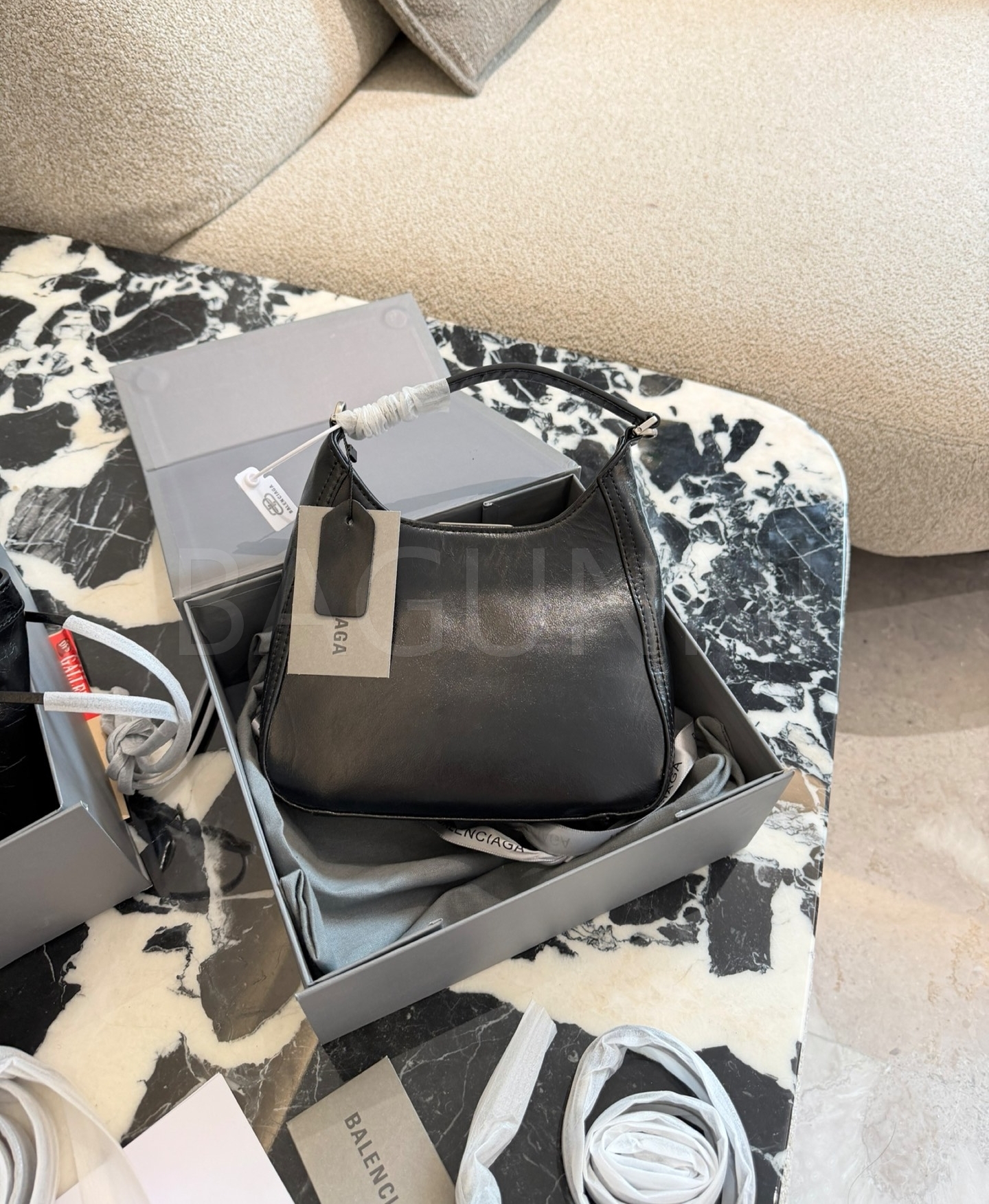 발렌시아가 BB 소프트 호보백입니다. 가죽 특유의 질감이 자연스럽게 살아 있으며 실버 톤이 어우러져 브랜드 특유의 분위기를 편하게 즐기기 좋습니다.