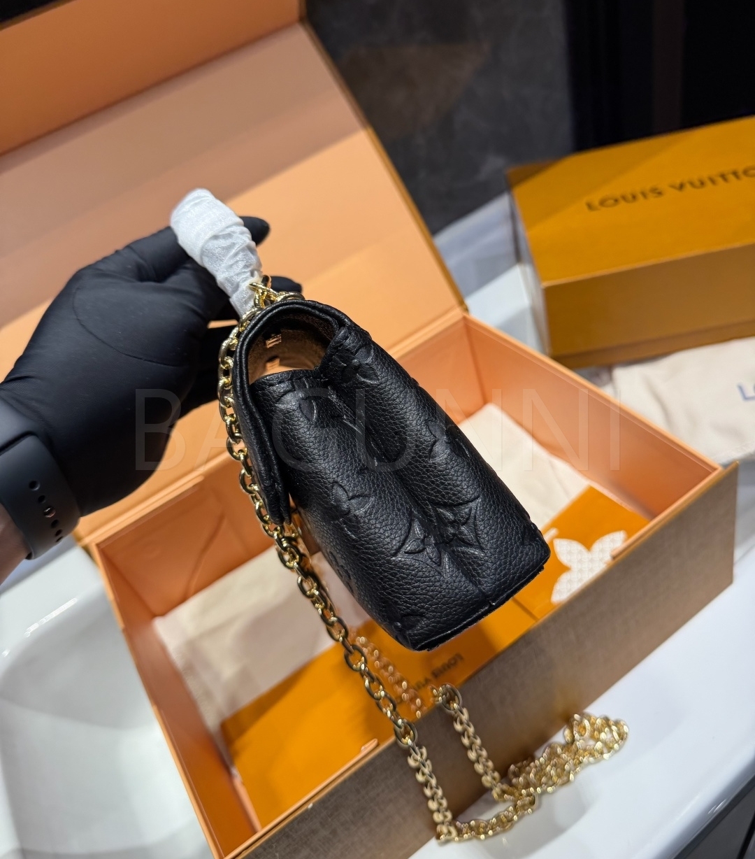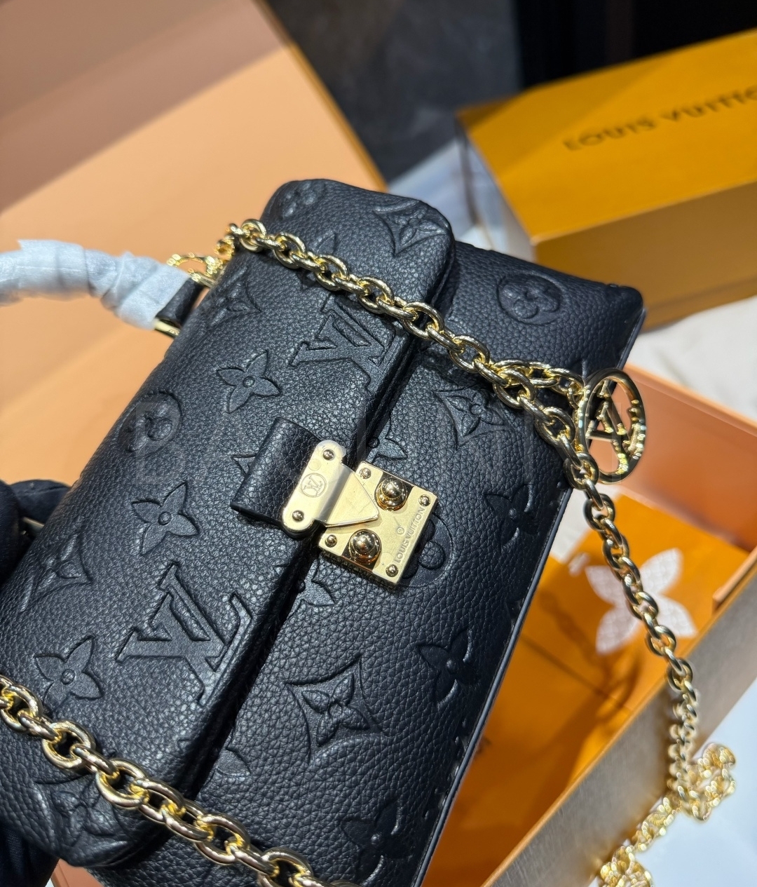 입체적인 엠보싱 가죽 질감이 매력적인 루이비통 앙프렝뜨 마들렌 BB입니다.