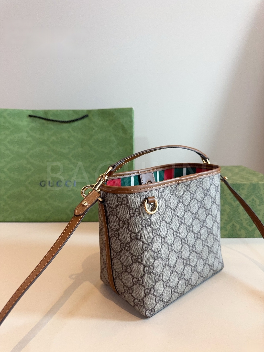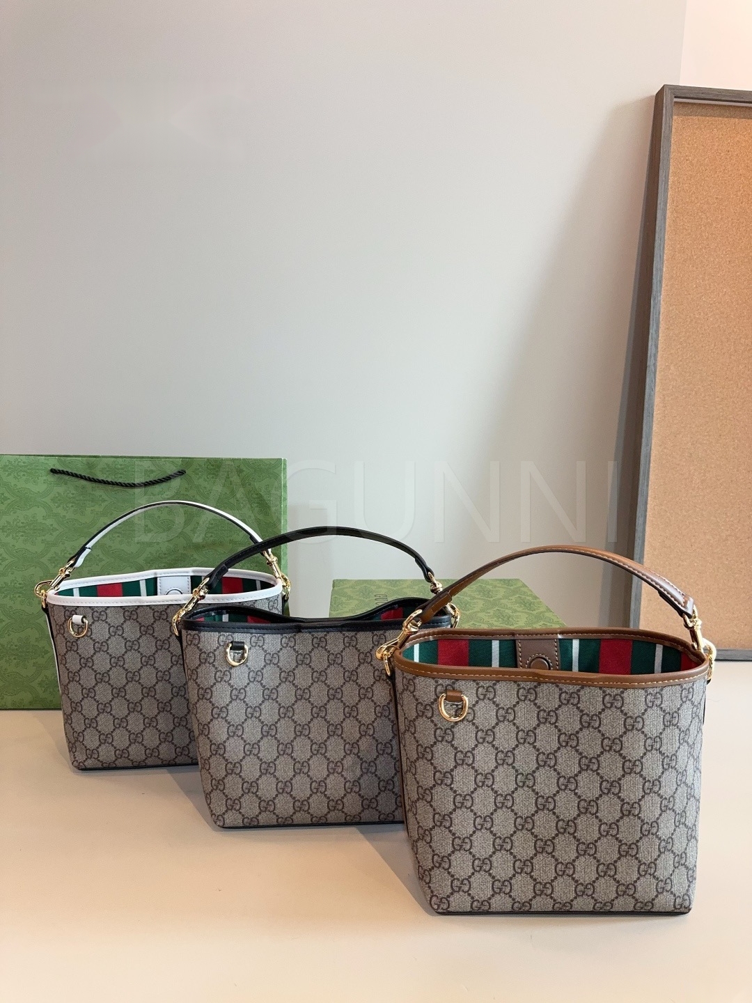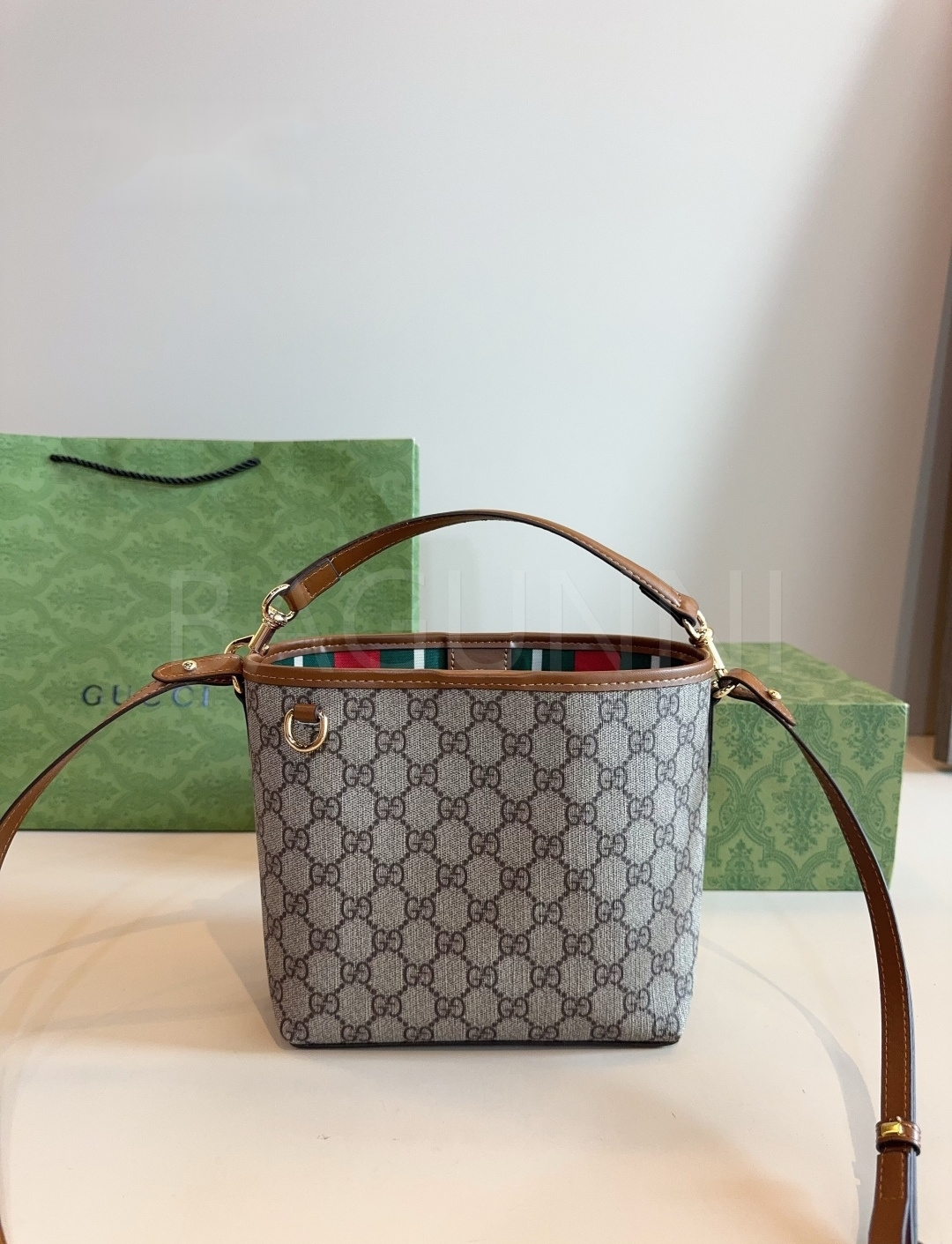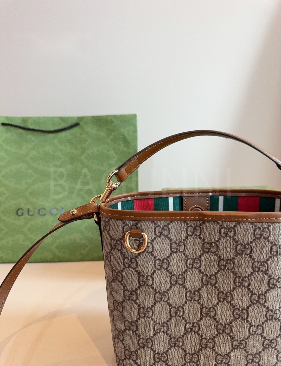 구찌 GG 패턴 버킷백입니다. 가죽 특유의 질감이 자연스럽게 살아 있으며 브랜드 특유의 분위기를 편하게 즐기기 좋습니다.