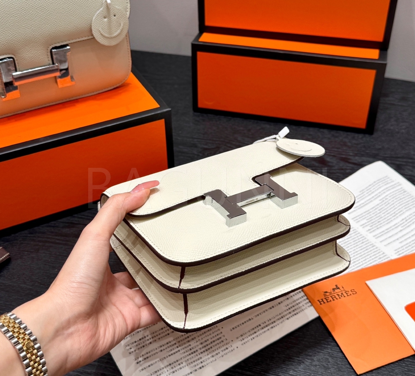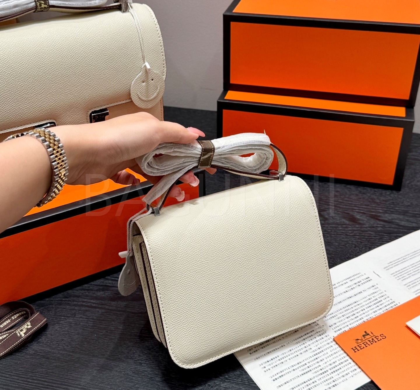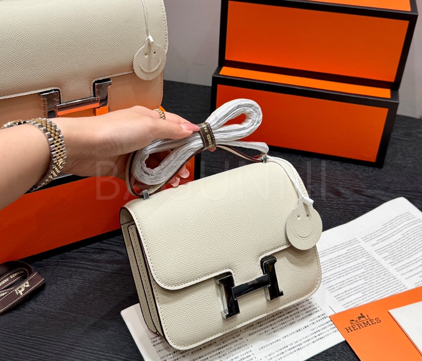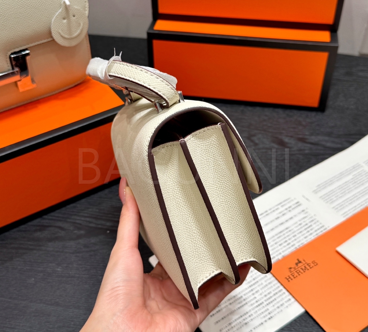 에르메스 콘스탄스 숄더백입니다. 가죽 특유의 질감이 자연스럽게 살아 있으며 브랜드 특유의 분위기를 편하게 즐기기 좋습니다.