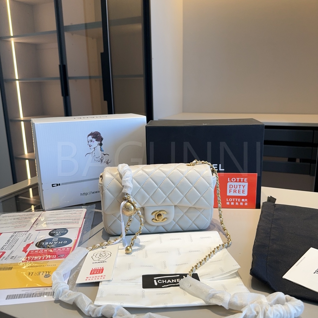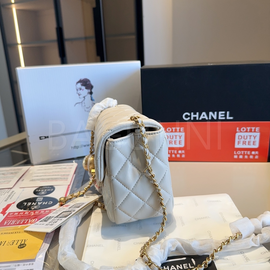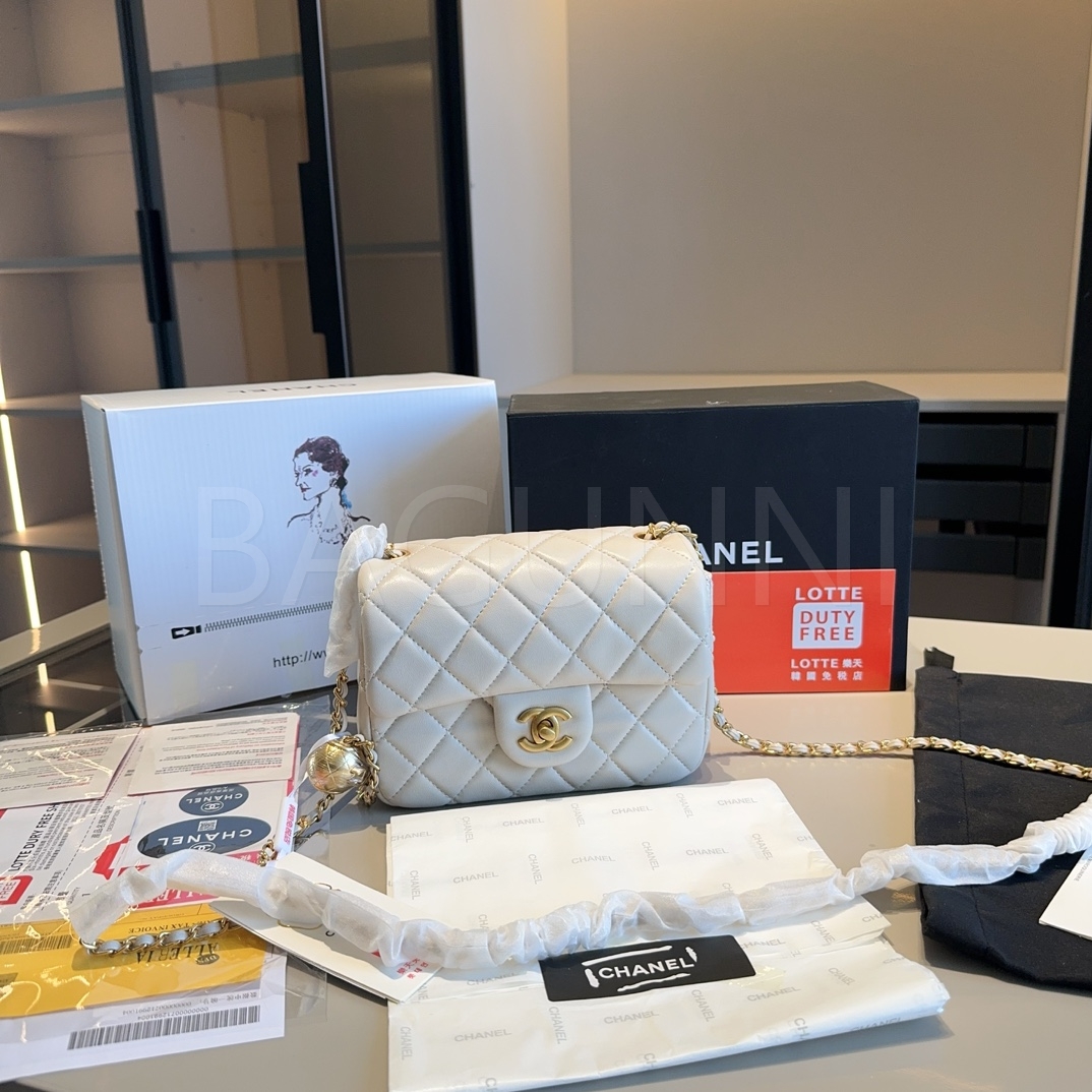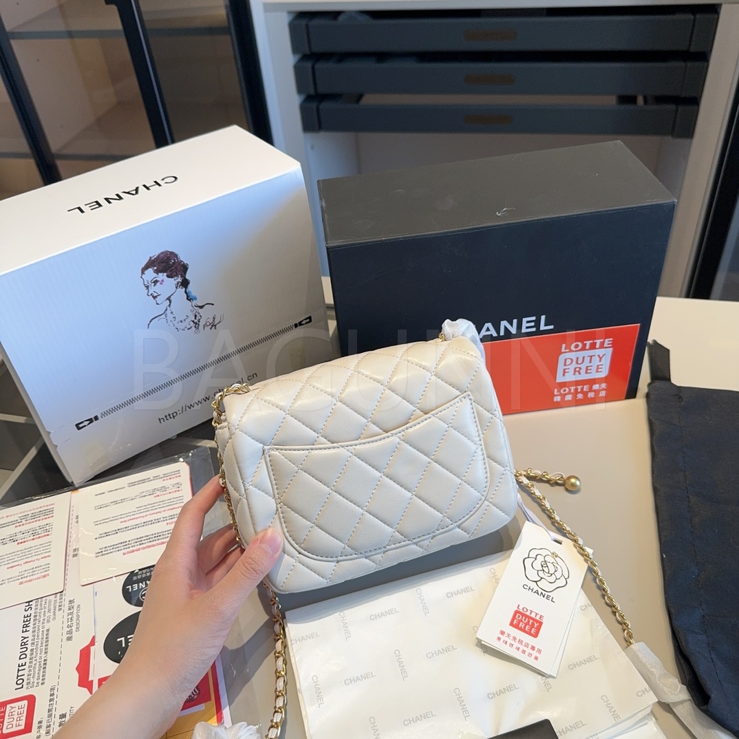 램스킨 특유의 매력이 돋보이는 샤넬 금볼 스퀘어 플랩 백입니다.