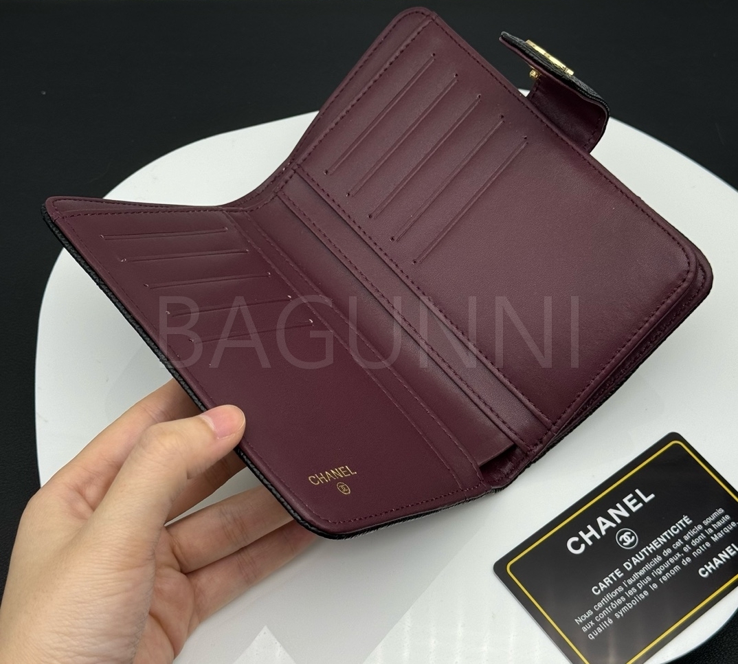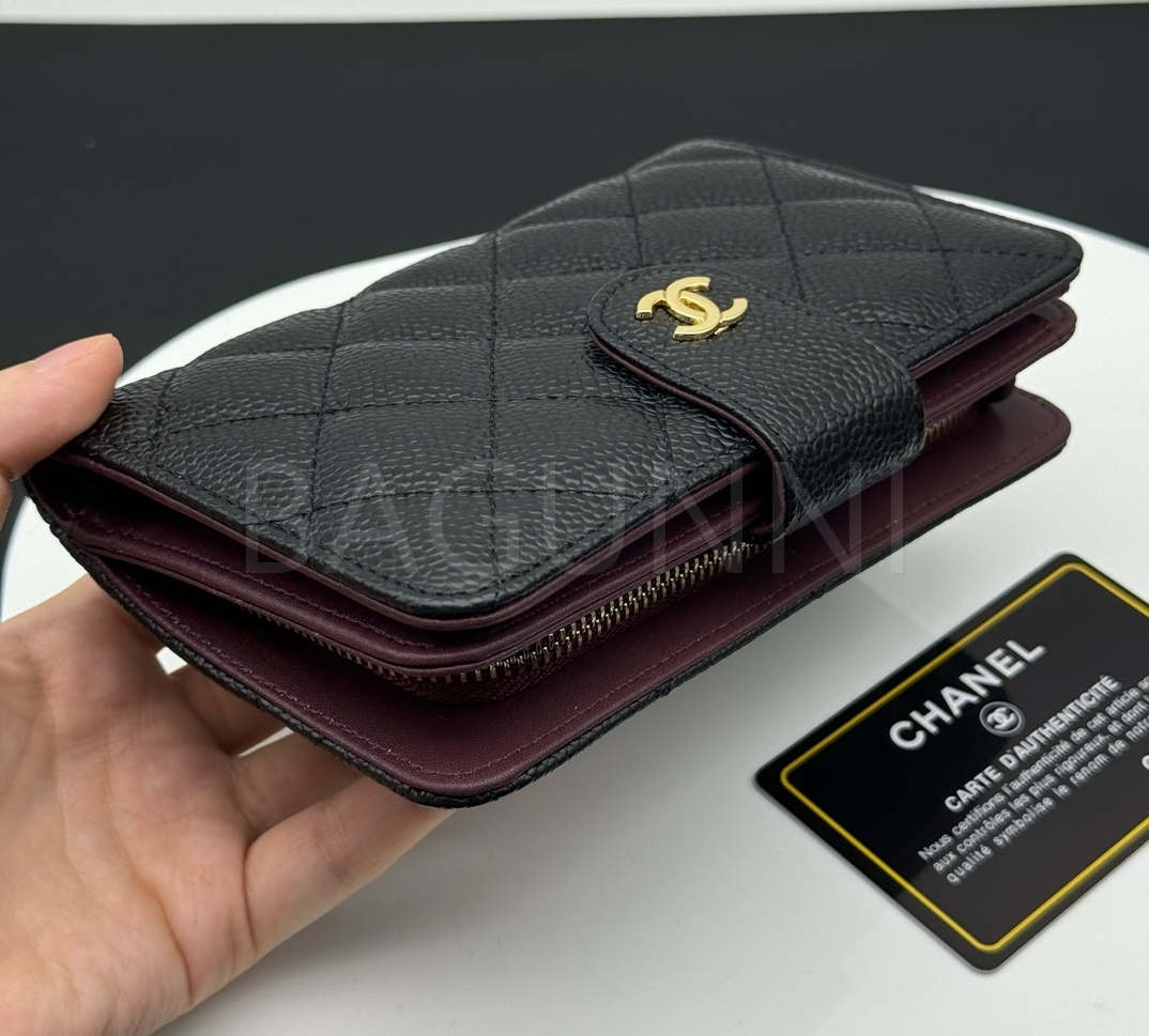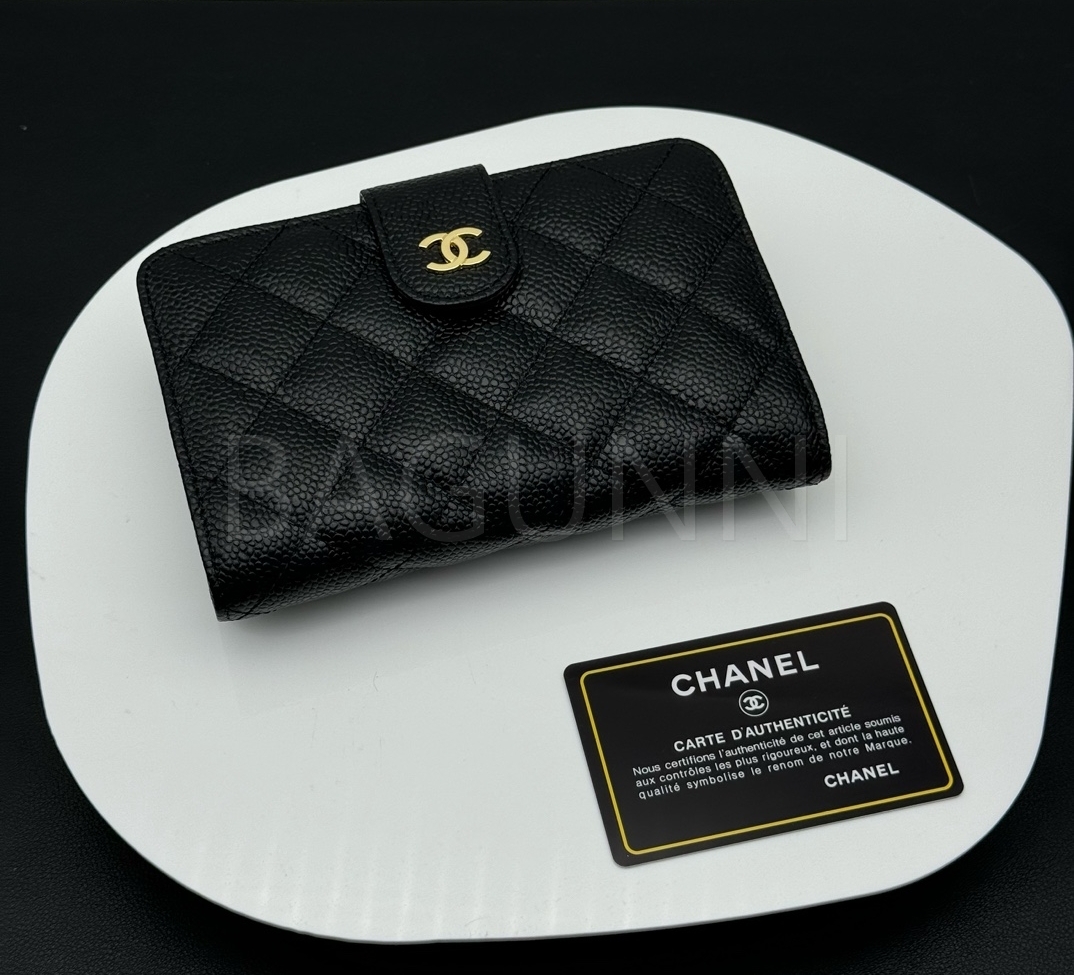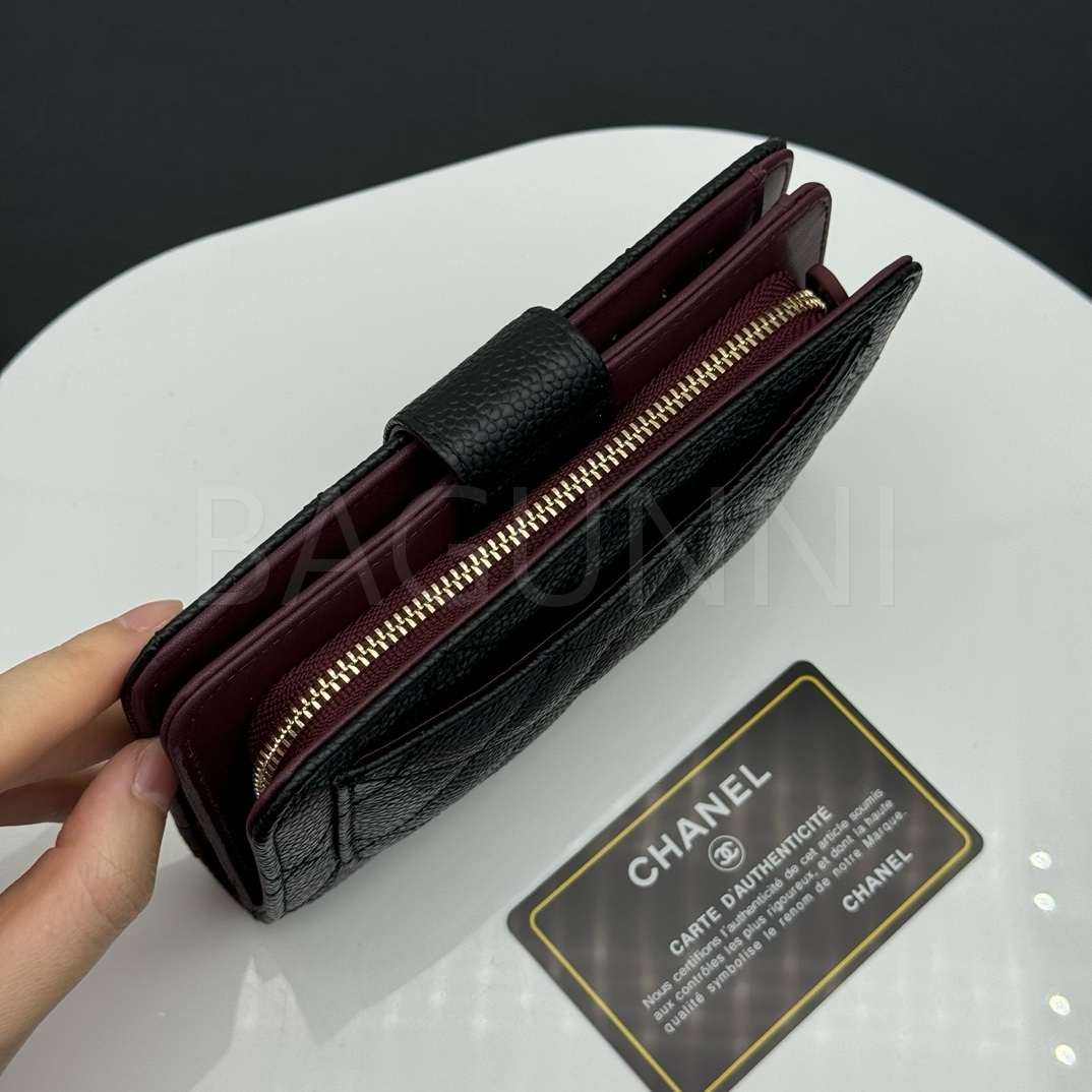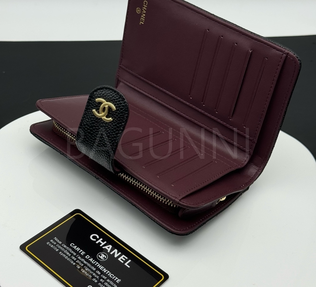 카프스킨의 질감이 돋보이는 샤넬 지갑입니다.
