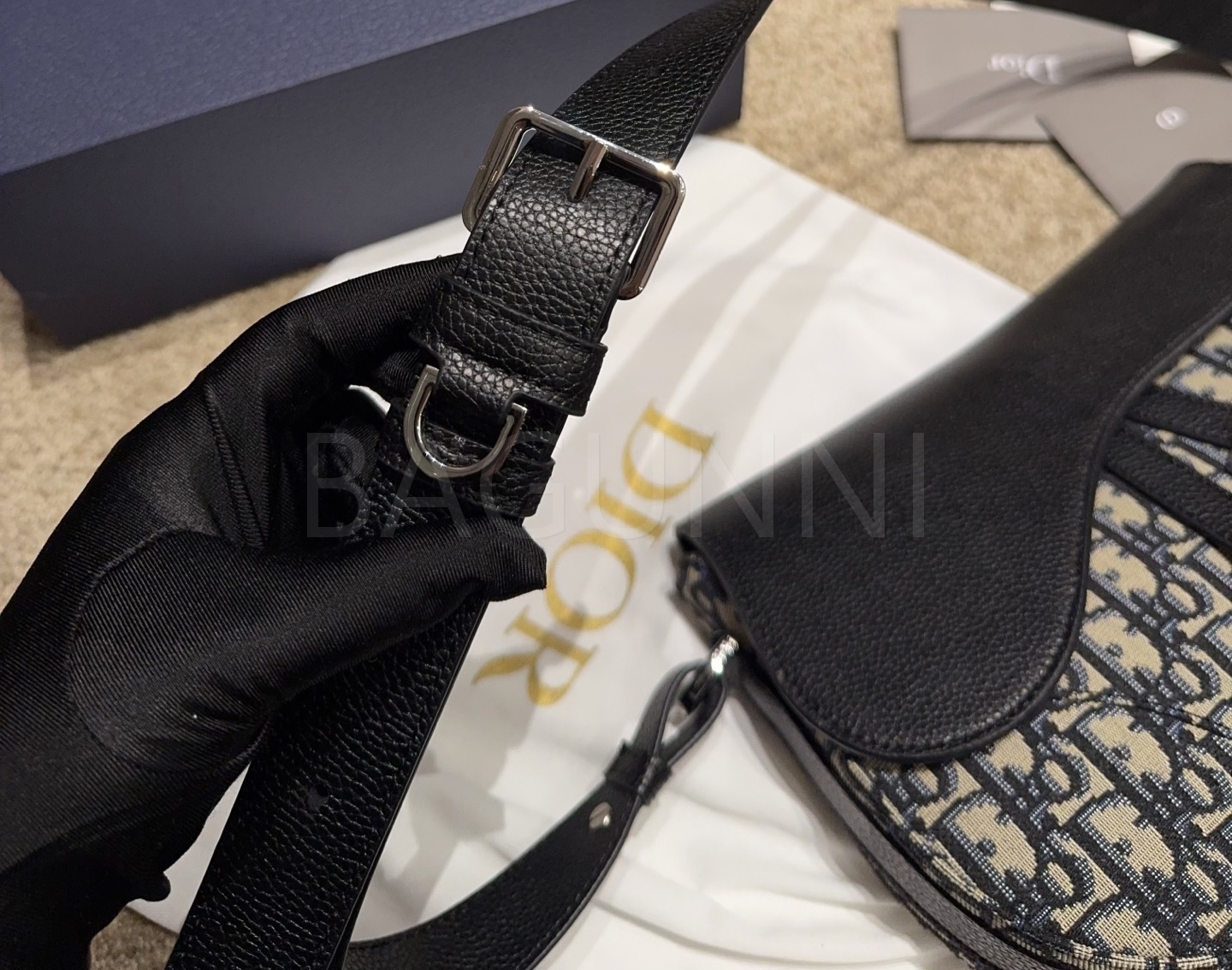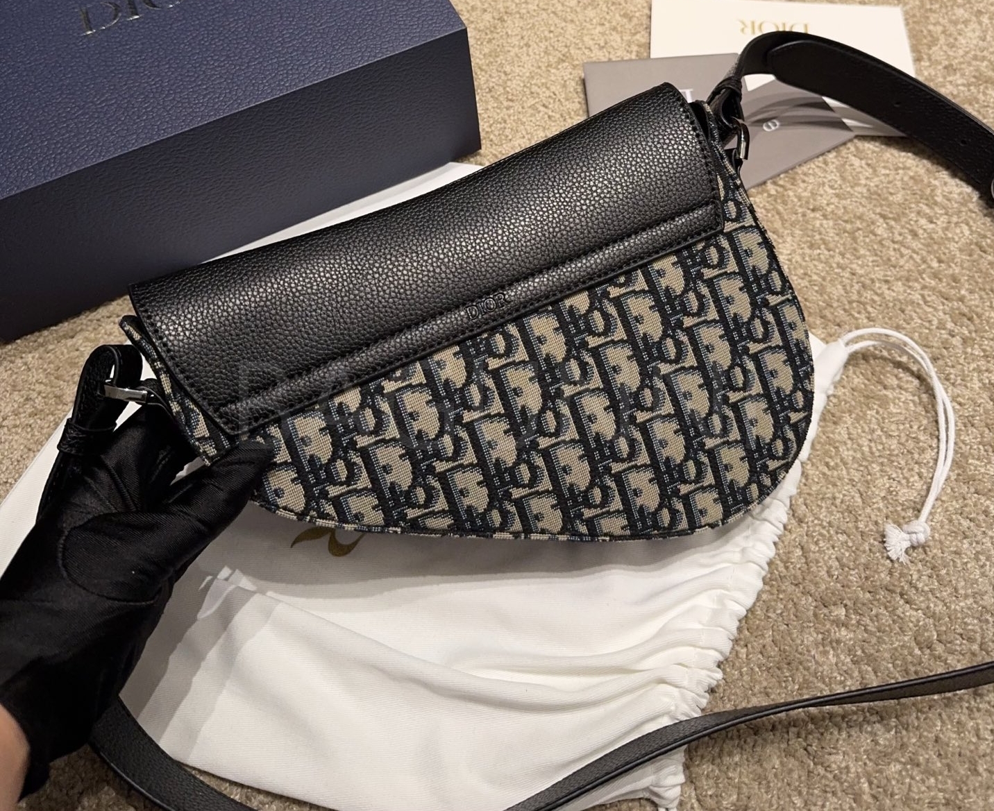 디올 새들 숄더백입니다. 가죽 특유의 질감이 자연스럽게 살아 있으며 블랙, 골드 톤이 어우러져 브랜드 특유의 분위기를 편하게 즐기기 좋습니다.