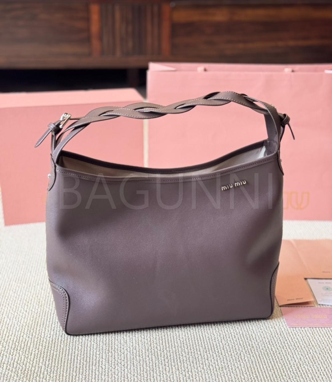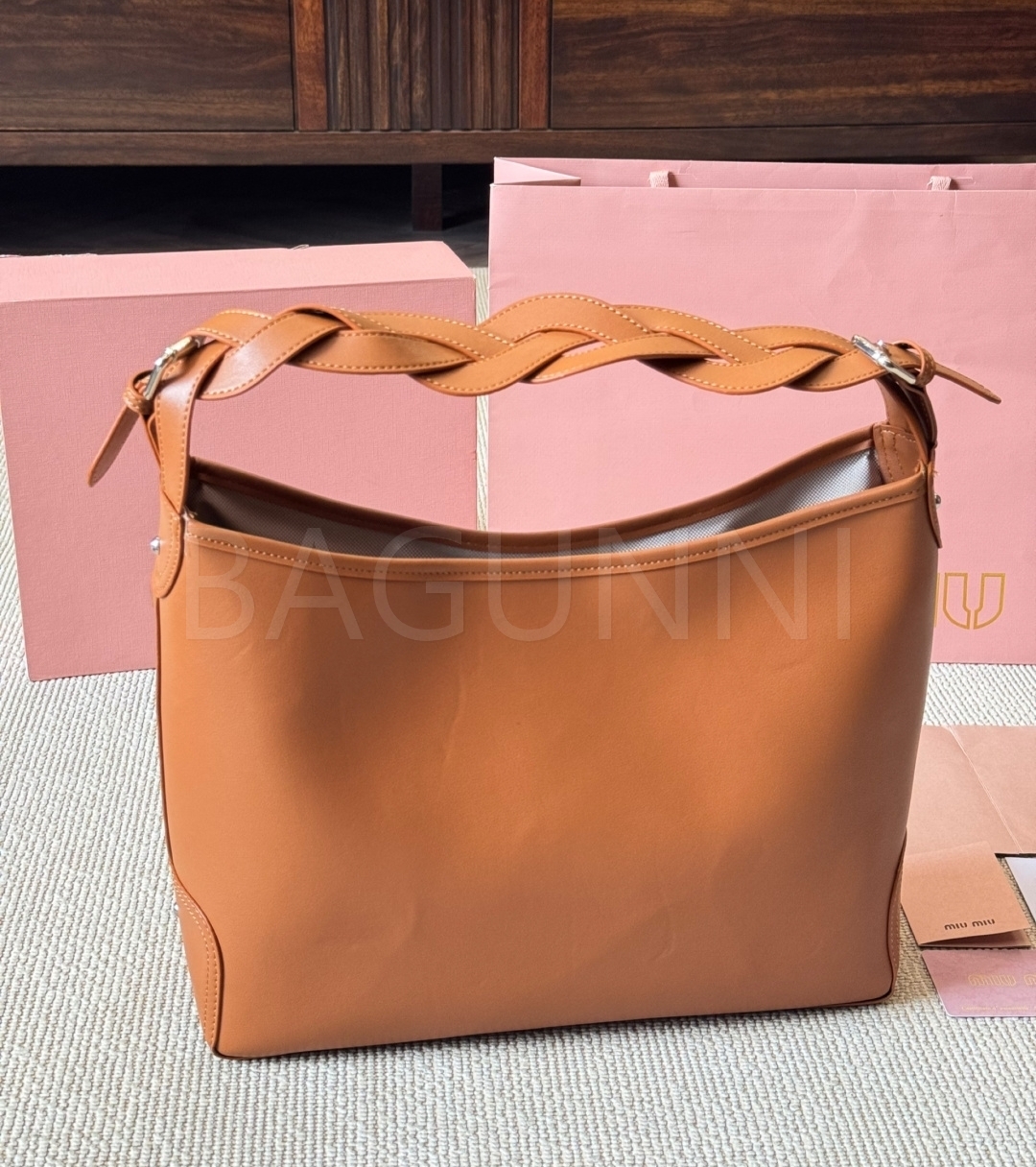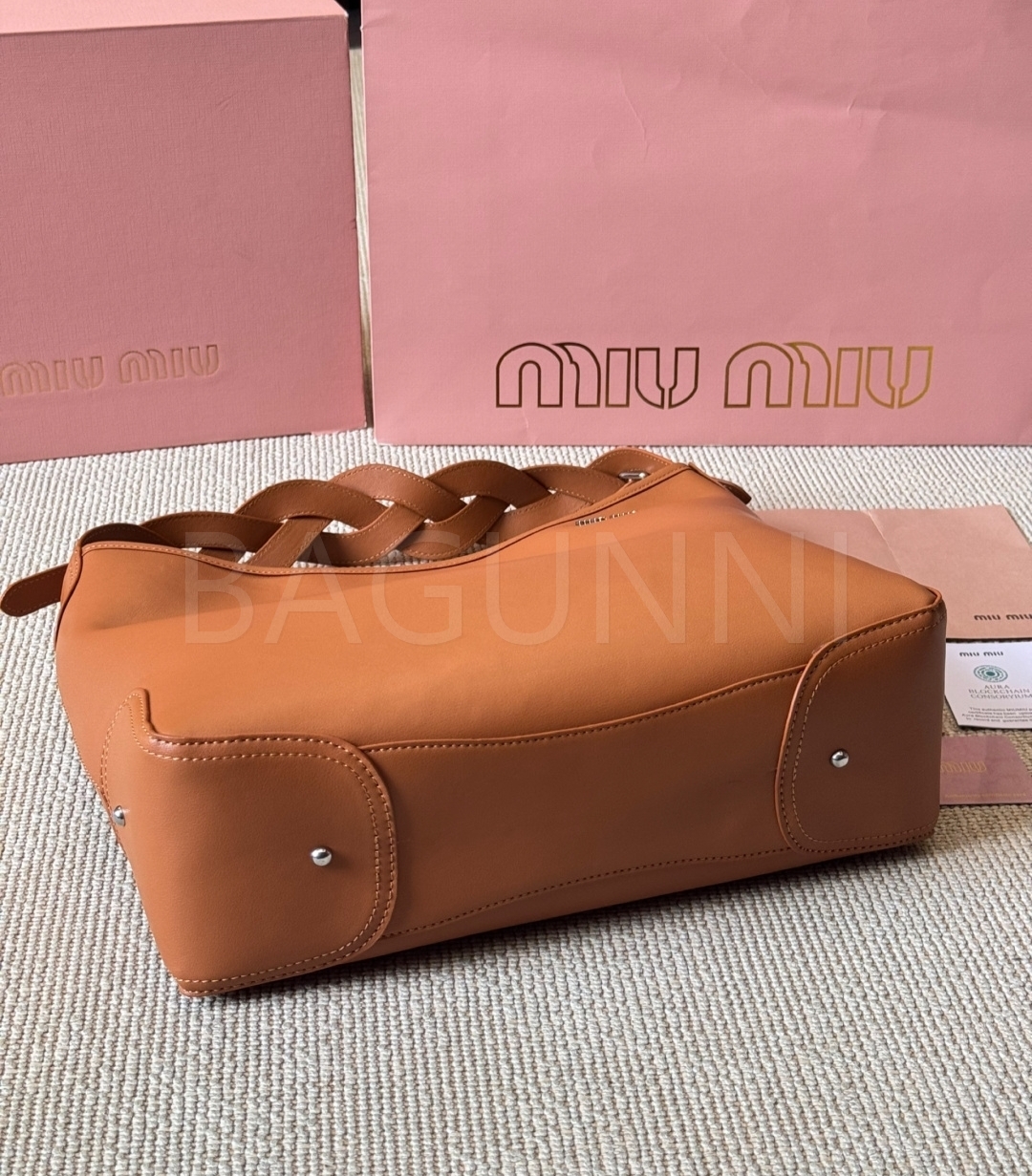 미우미우 워크 토트백입니다. 브라운 톤이 어우러져 브랜드 특유의 분위기를 편하게 즐기기 좋습니다.