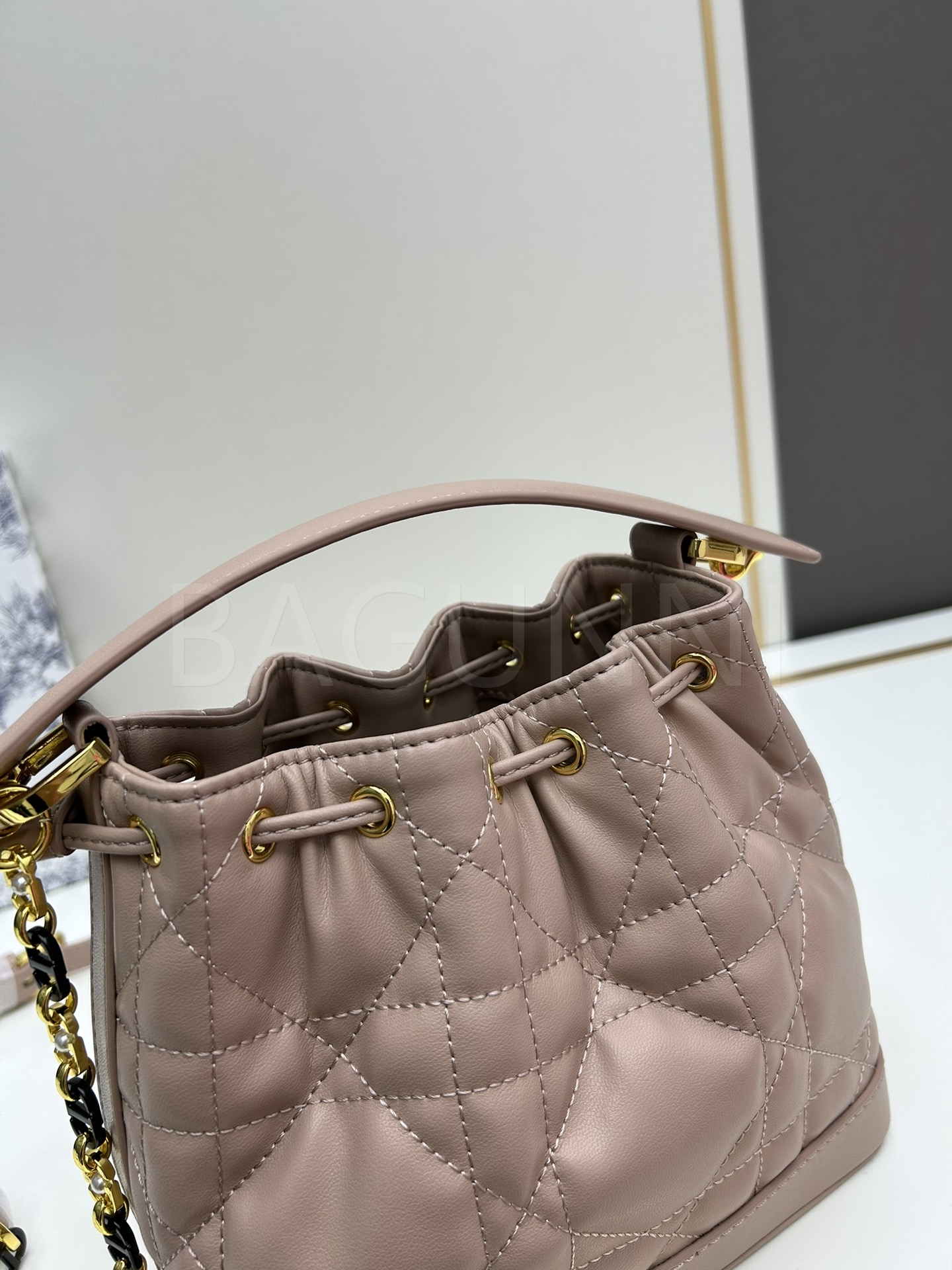 디올 졸리 버킷백입니다. 가죽 특유의 질감이 자연스럽게 살아 있으며 화이트, 골드 톤이 어우러져 브랜드 특유의 분위기를 편하게 즐기기 좋습니다.