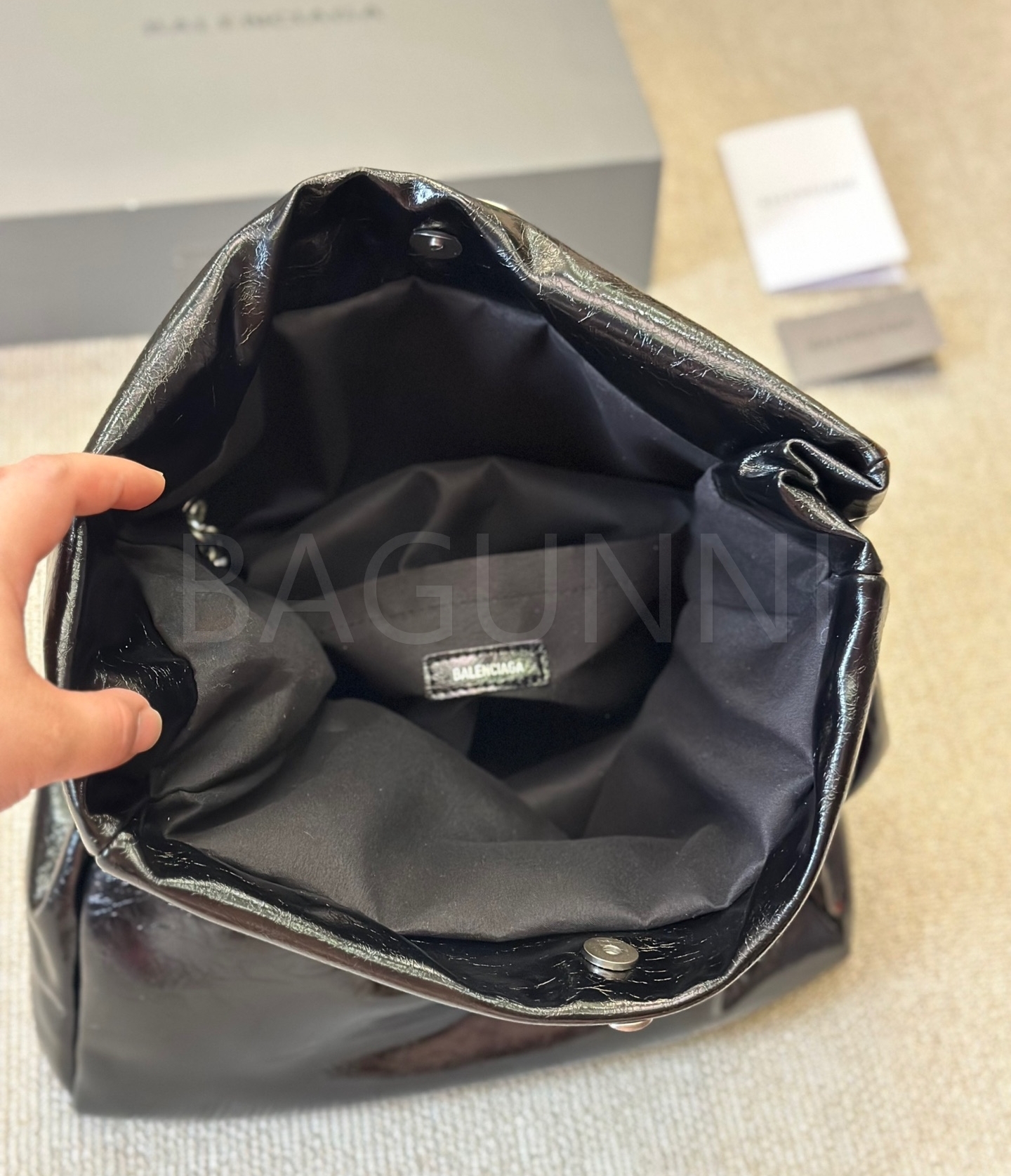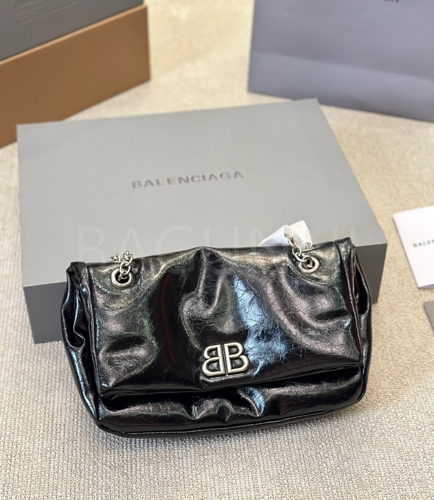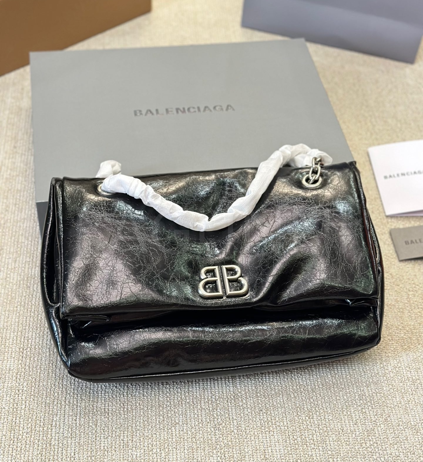 발렌시아가 모나코 체인백입니다. 가죽 특유의 질감이 자연스럽게 살아 있으며 브랜드 특유의 분위기를 편하게 즐기기 좋습니다.
