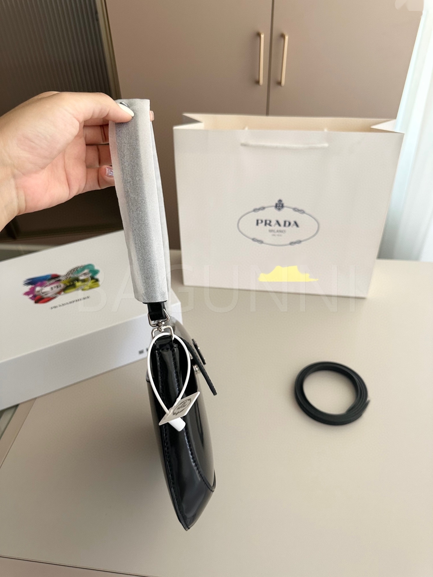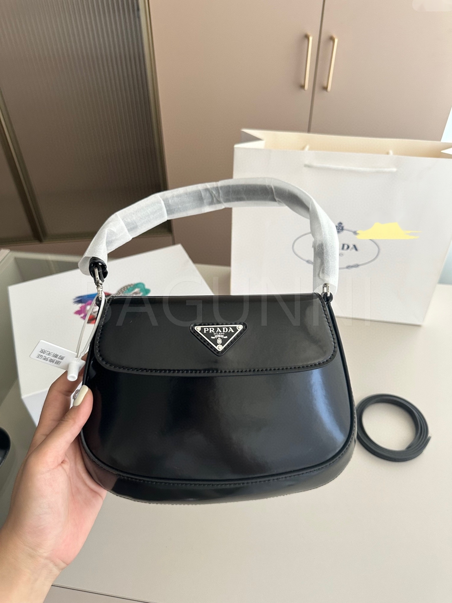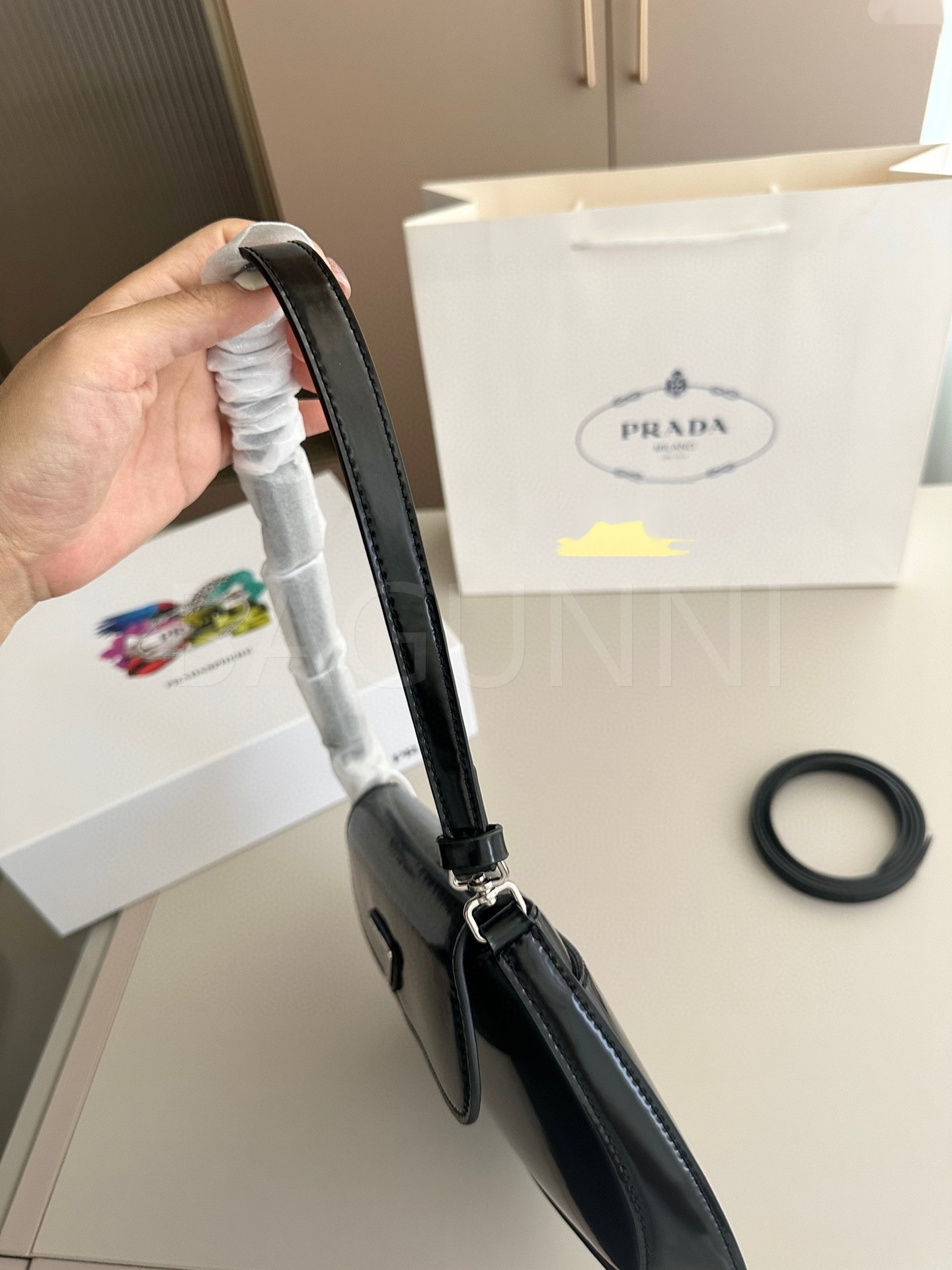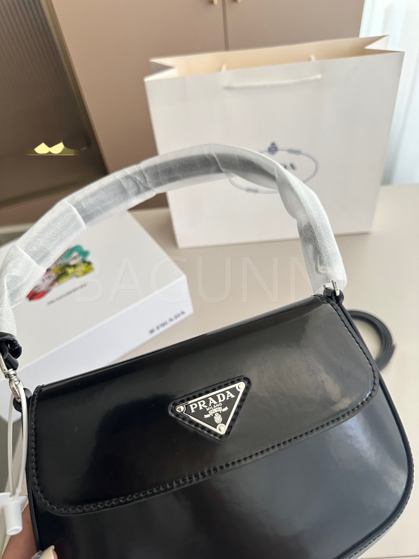 프라다 페이턴트 숄더백입니다. 페이턴트 가죽 특유의 질감이 자연스럽게 살아 있으며 브랜드 특유의 분위기를 편하게 즐기기 좋습니다.
