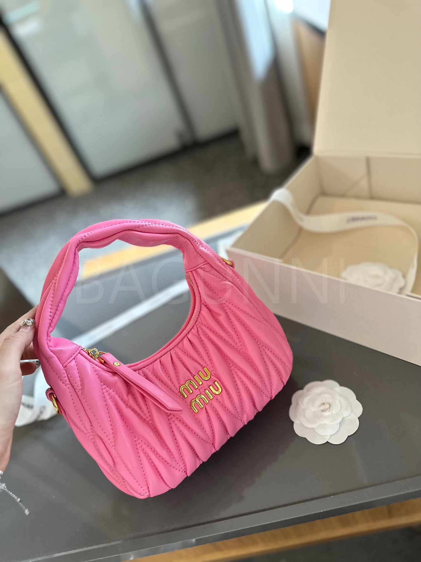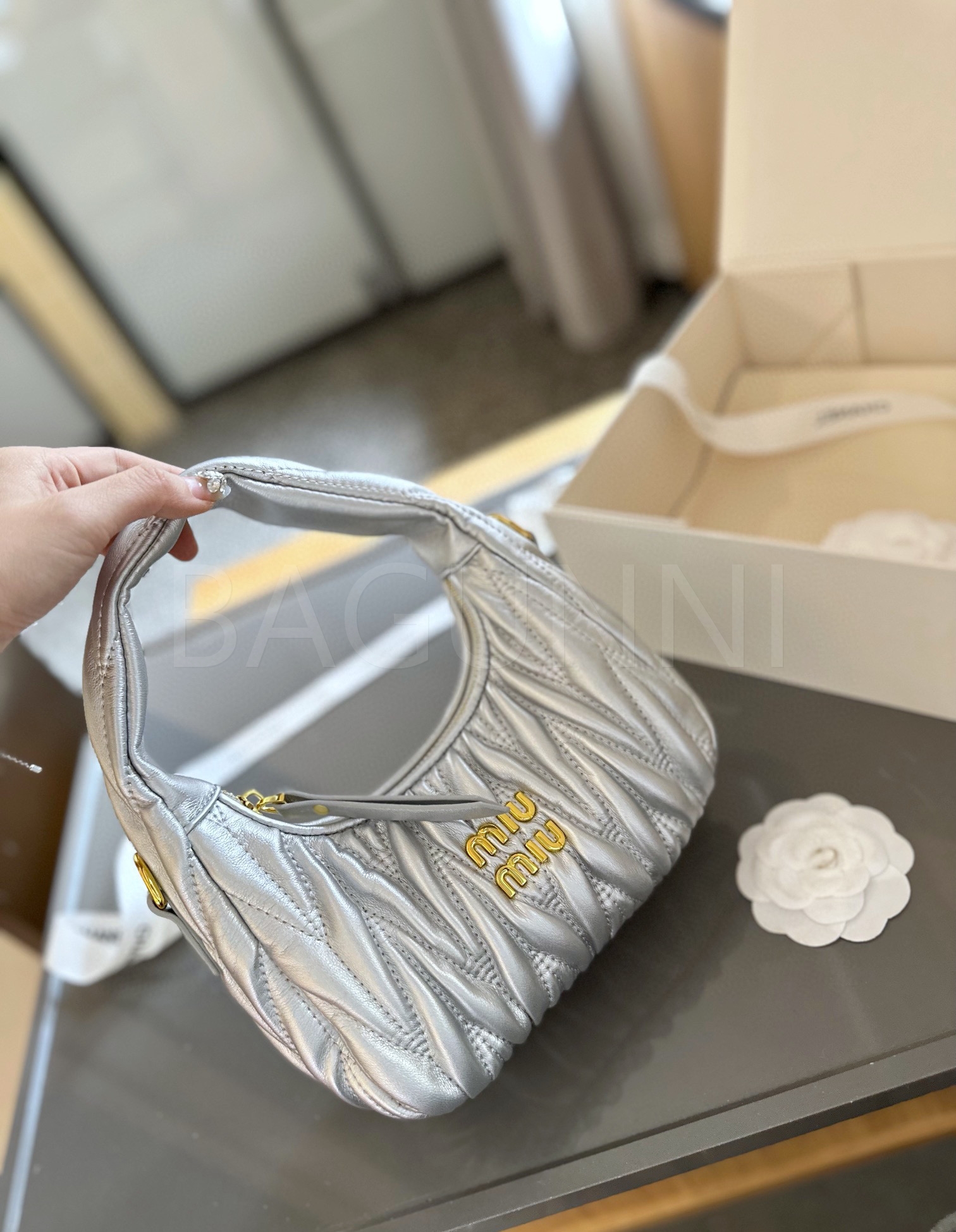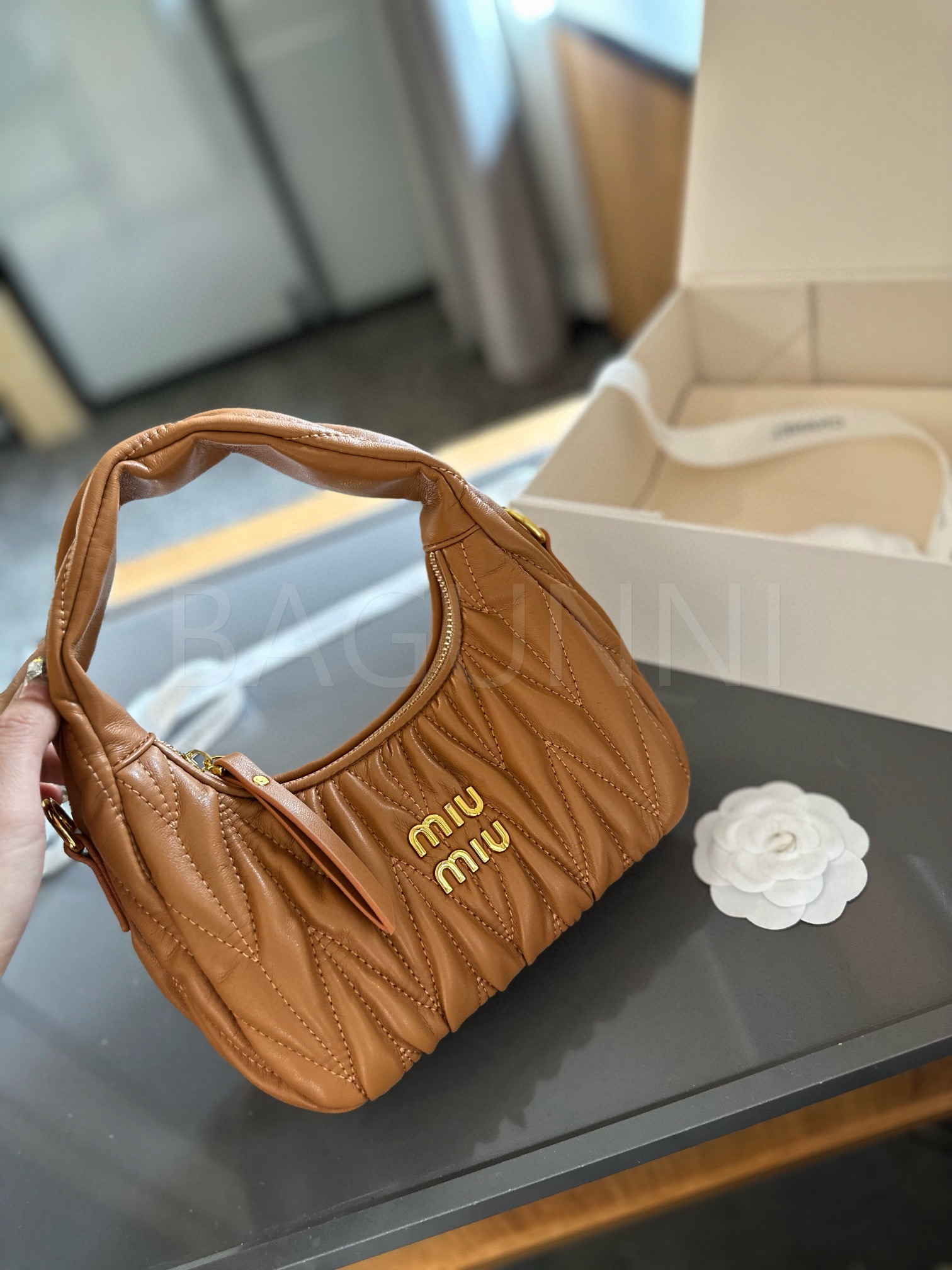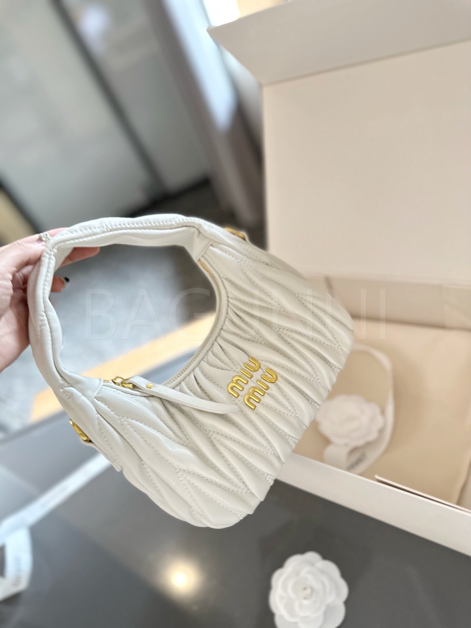 미우미우 숄더백입니다. 램스킨 특유의 질감이 자연스럽게 살아 있으며 브랜드 특유의 분위기를 편하게 즐기기 좋습니다.