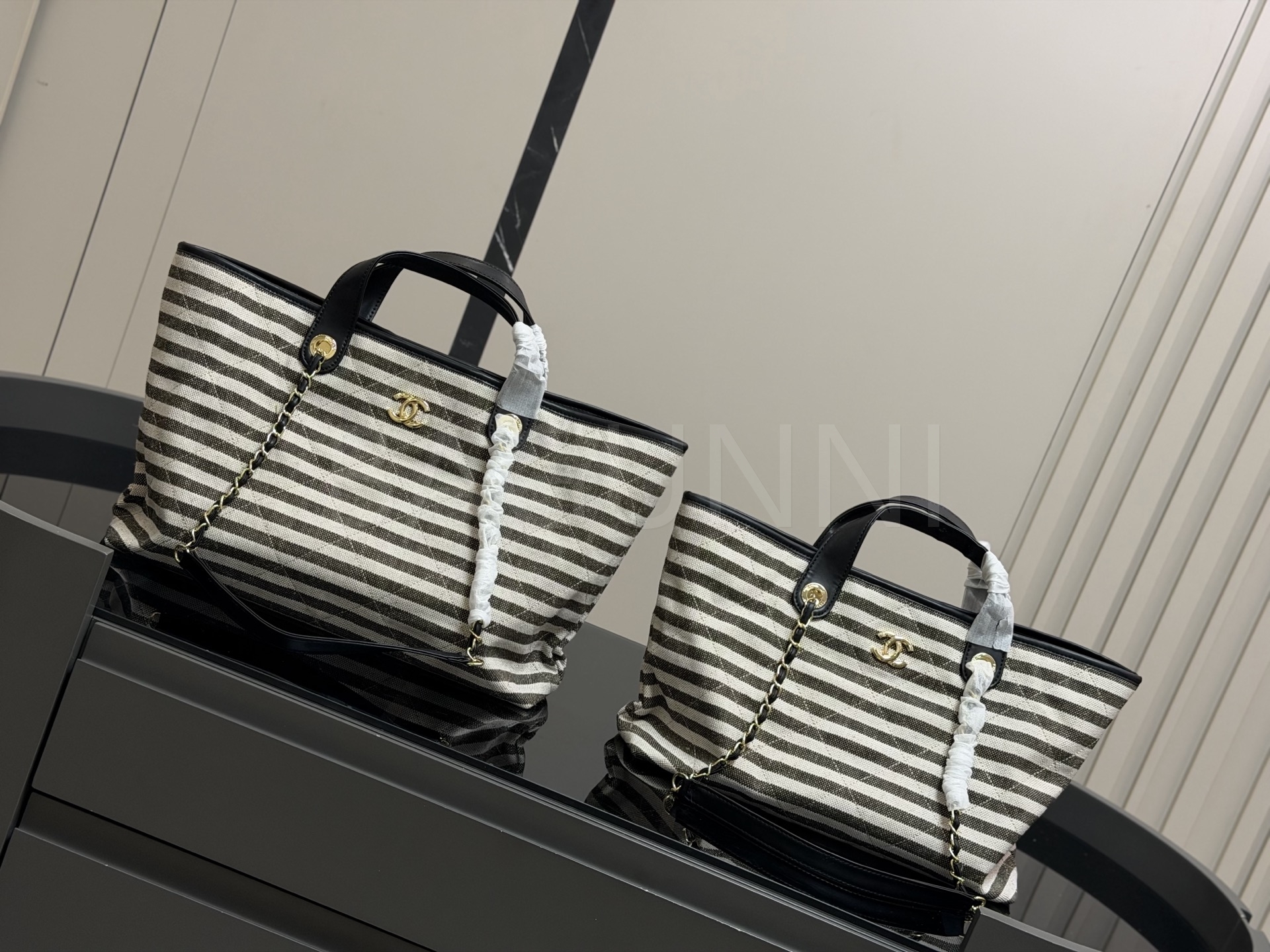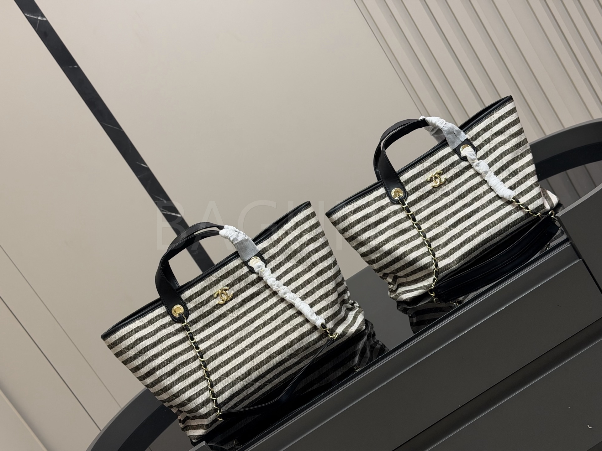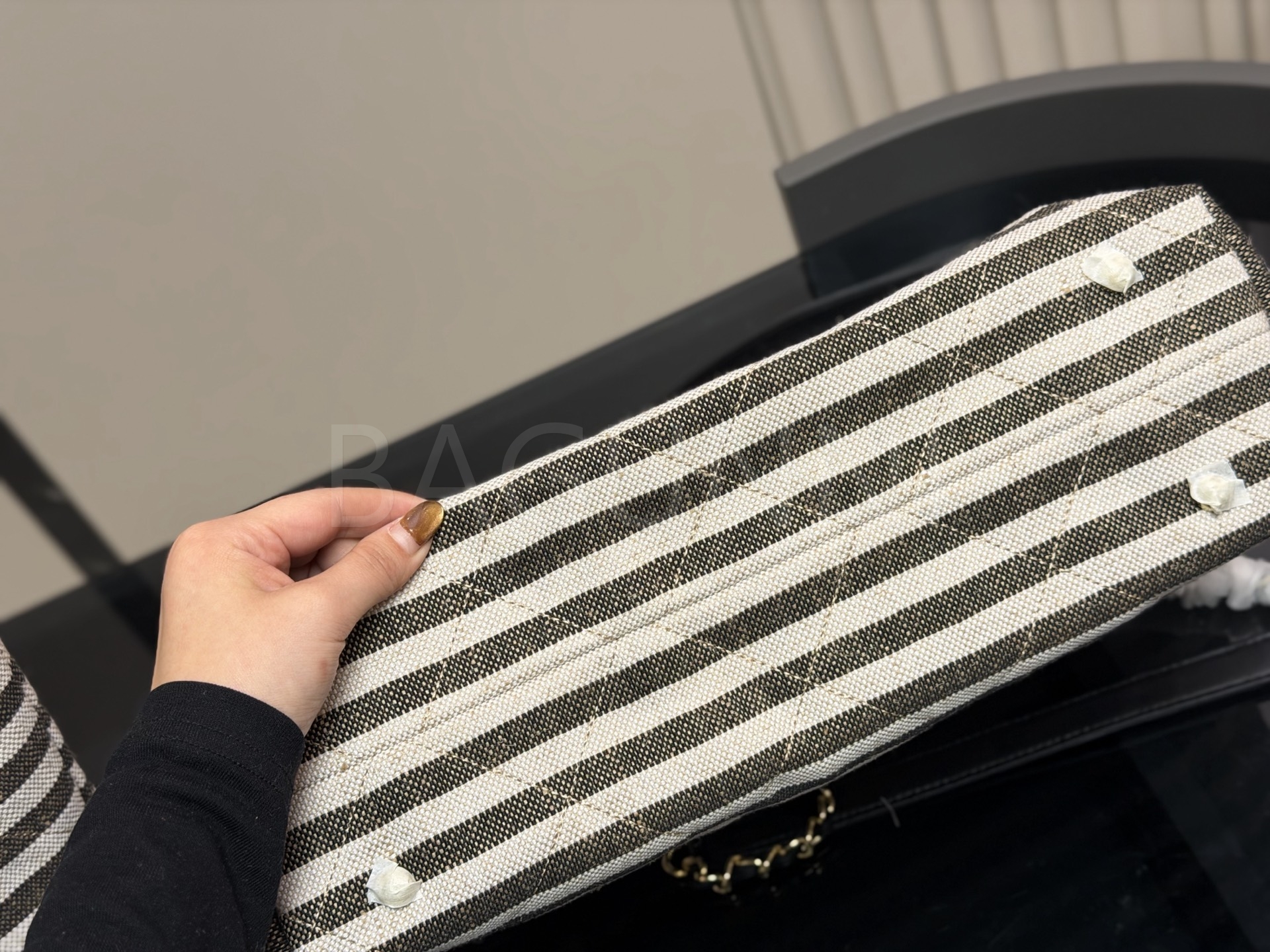 스트라이프 패턴이 시선을 끄는 샤넬 체인 토트백입니다.