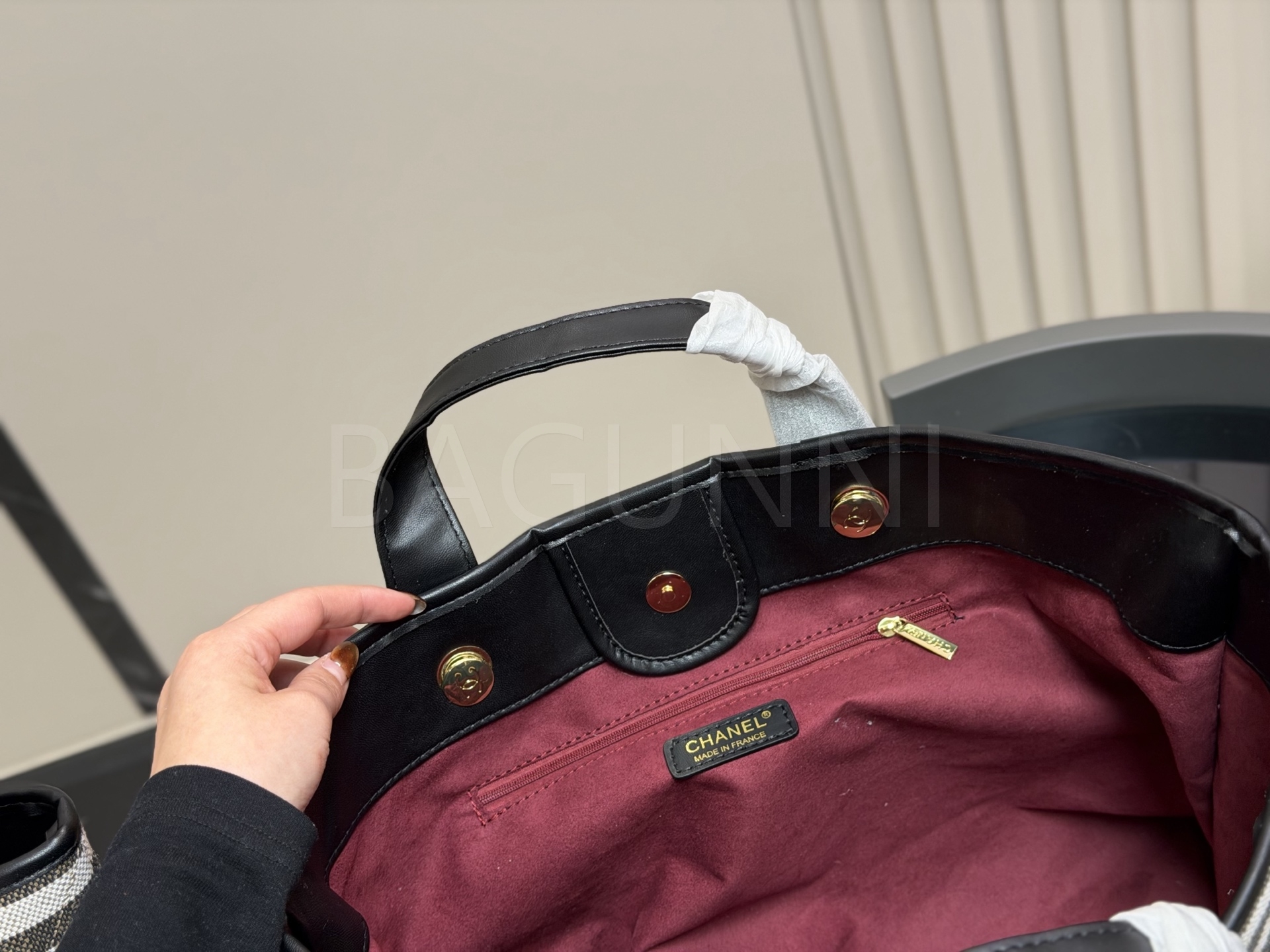 가벼운 텍스타일 소재에 블랙 핸들과 체인 디테일이 더해져 캐주얼하면서도 고급스러운 분위기를 연출해주며, 넉넉한 수납력으로 데일리백이나 시즌 포인트 백으로 활용하기 좋습니다. 편안한 무드와 샤넬 특유의 클래식한 감성을 함께 느낄 수 있습니다.