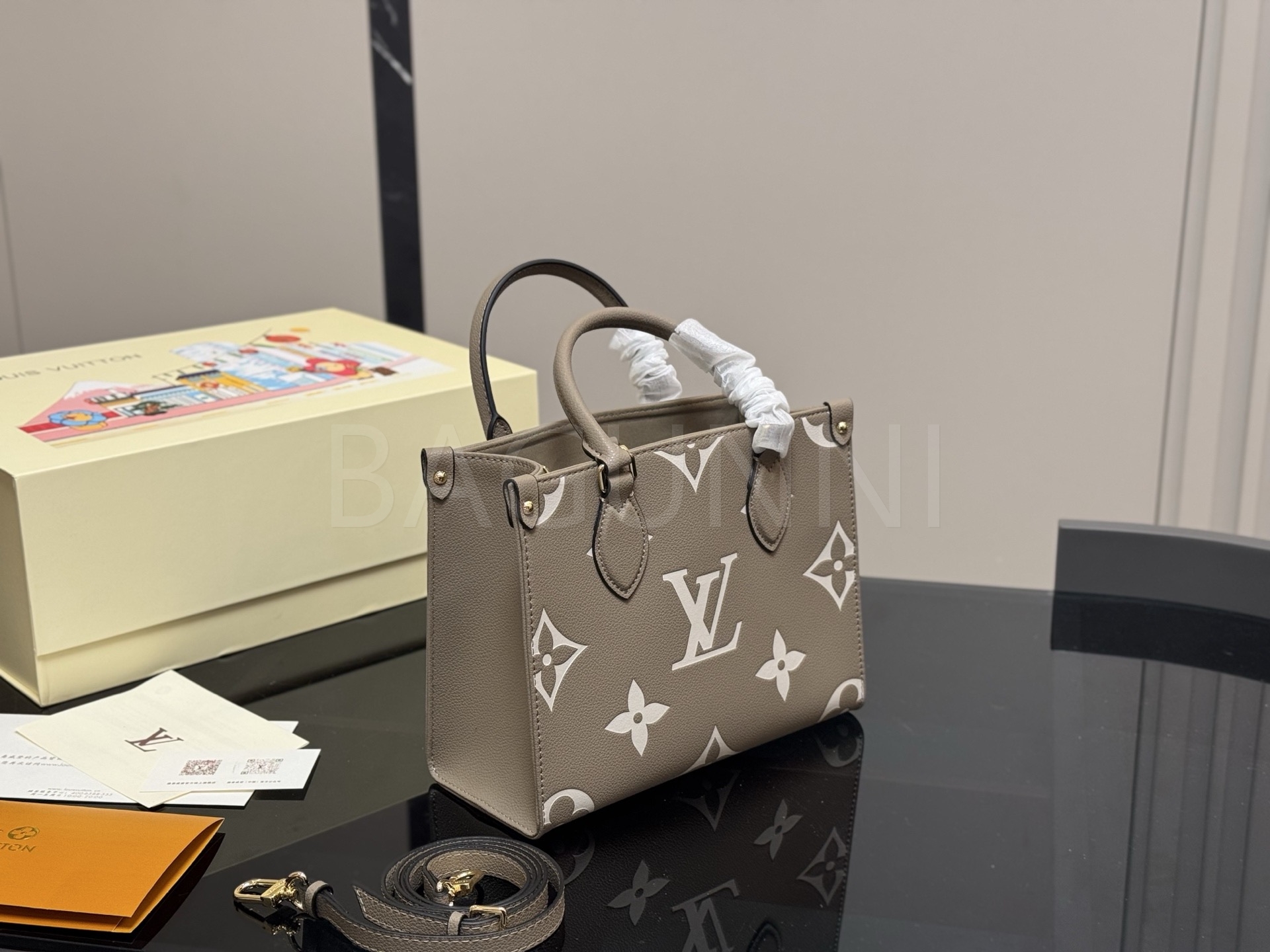 가죽 소재의 매력이 자연스럽게 살아 있는 루이비통 온더고 토트백입니다.