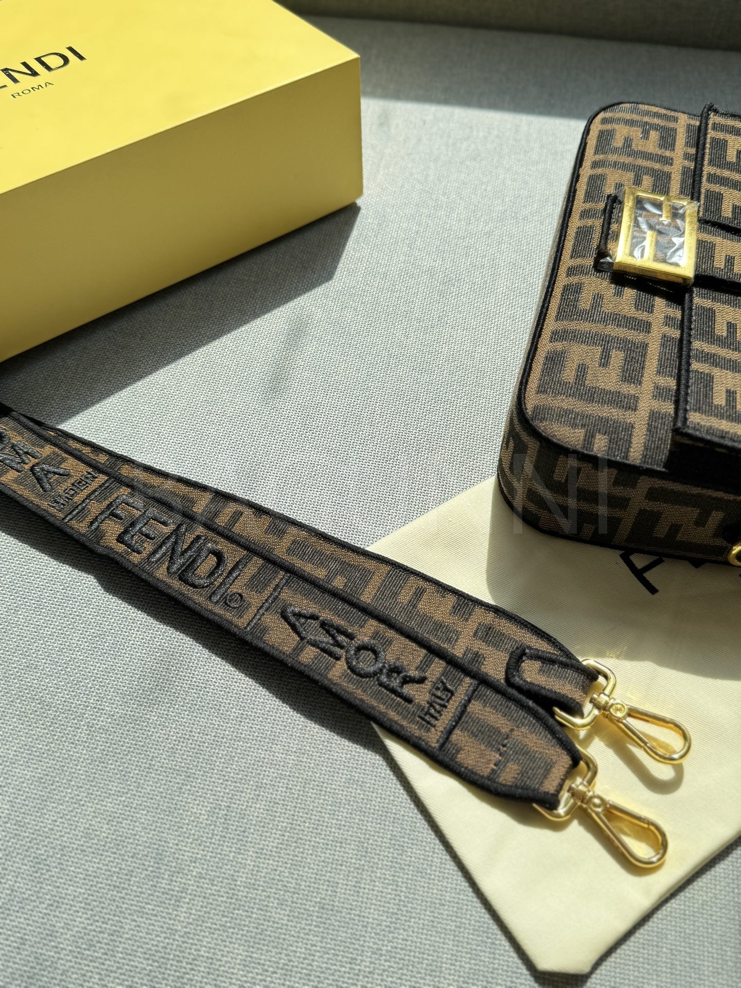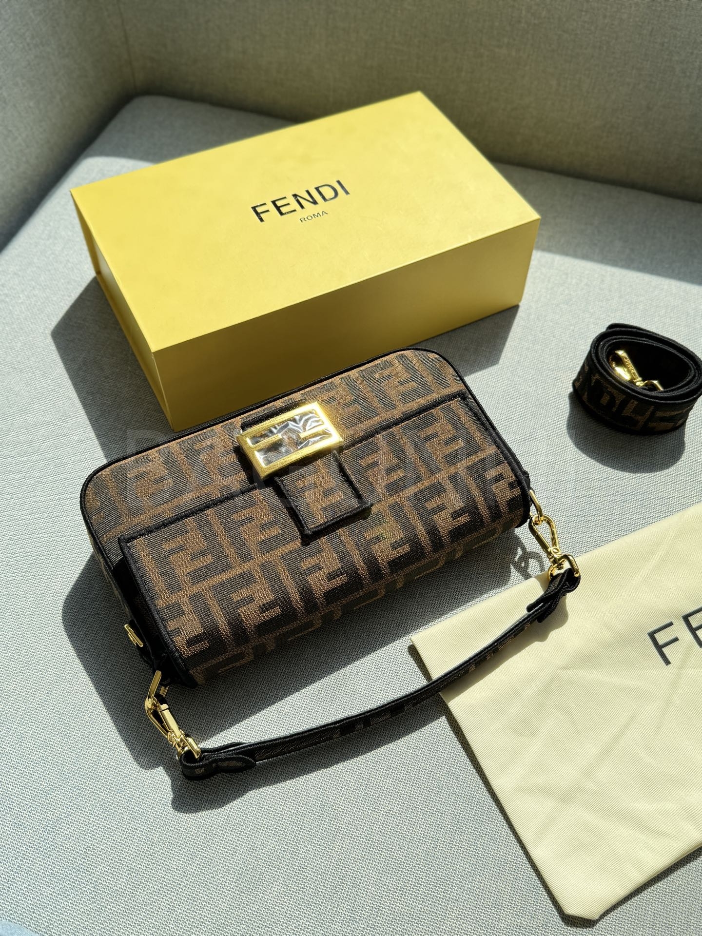 펜디 바게트 크로스백입니다. 카라멜 브라운 톤이 어우러져 브랜드 특유의 분위기를 편하게 즐기기 좋습니다.