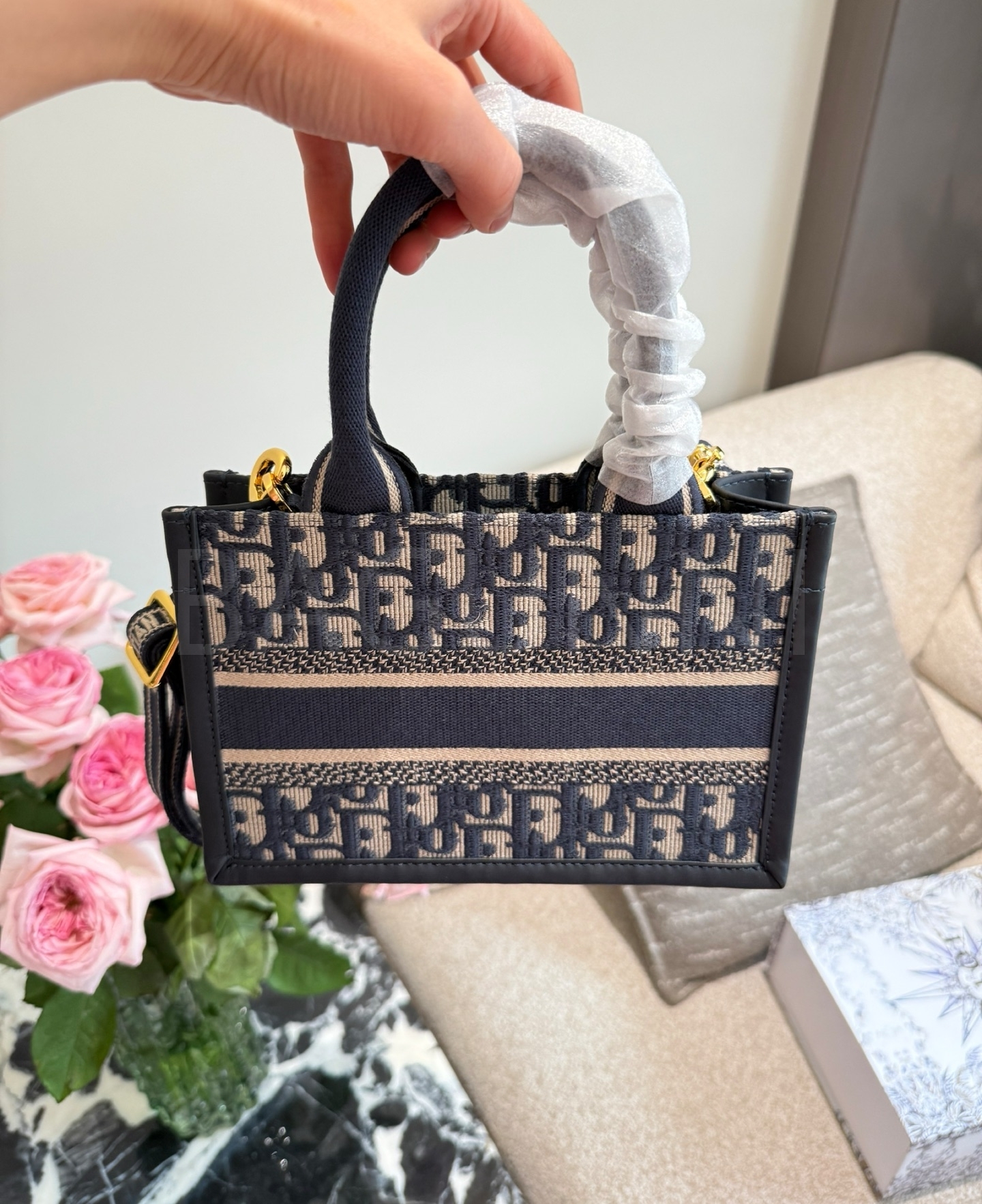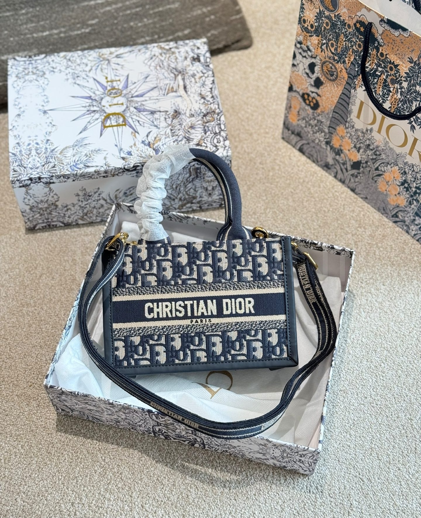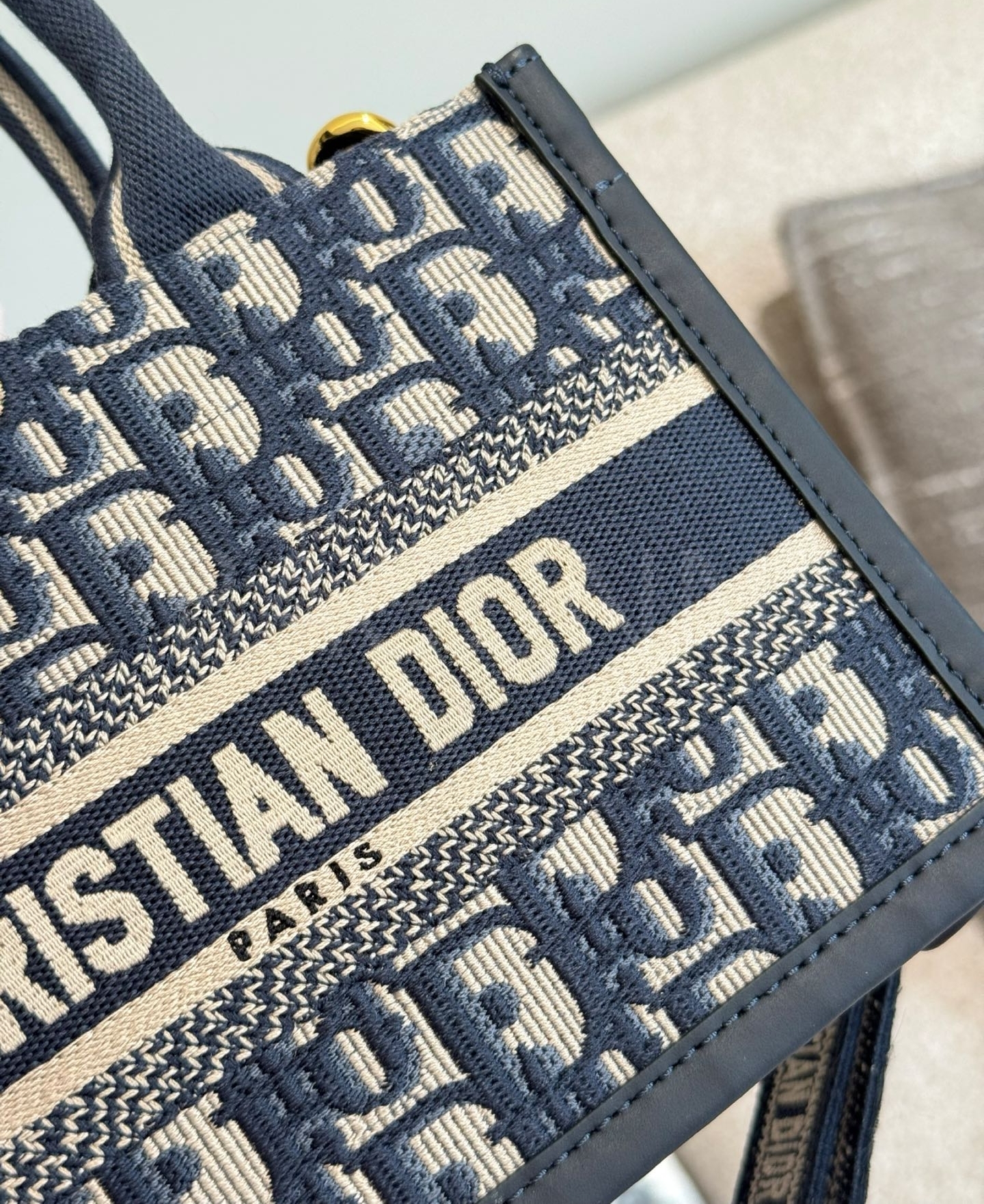 디올 북 토트입니다. 가죽 특유의 질감이 자연스럽게 살아 있으며 골드, 블루 톤이 어우러져 브랜드 특유의 분위기를 편하게 즐기기 좋습니다.