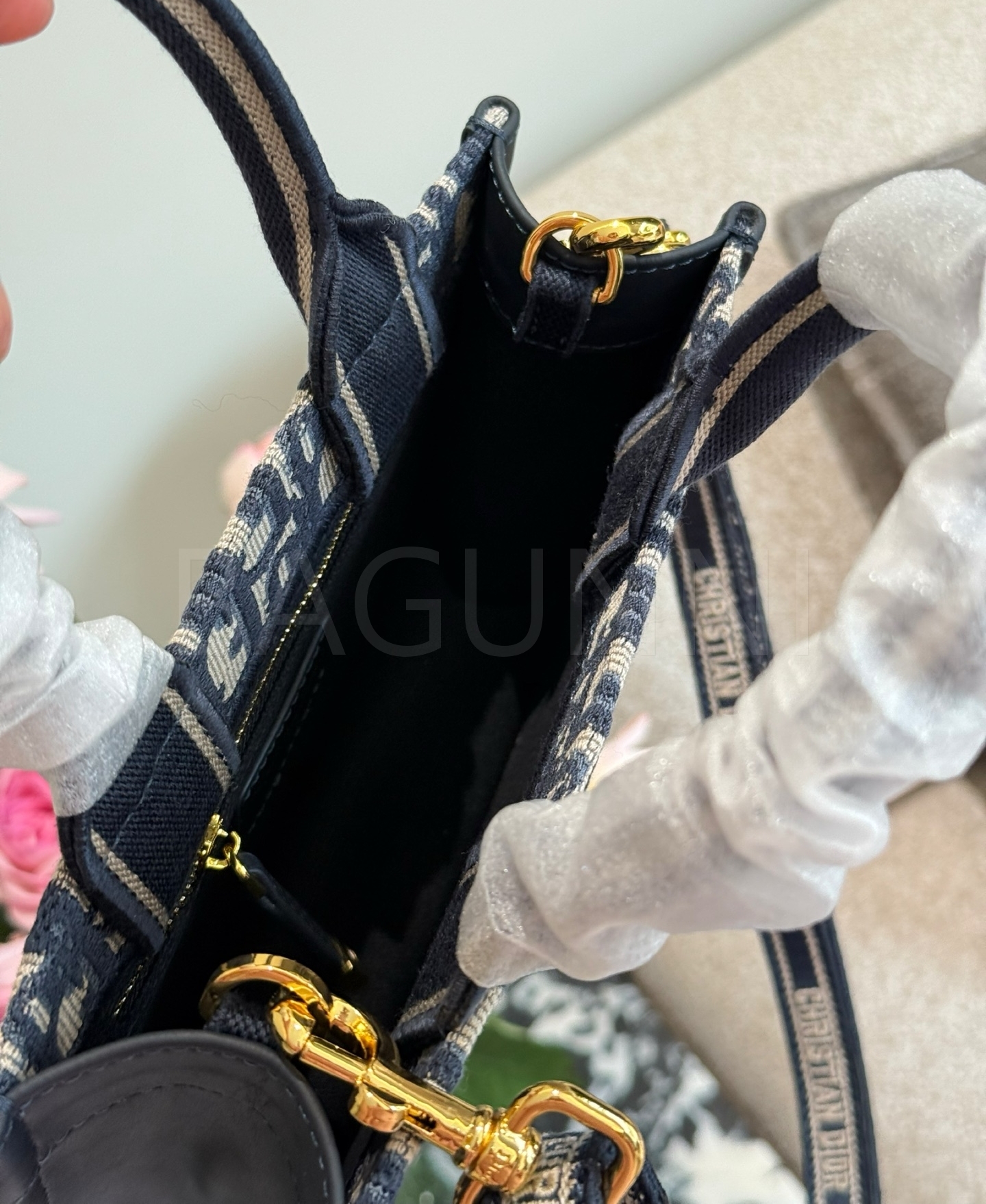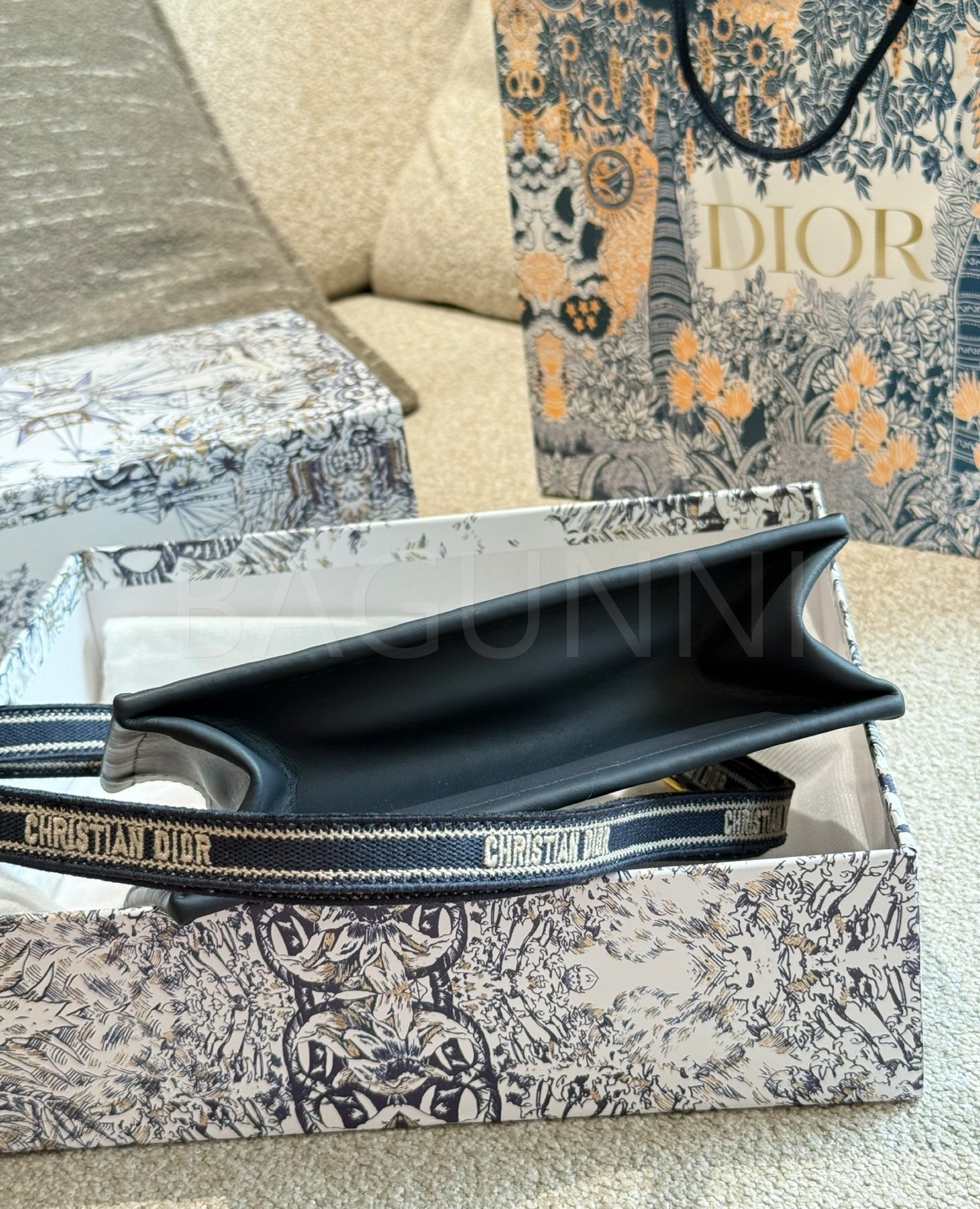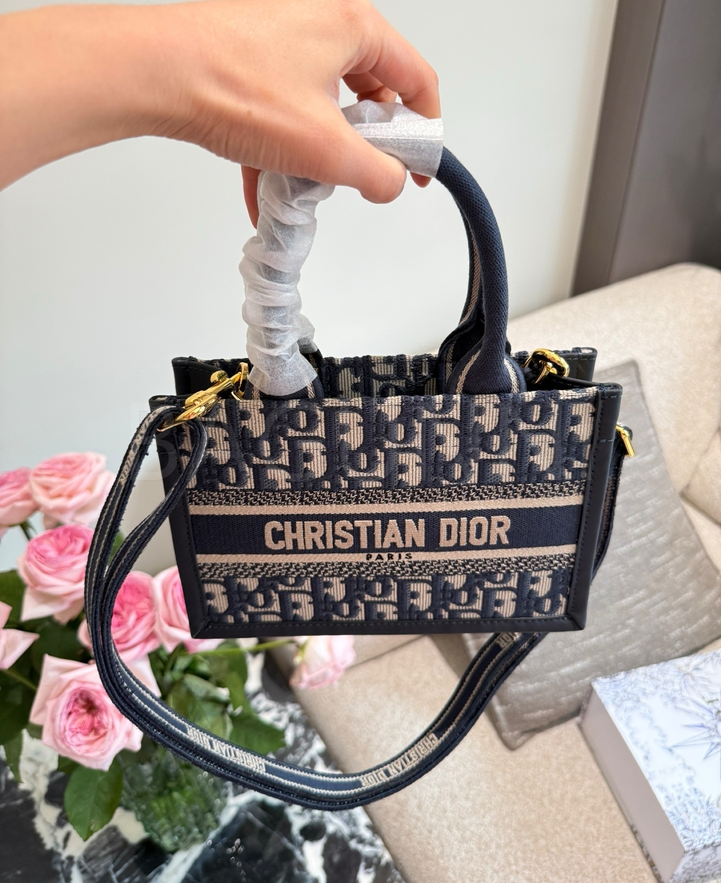 디올 북 토트입니다. 가죽 특유의 질감이 자연스럽게 살아 있으며 골드, 블루 톤이 어우러져 브랜드 특유의 분위기를 편하게 즐기기 좋습니다.