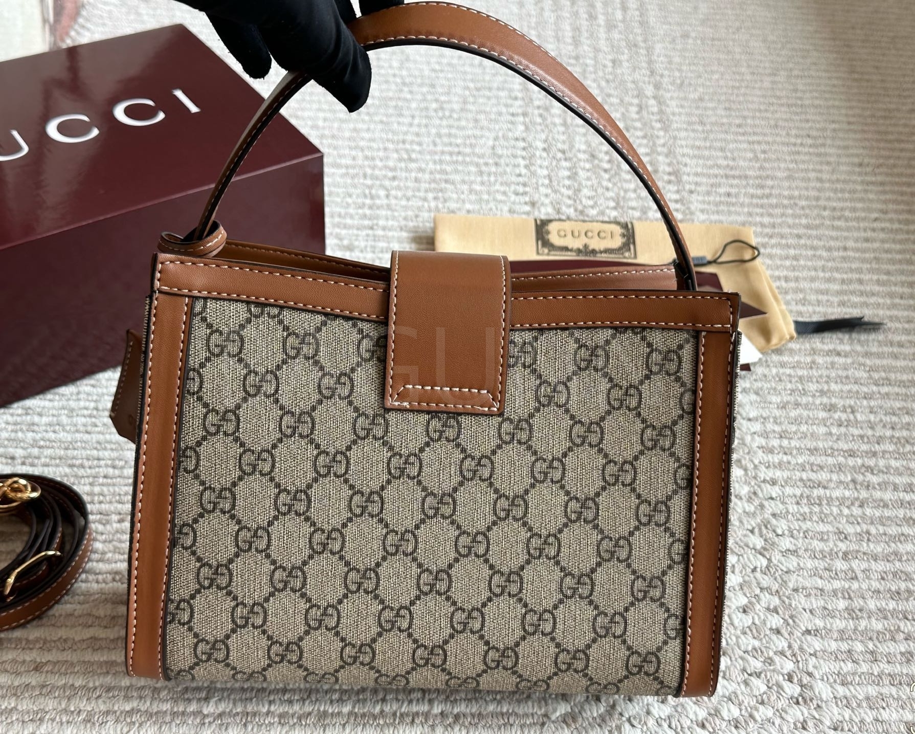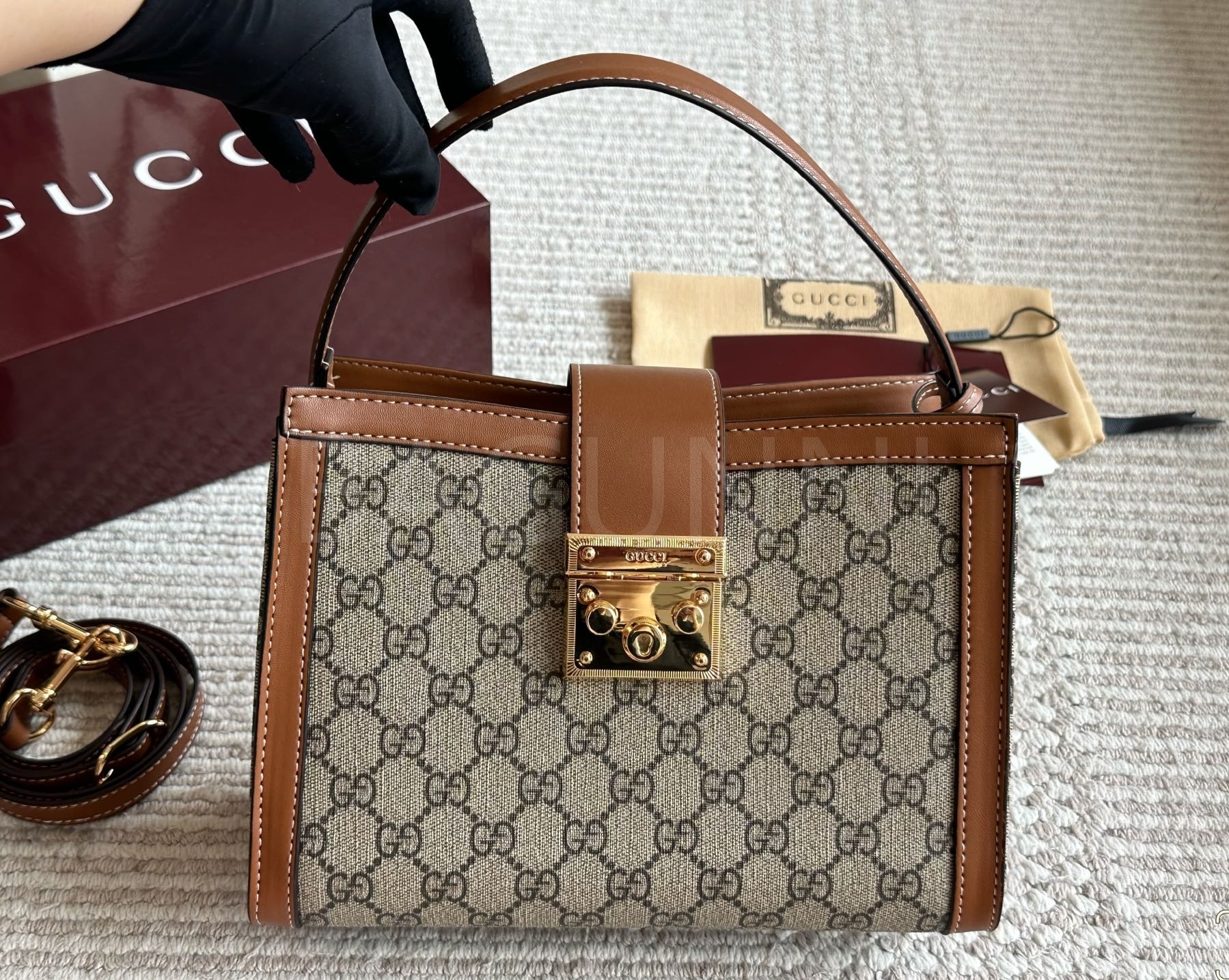 구찌 패드락 숄더백입니다. 가죽 특유의 질감이 자연스럽게 살아 있으며 브랜드 특유의 분위기를 편하게 즐기기 좋습니다.