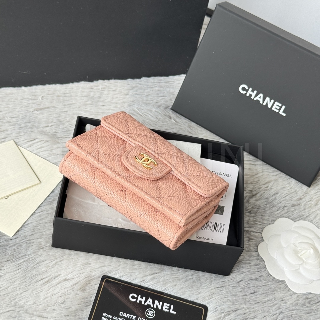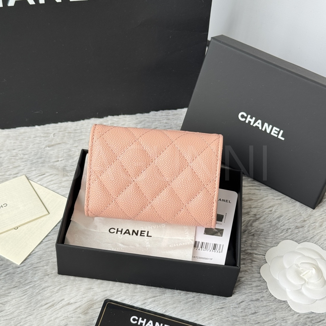 카프스킨의 질감이 돋보이는 샤넬 트리폴드 반지갑입니다.