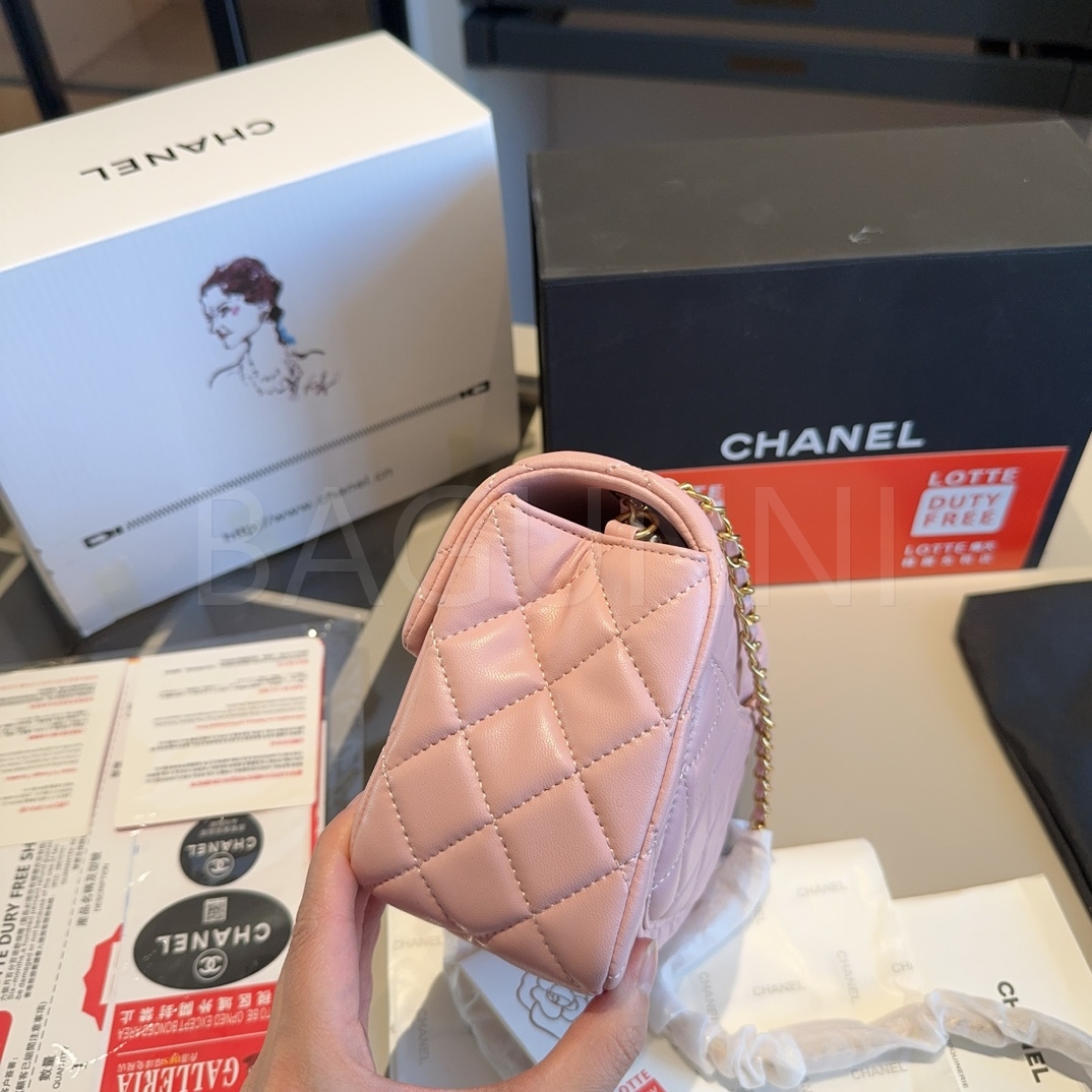 램스킨 특유의 매력이 돋보이는 샤넬 금볼 스퀘어 플랩 백입니다.