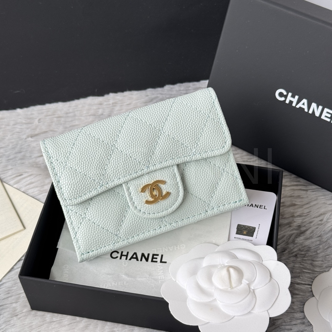 카프스킨의 질감이 돋보이는 샤넬 트리폴드 반지갑입니다.