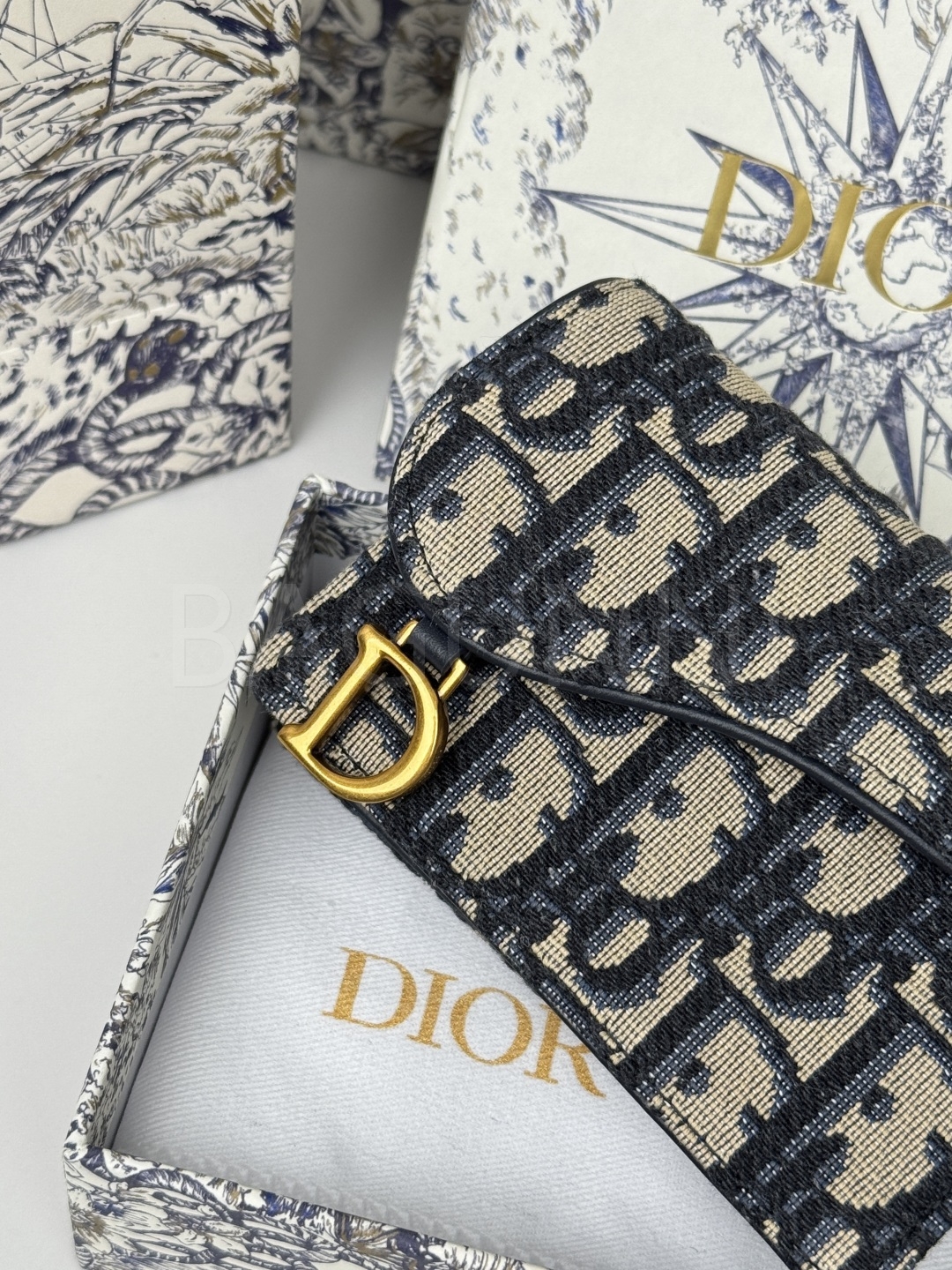 오블리크 자카드의 질감이 돋보이는 디올 플랩 카드지갑입니다.