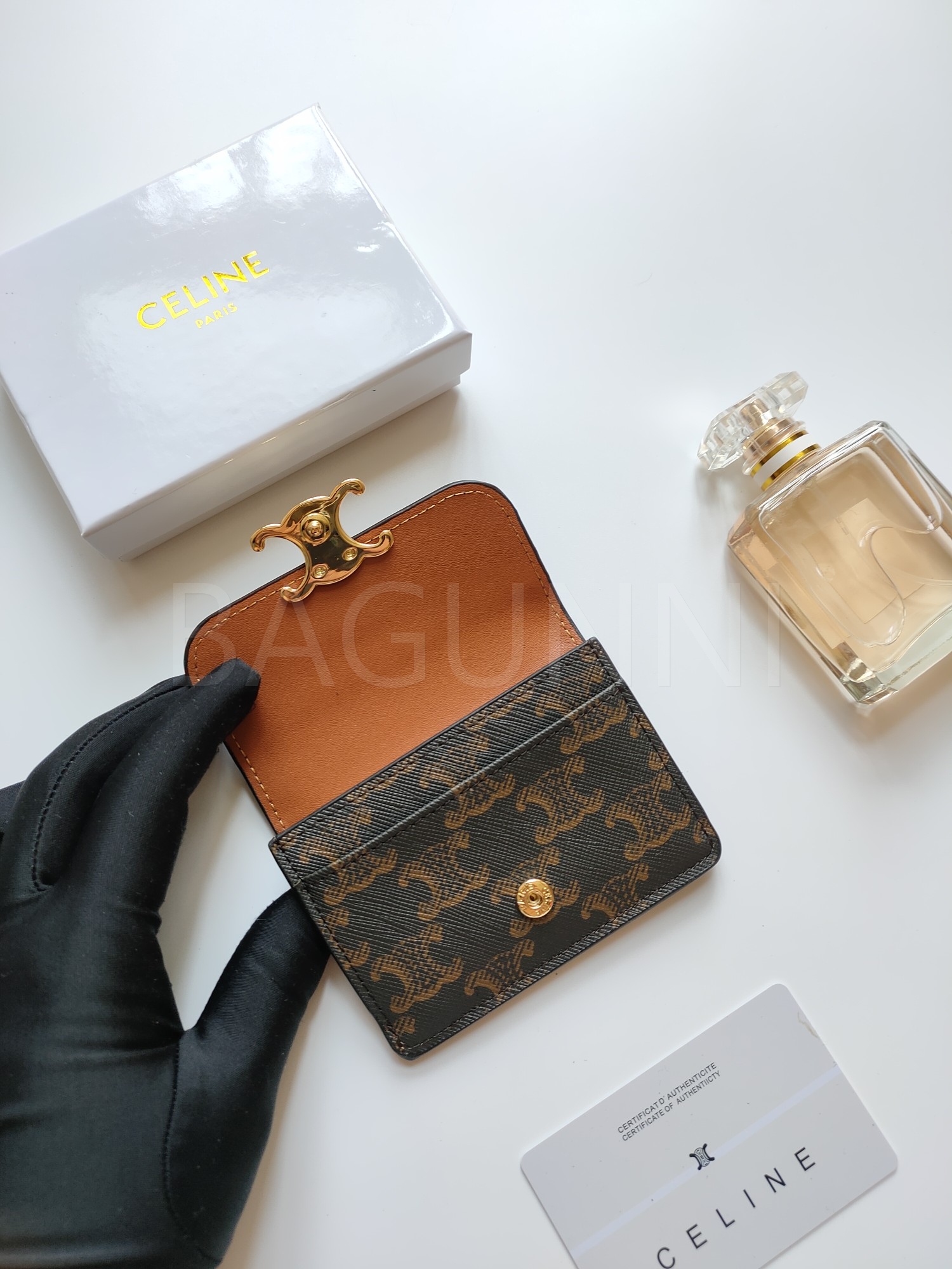 셀린느 특유의 무드가 자연스럽게 살아있는 트리옹프 플랩 카드지갑입니다.