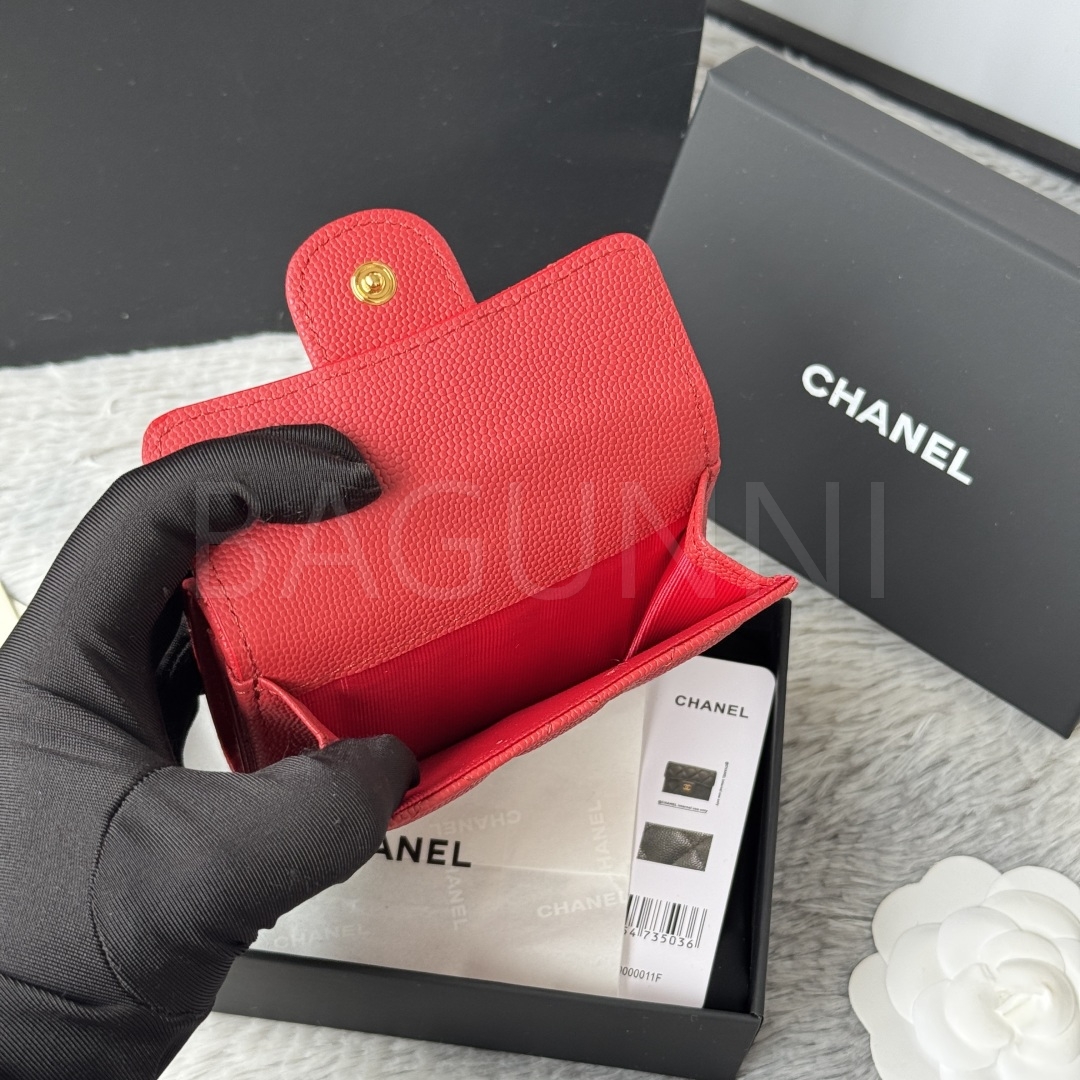 카프스킨의 질감이 돋보이는 샤넬 트리폴드 반지갑입니다.