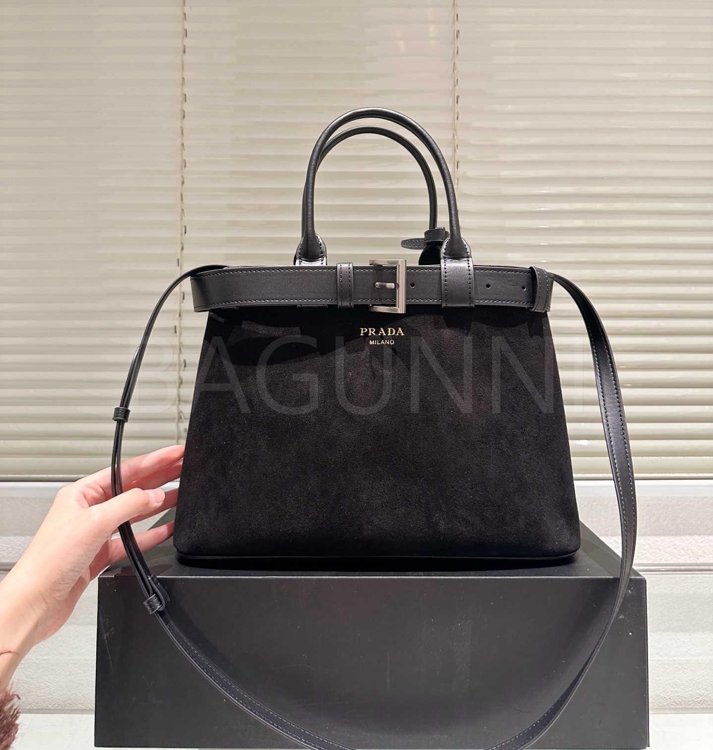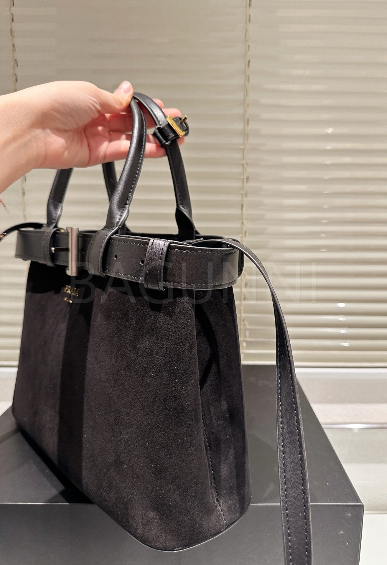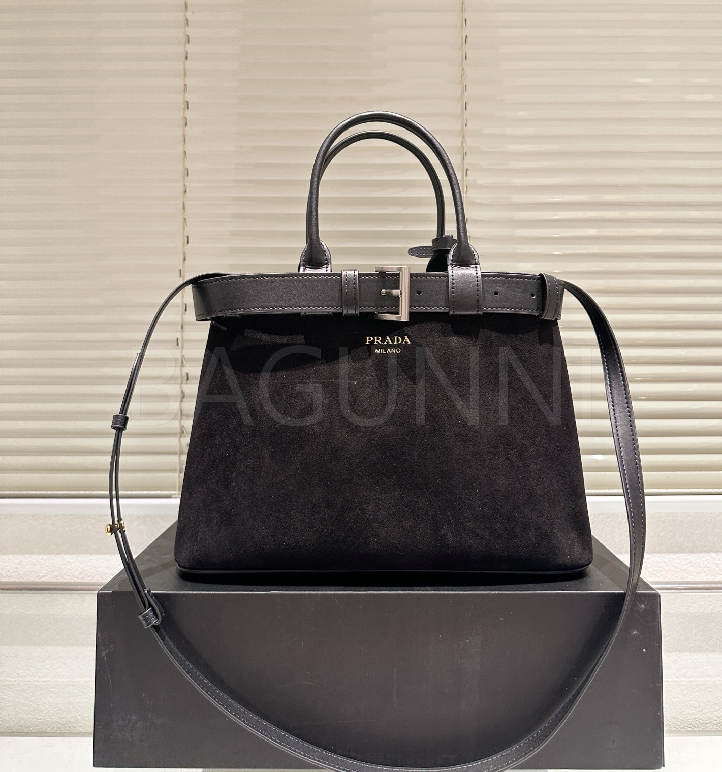 프라다 스웨이드 토트백은 우아한 분위기를 담은 아이템입니다.