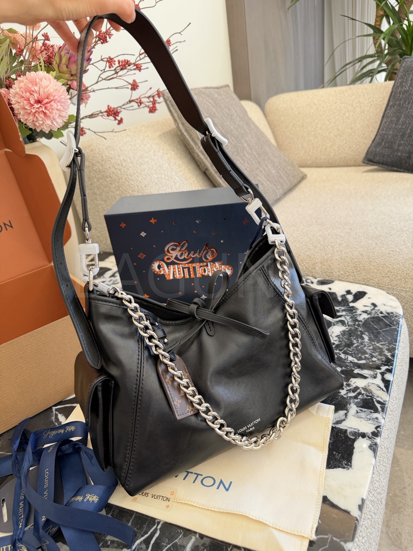 루이비통 캐리올 드로스트링 버킷 백은 미니멀한 감성을 담은 아이템입니다.