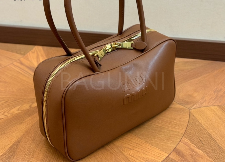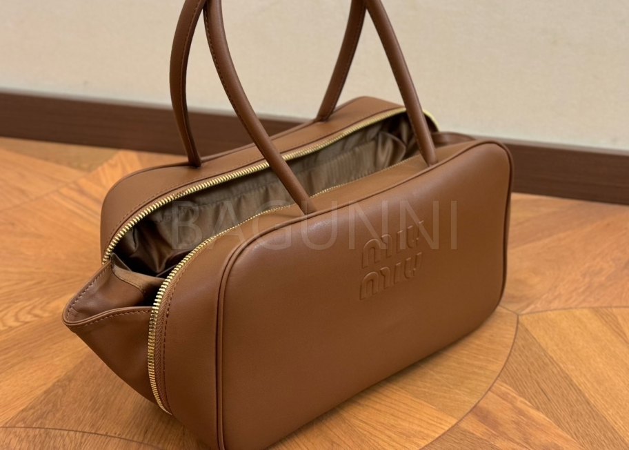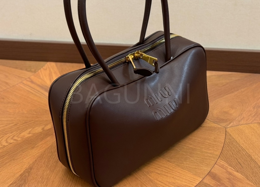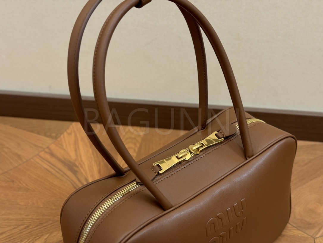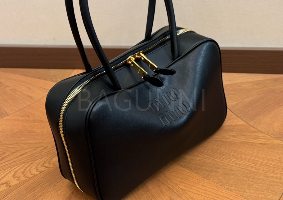 미우미우 레더 보스턴백입니다. 가죽 특유의 질감이 자연스럽게 살아 있으며 브랜드 특유의 분위기를 편하게 즐기기 좋습니다.