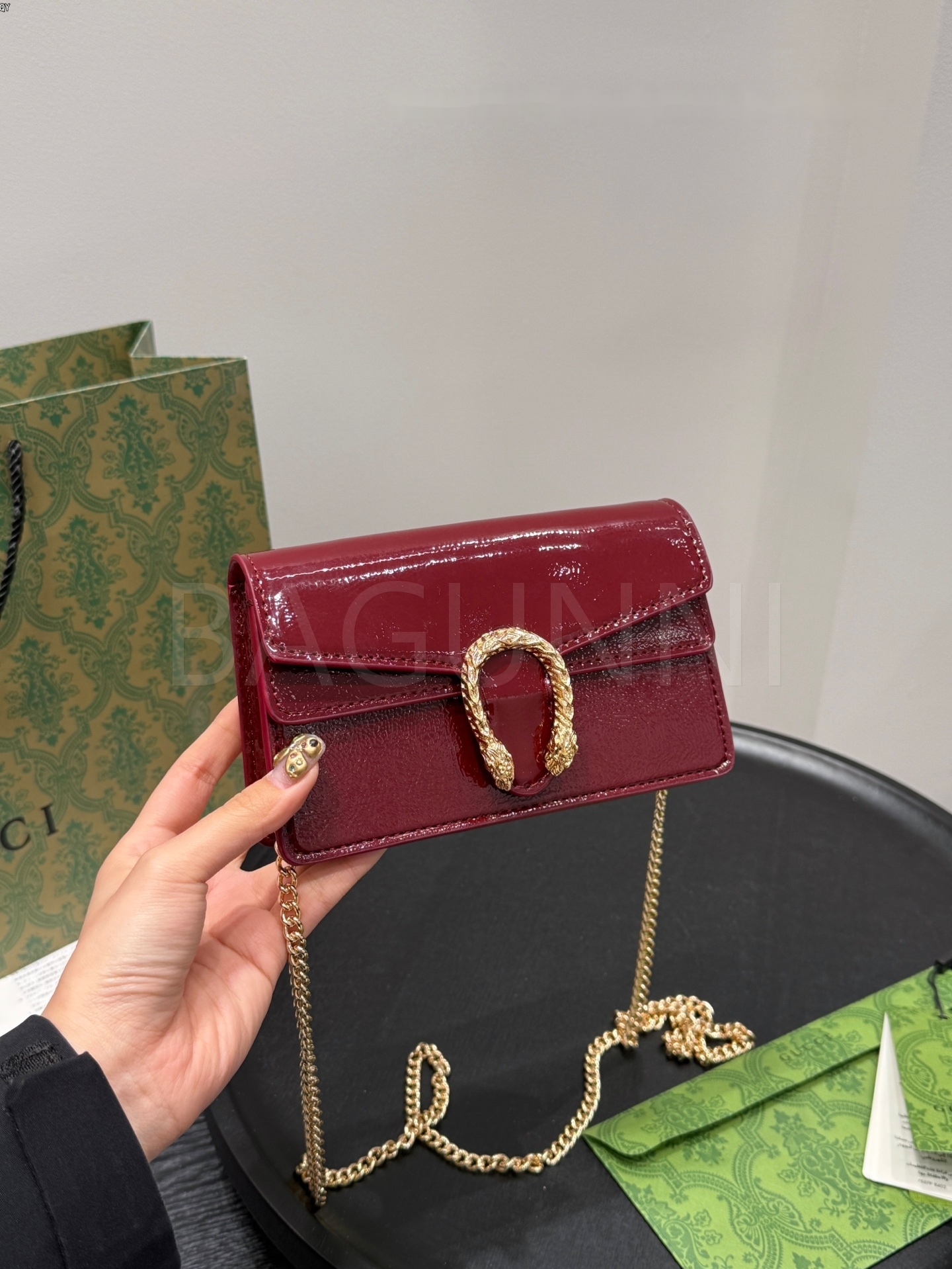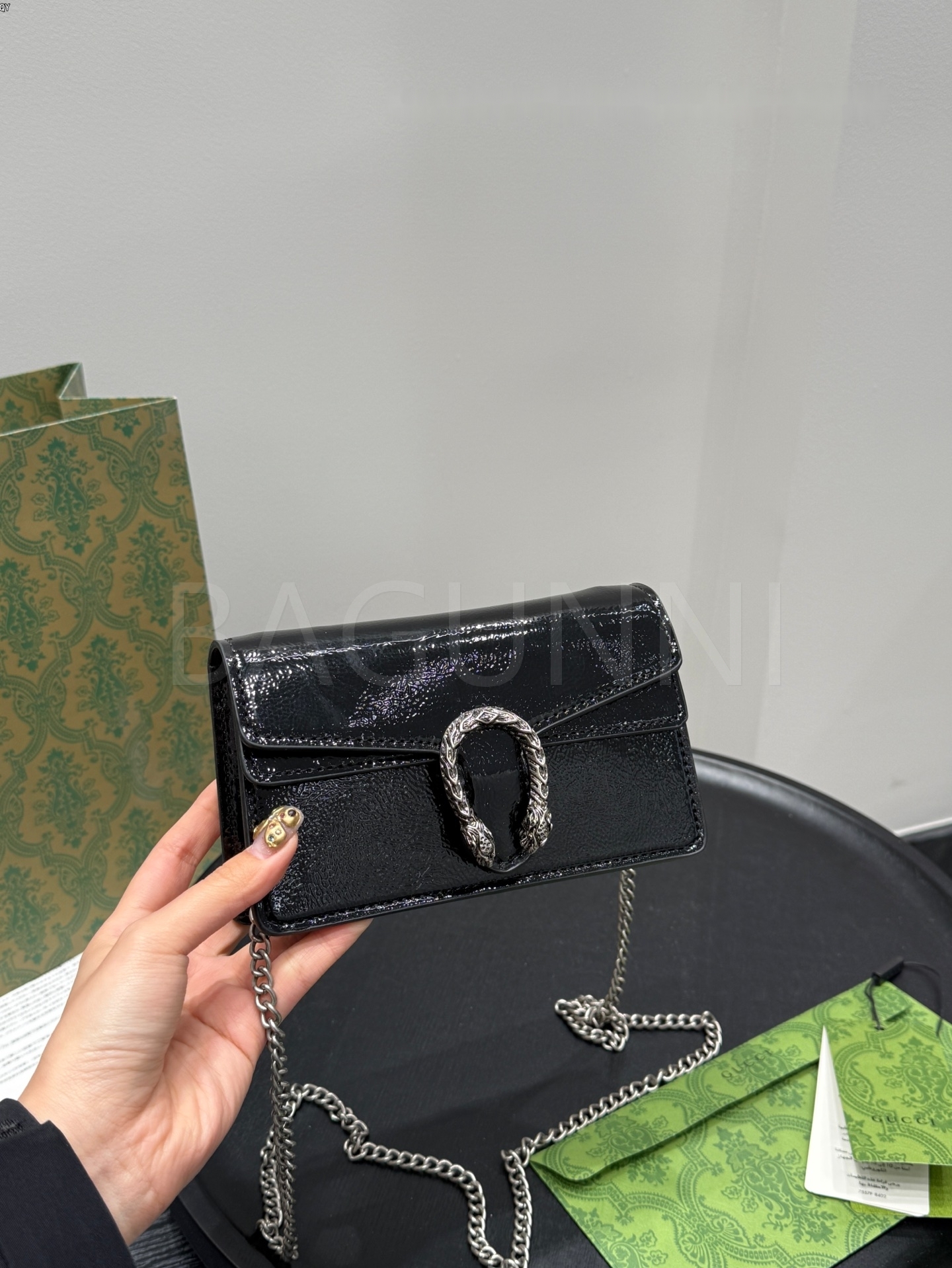 구찌 디오니서스 체인백입니다. 페이턴트 가죽 특유의 질감이 자연스럽게 살아 있으며 브랜드 특유의 분위기를 편하게 즐기기 좋습니다.